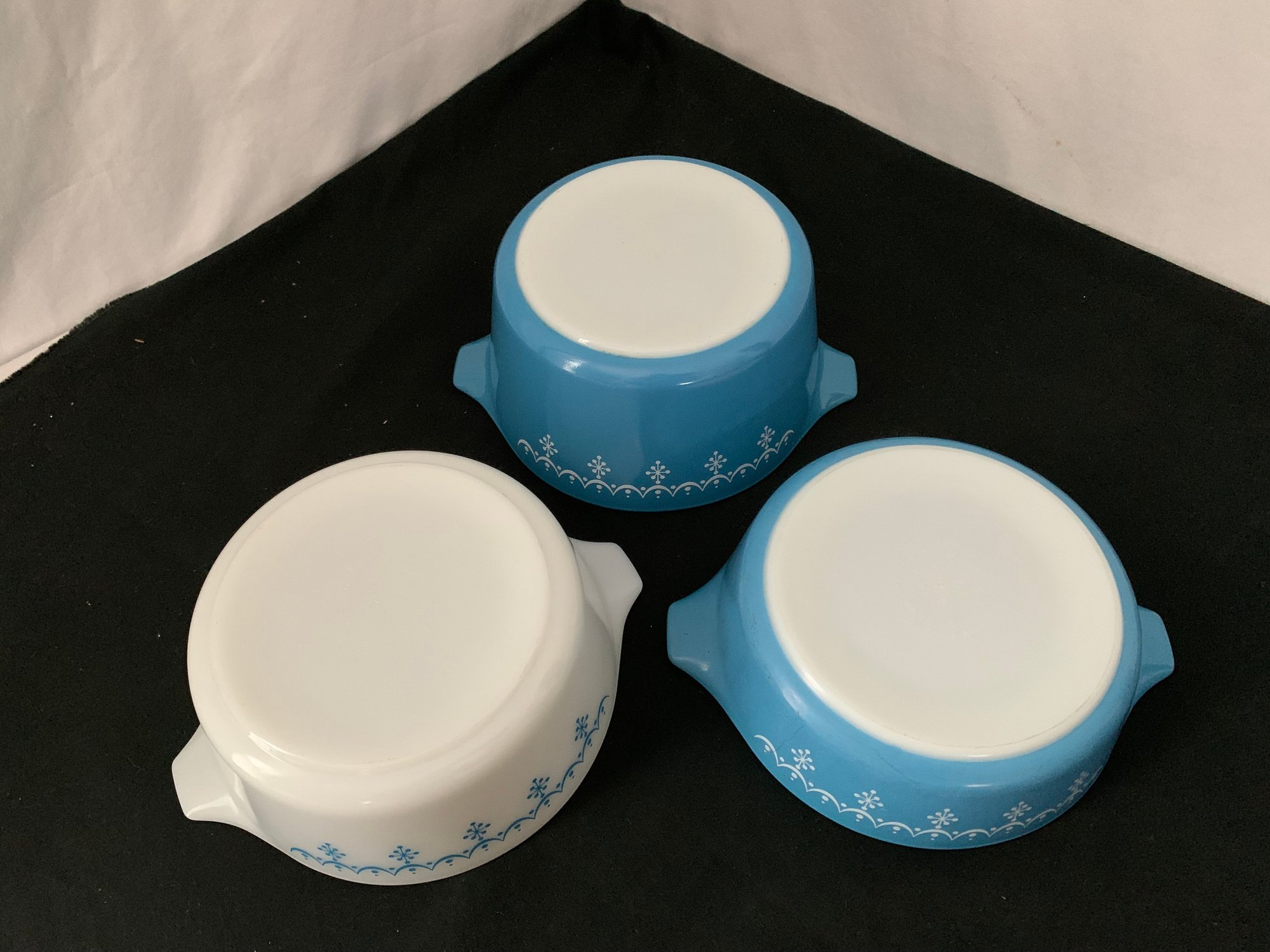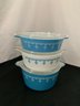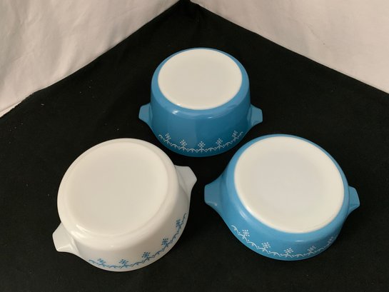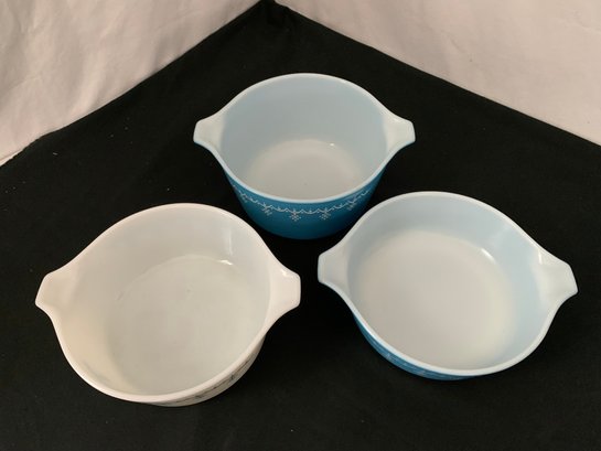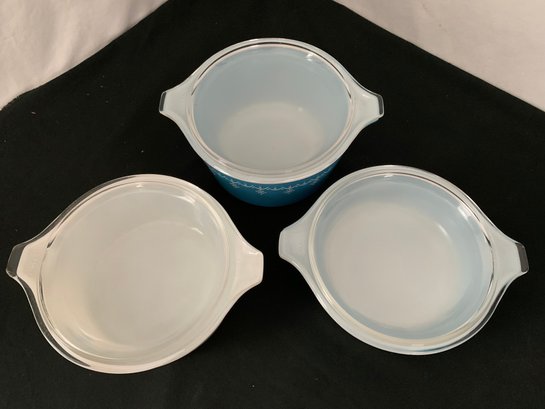 Notes: Pyrex Snowflake Blue round casserole set is pre-owned showing light wear commensurate with age & use and have no apparent identifiable flaws. Please review pictures.