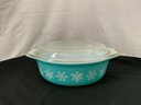 Notes: Pyrex Snowflake/Turquoise 043 casserole is pre-owned showing light wear commensurate with age & use with no apparent flaws. Please review pictures.
