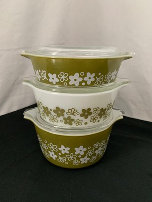 Notes: Pyrex Spring Blossom round casserole set is pre-owned showing light wear commensurate with age & use with no apparent flaws. Please review pictures.