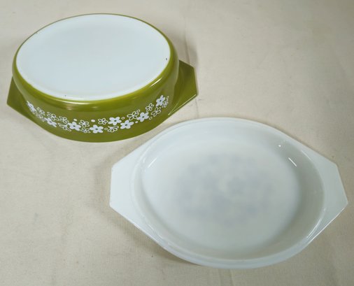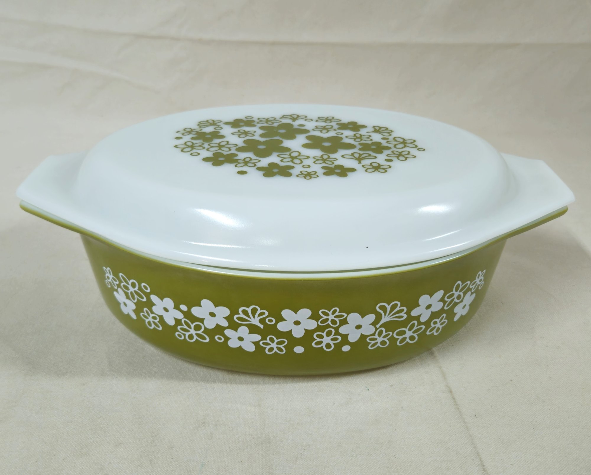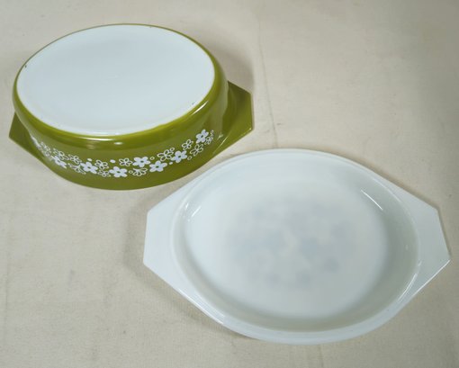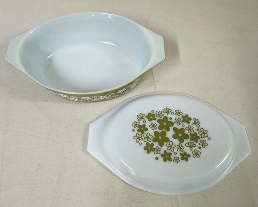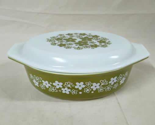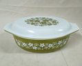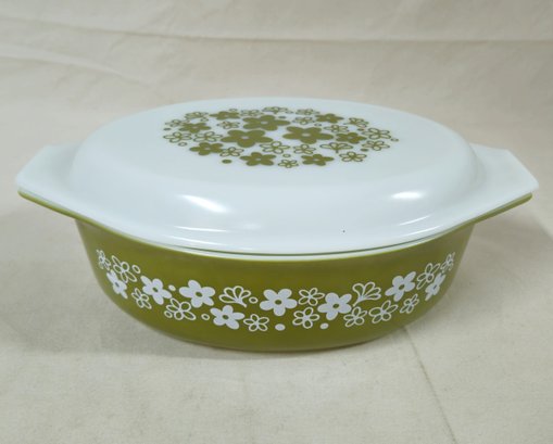 Pyrex Spring Blossom Green I/Crazy Daisy 2 1/2qt.- 045 casserole with lid. Produced by Corning Glass Works.