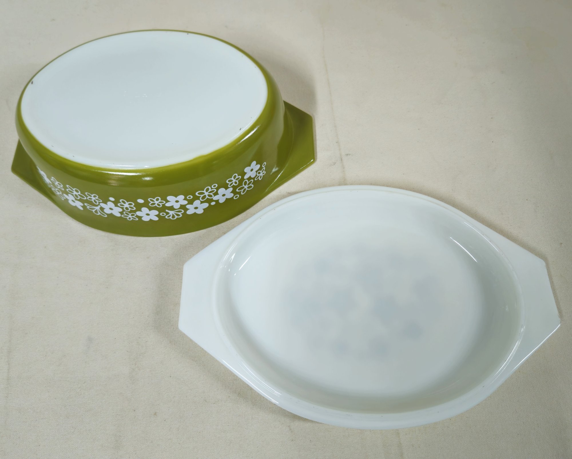 Notes: Pyrex Spring Blossom Green I/Crazy Daisy Casserole with Lid is pre-owned showing minimal signs of wear commensurate with age & use and has no major apparent identifiable blemishes or flaws. Please review pictures.