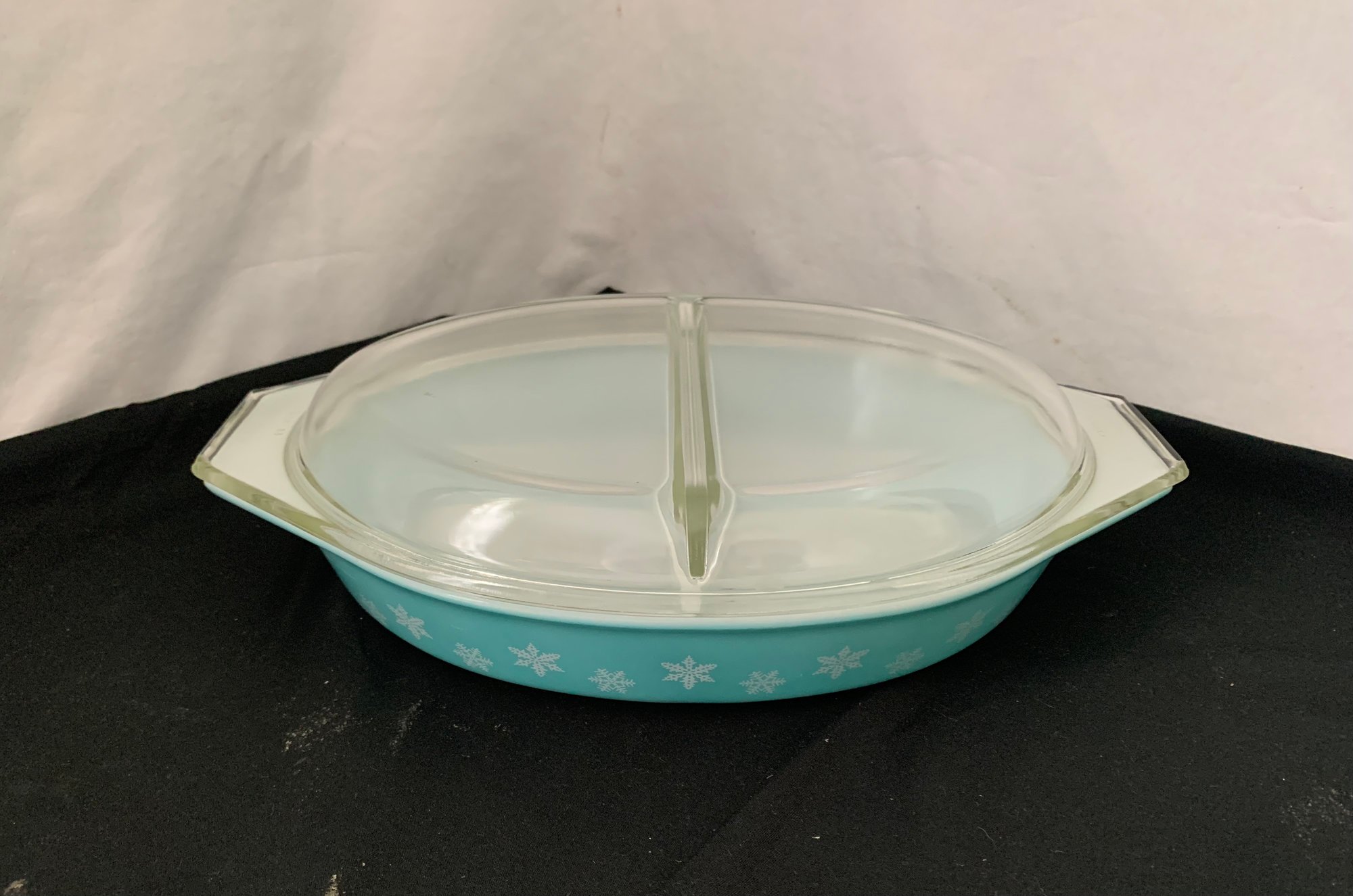 Notes: Pyrex Snowflake divided dish w/lid is pre-owned showing light wear commensurate with age & use with no apparent flaws. Please review pictures.