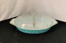 063 - 1 1/2 Qt oval divided dish, white snowflake on turquoise w/ lid 963 divided