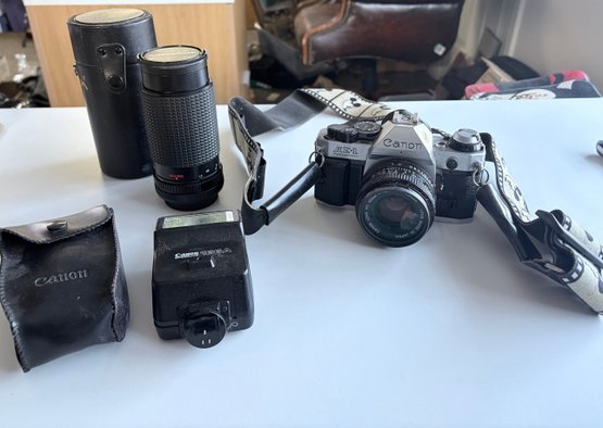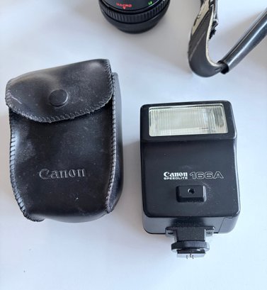 Canon AE-1 35mm SLR Film Camera, Canon Speedlite 166A Flash, Marco Zoom Lens