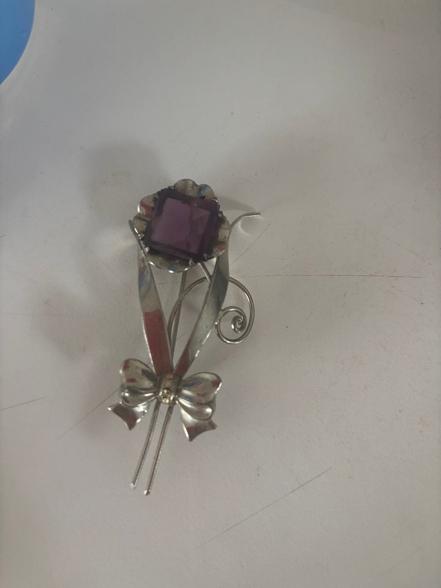 Vintage sterling silver floral brooch with large purple amethyst stone believed to be from 1940-50
