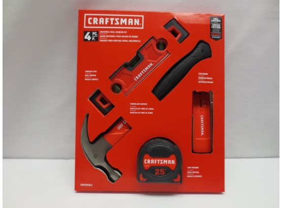 4 piece Craftsman tools for wall hanging projects. Includes hammer, level, measuring tape, and stud finder.