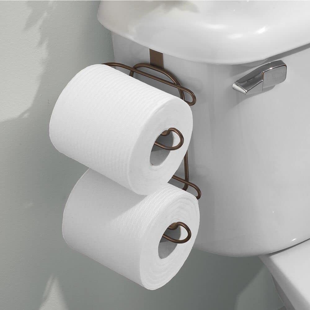 mDesign Metal Compact Hanging Over The Tank Toilet Tissue Paper Roll Holder and Dispenser for Bathroom Storage - Holds 1 Extra Roll - Space Saving Design - Bronze