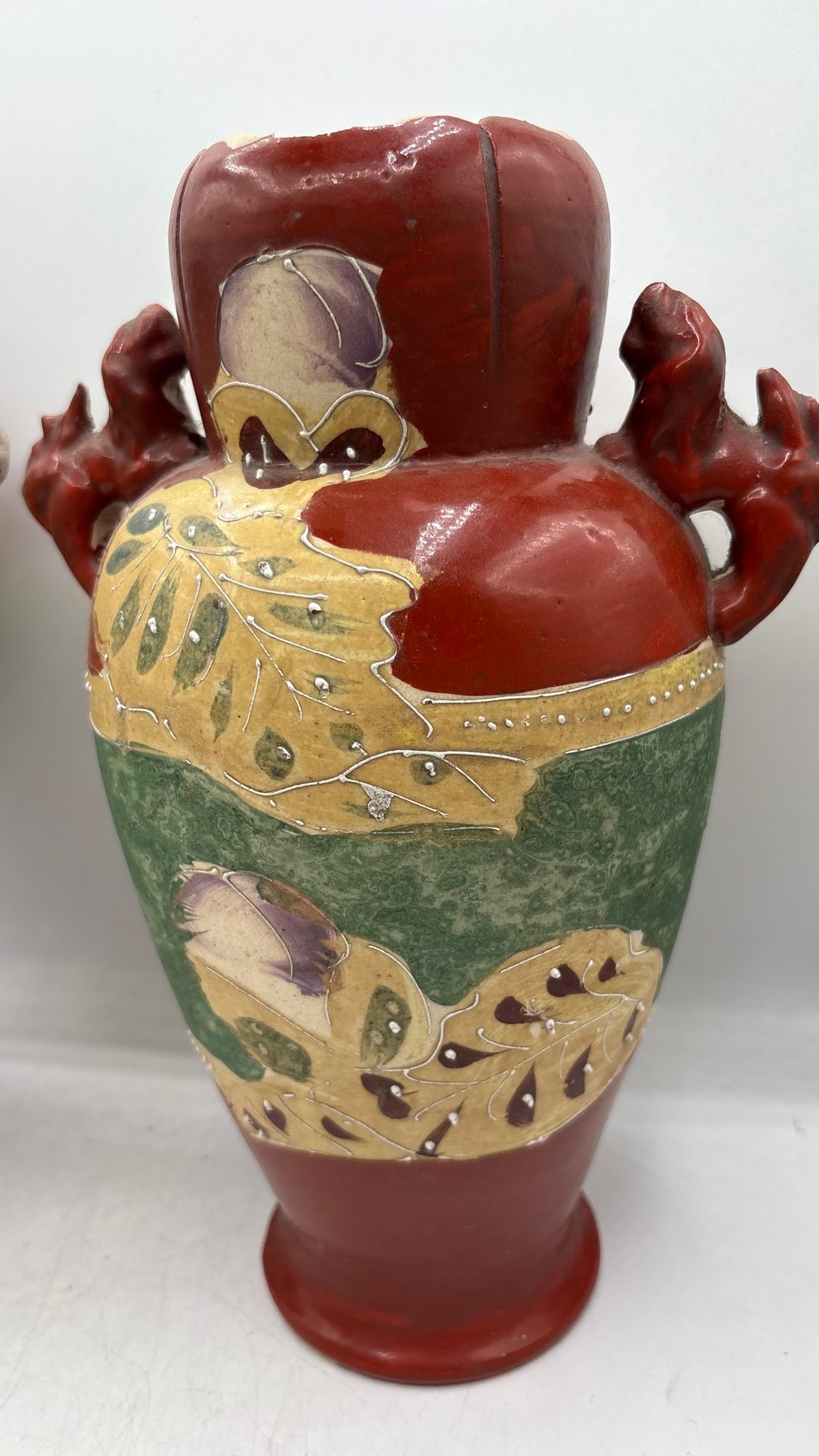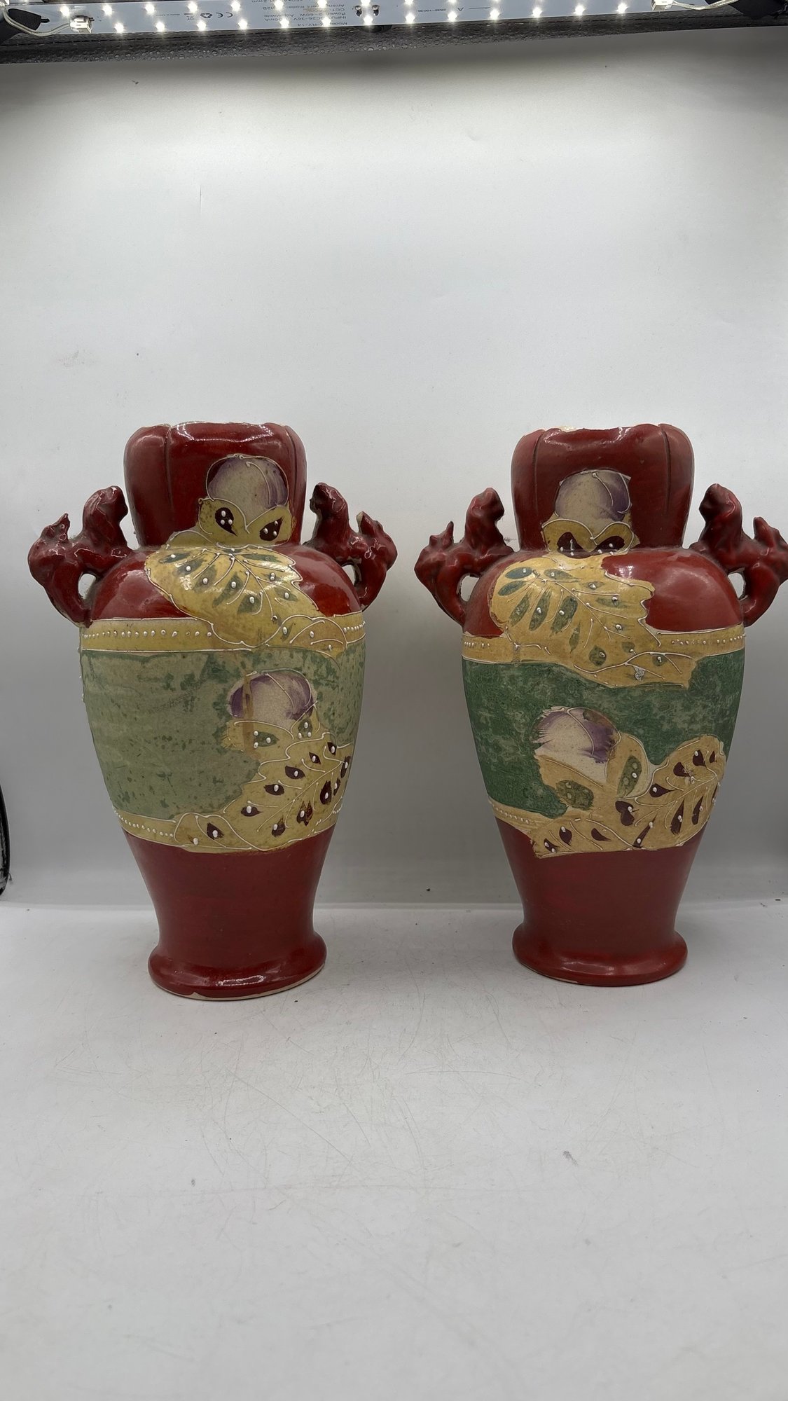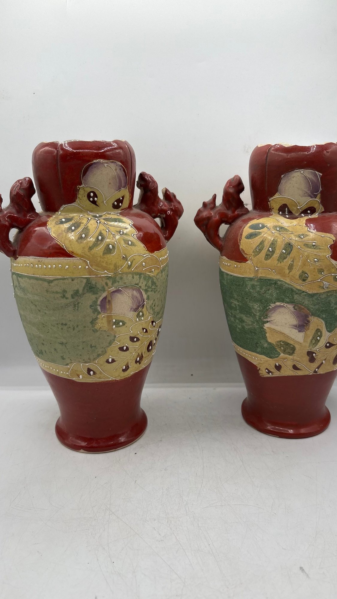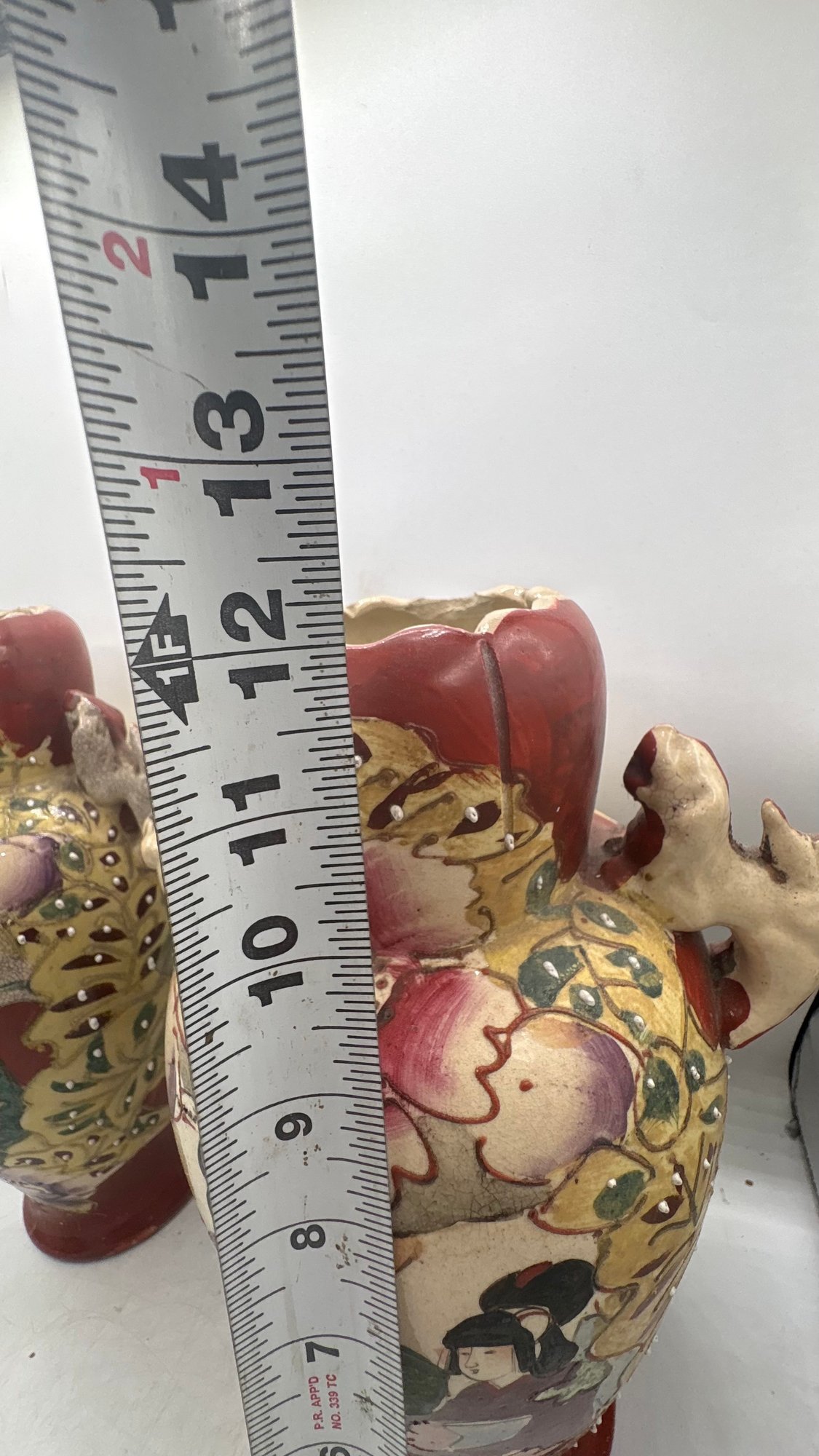 Beautiful pair of vintage Asian / Oriental ceramic vases featuring detailed hand-painted decoration. The vases display traditional Asian artistic motifs and craftsmanship, making them attractive decorative pieces for collectors of Asian décor and ceramics.