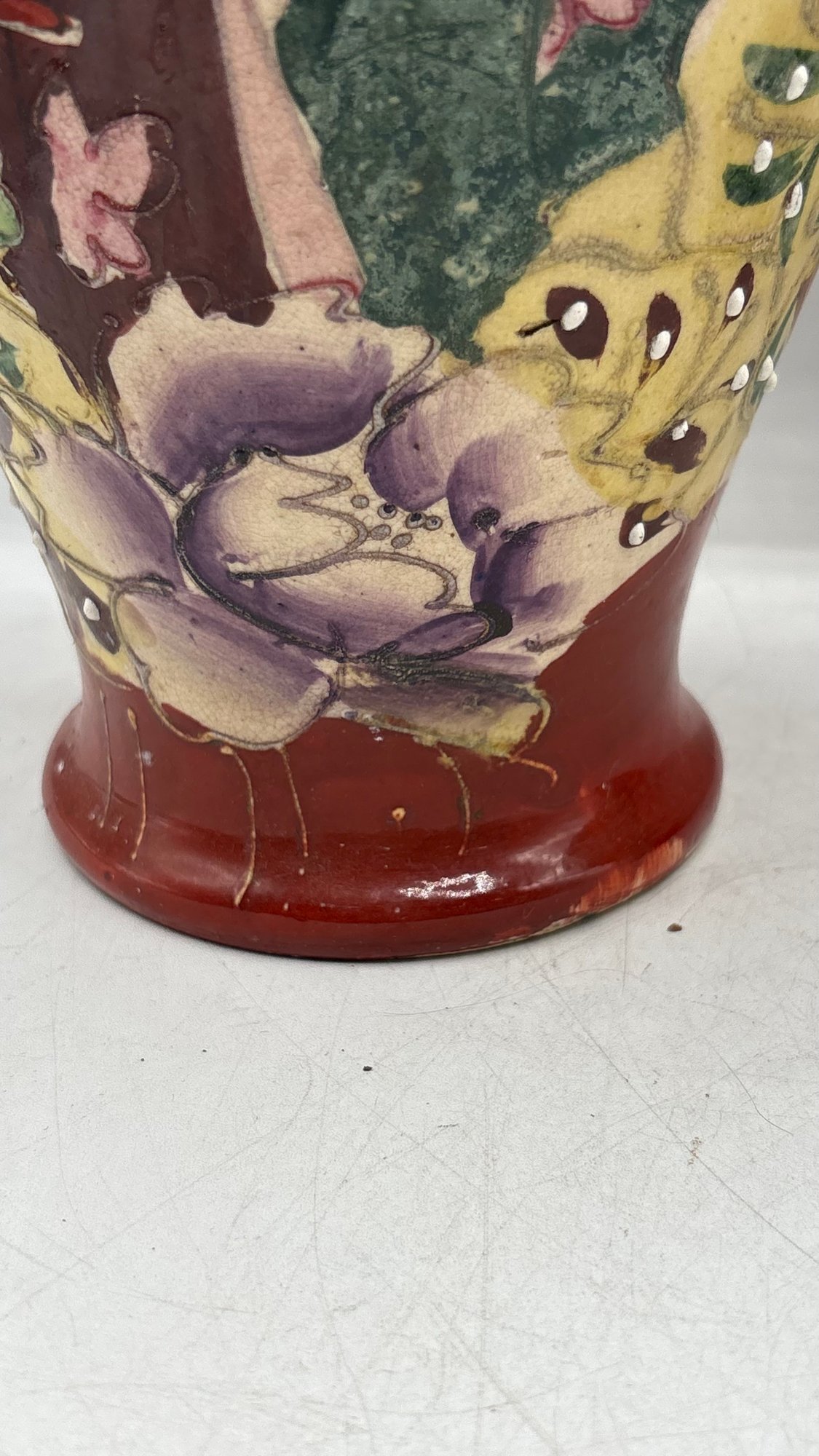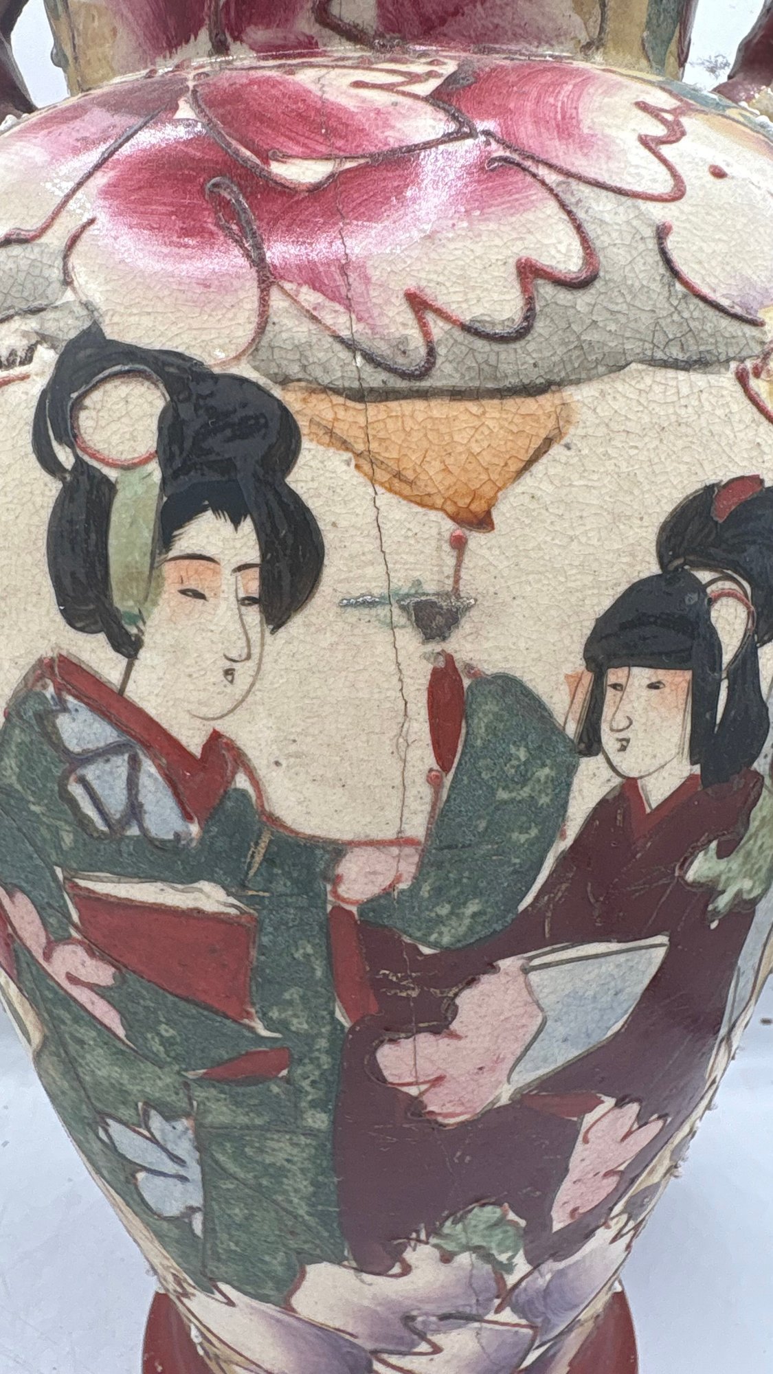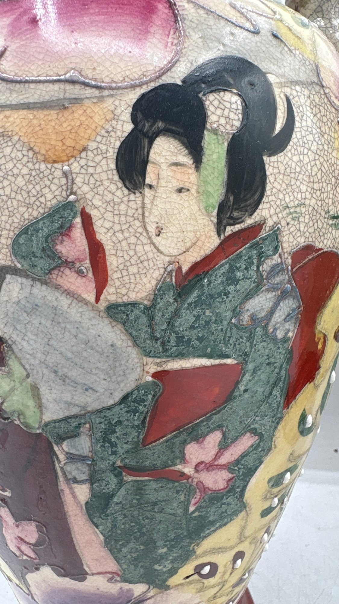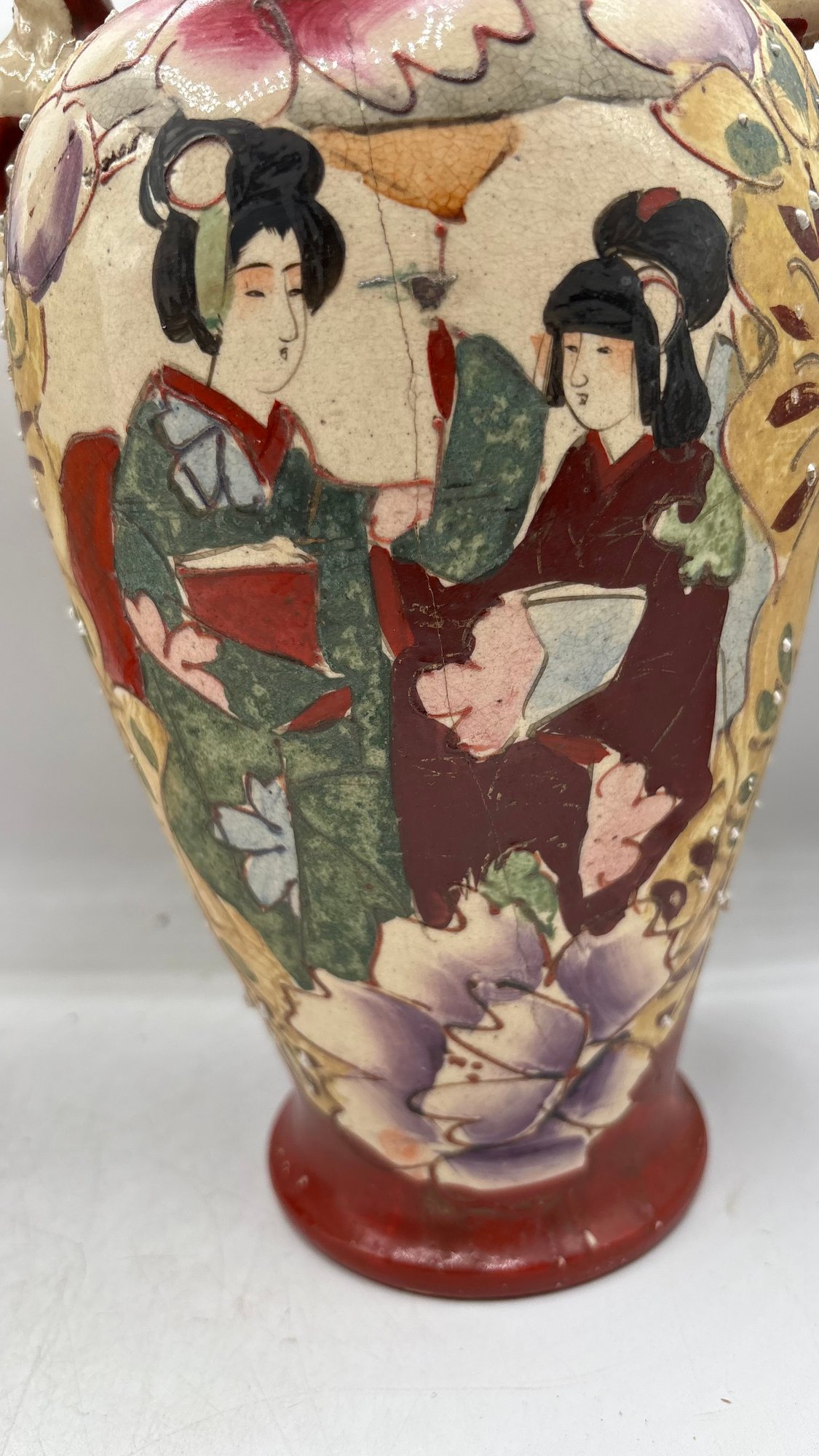 Beautiful pair of vintage Asian / Oriental ceramic vases featuring detailed hand-painted decoration. The vases display traditional Asian artistic motifs and craftsmanship, making them attractive decorative pieces for collectors of Asian décor and ceramics.
