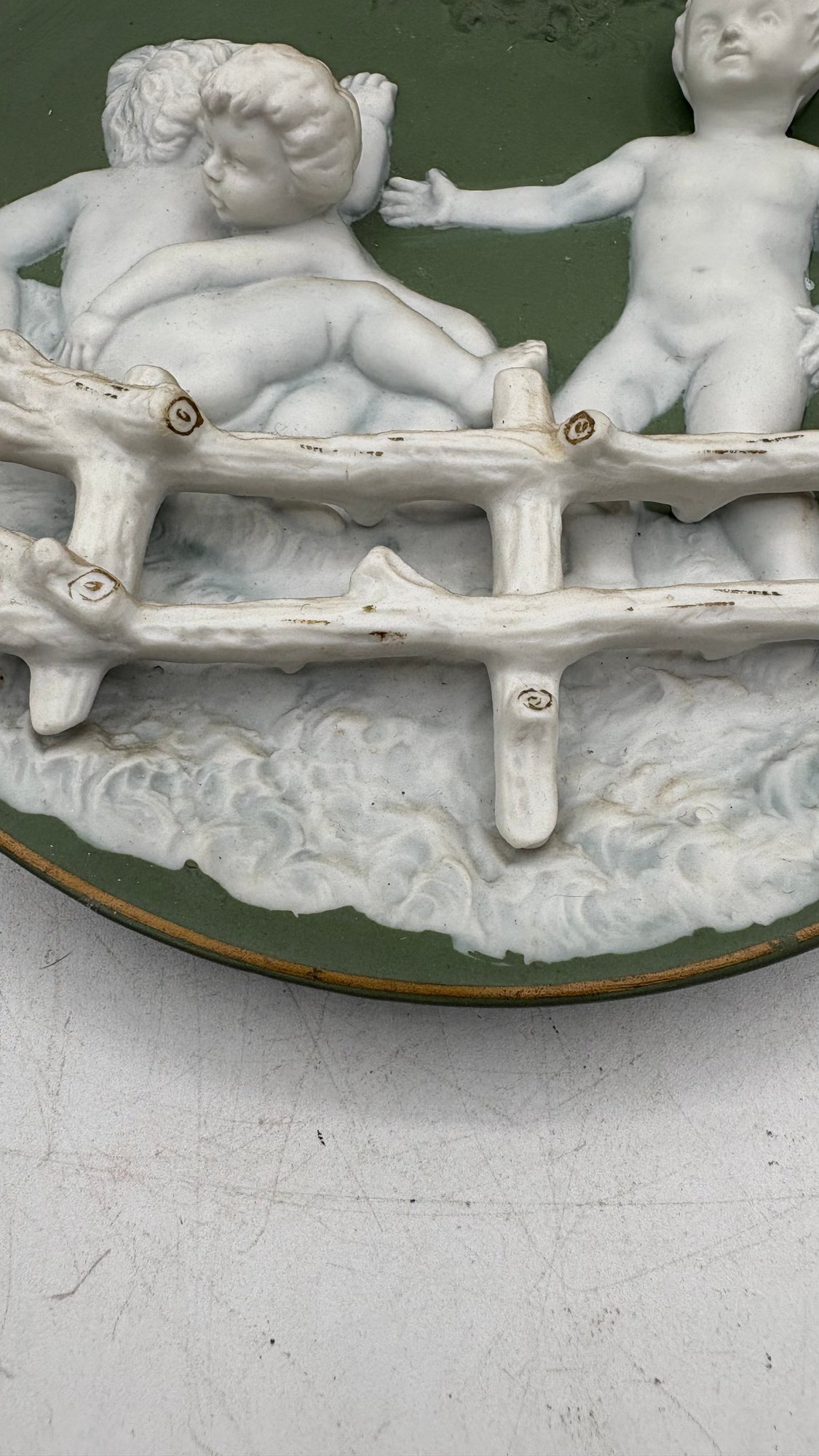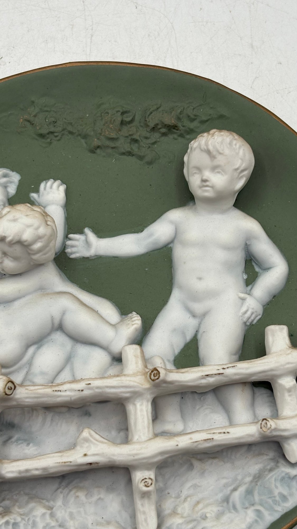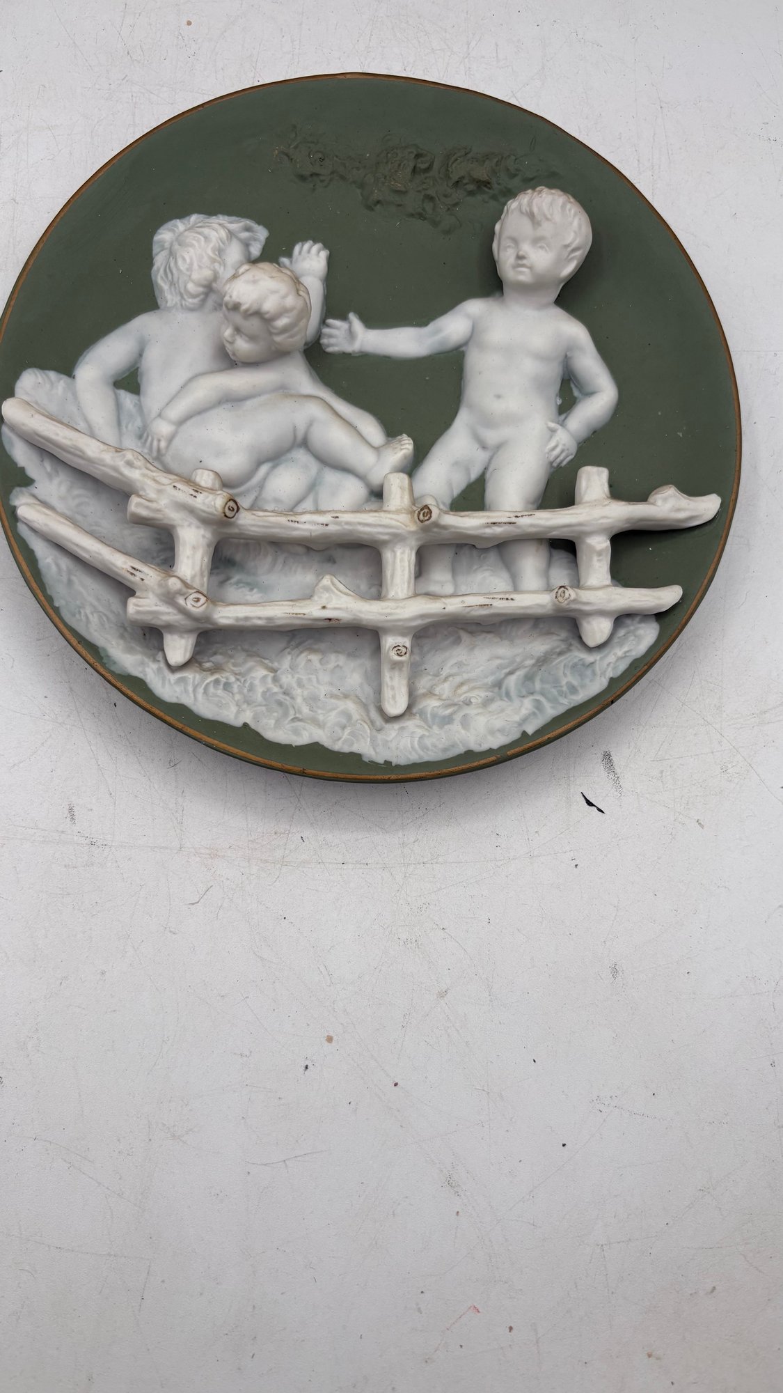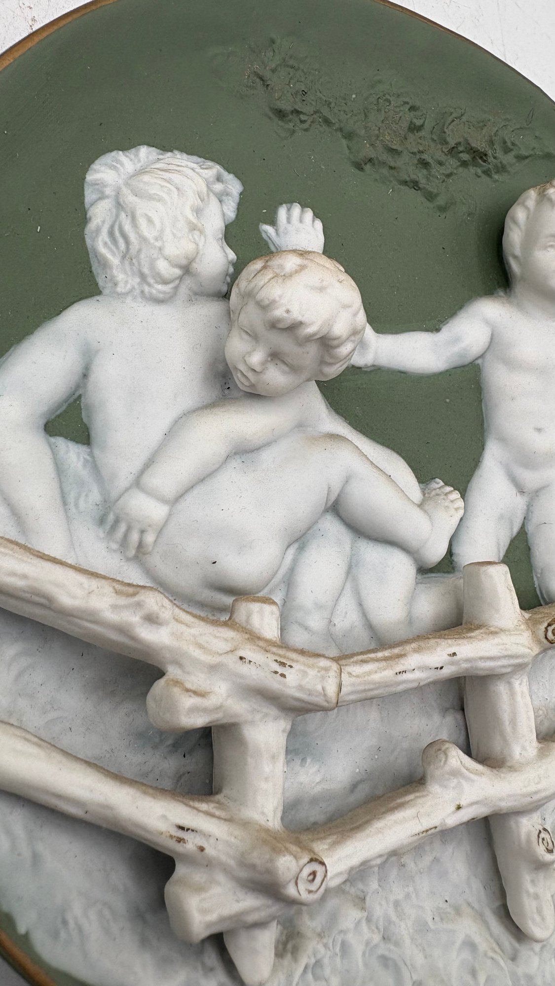 Bring timeless charm to your home with this antique bisque porcelain wall plaque featuring two sweet cherub children (putti) in delicate relief.