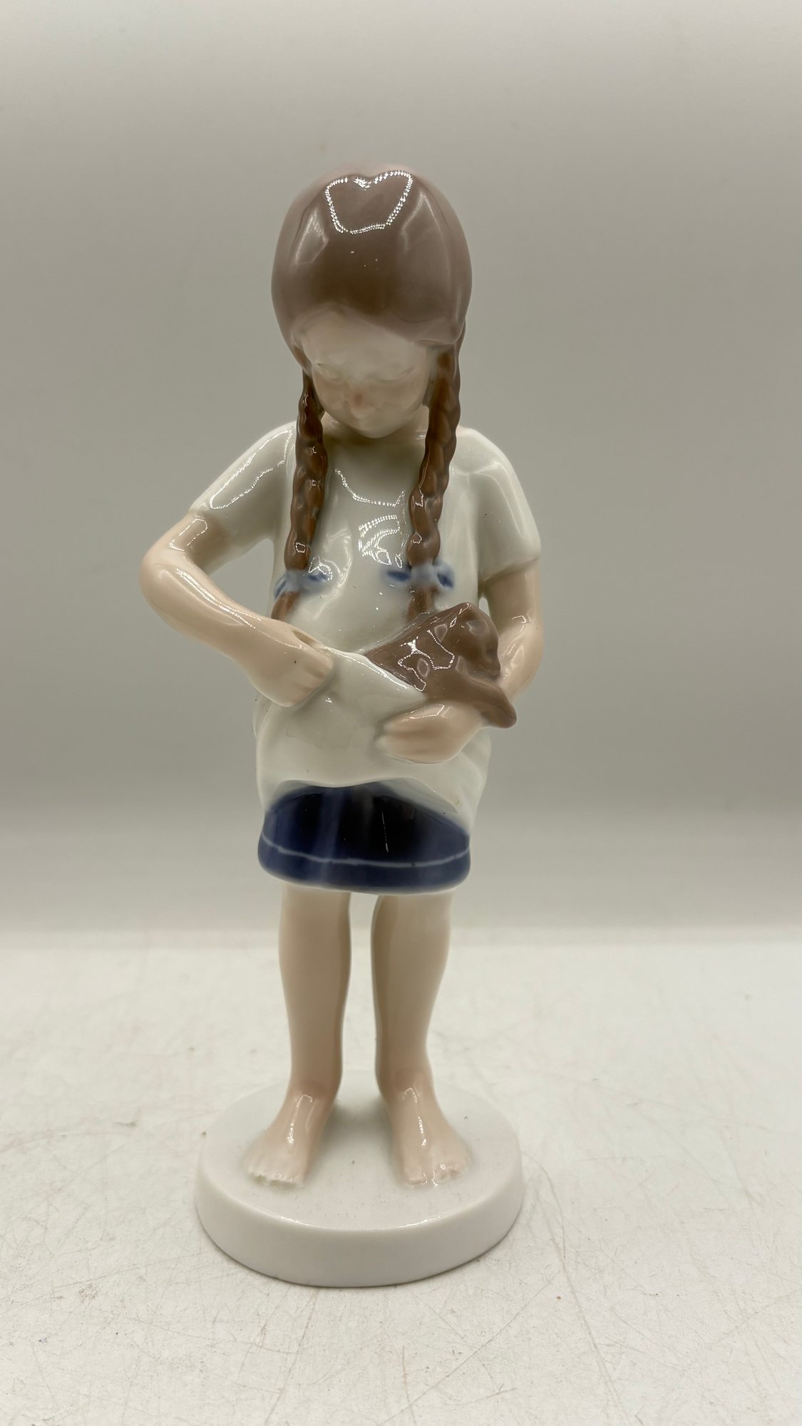 Charming vintage Bing & Grøndahl porcelain figurine featuring a young girl gently holding a cat in her arms. Beautiful hand-painted details and classic Danish craftsmanship.