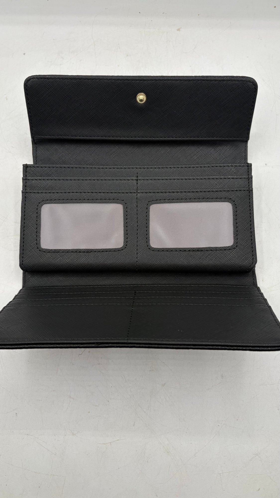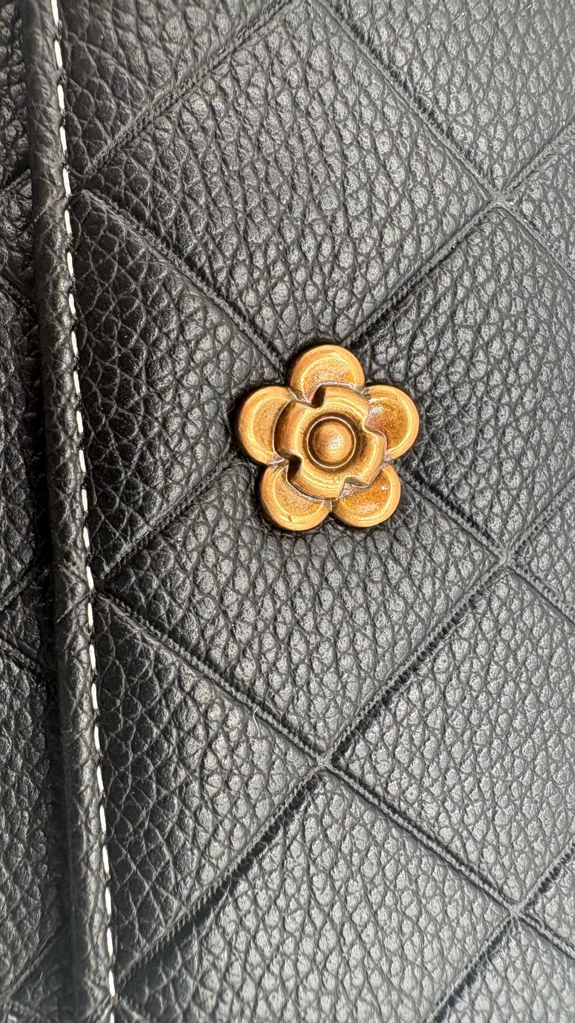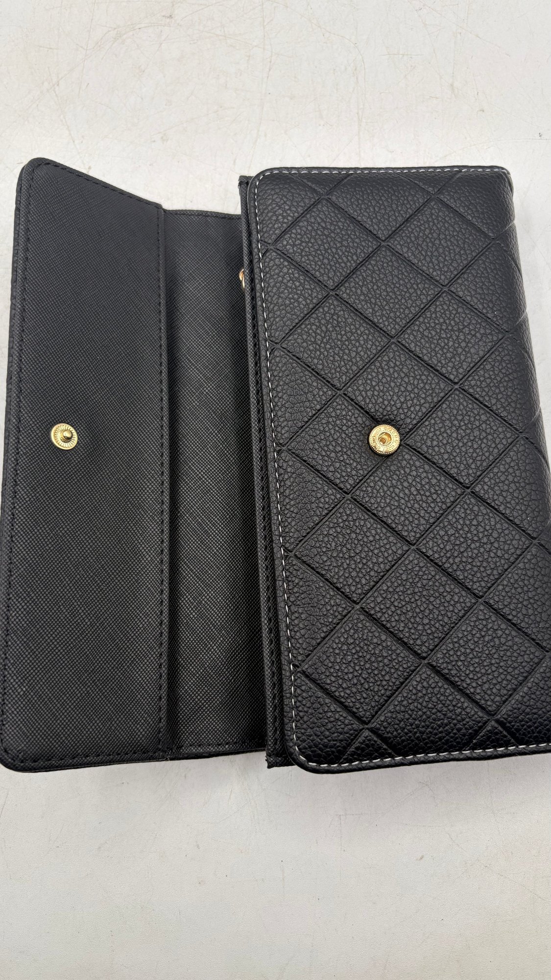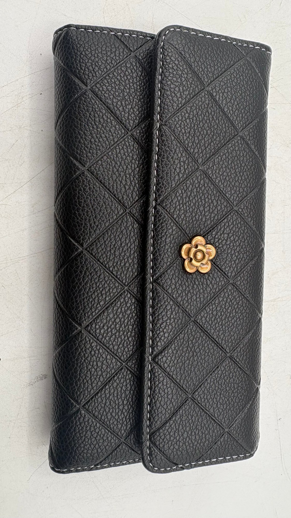 Black quilted leather wallet/clutch featuring a gold-tone floral snap closure. Made from genuine leather with a textured finish. Interior includes multiple card slots, ID windows, and a zippered coin compartment.