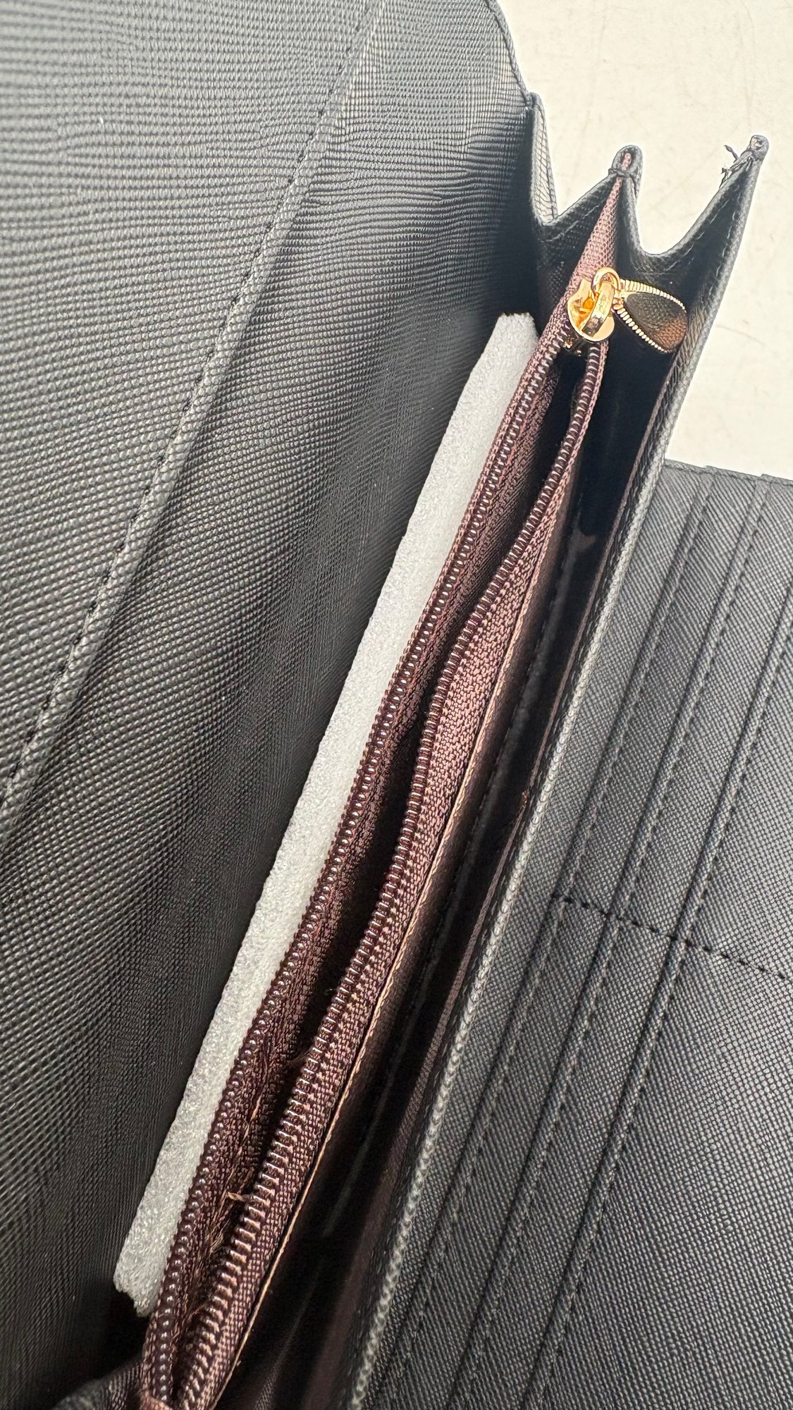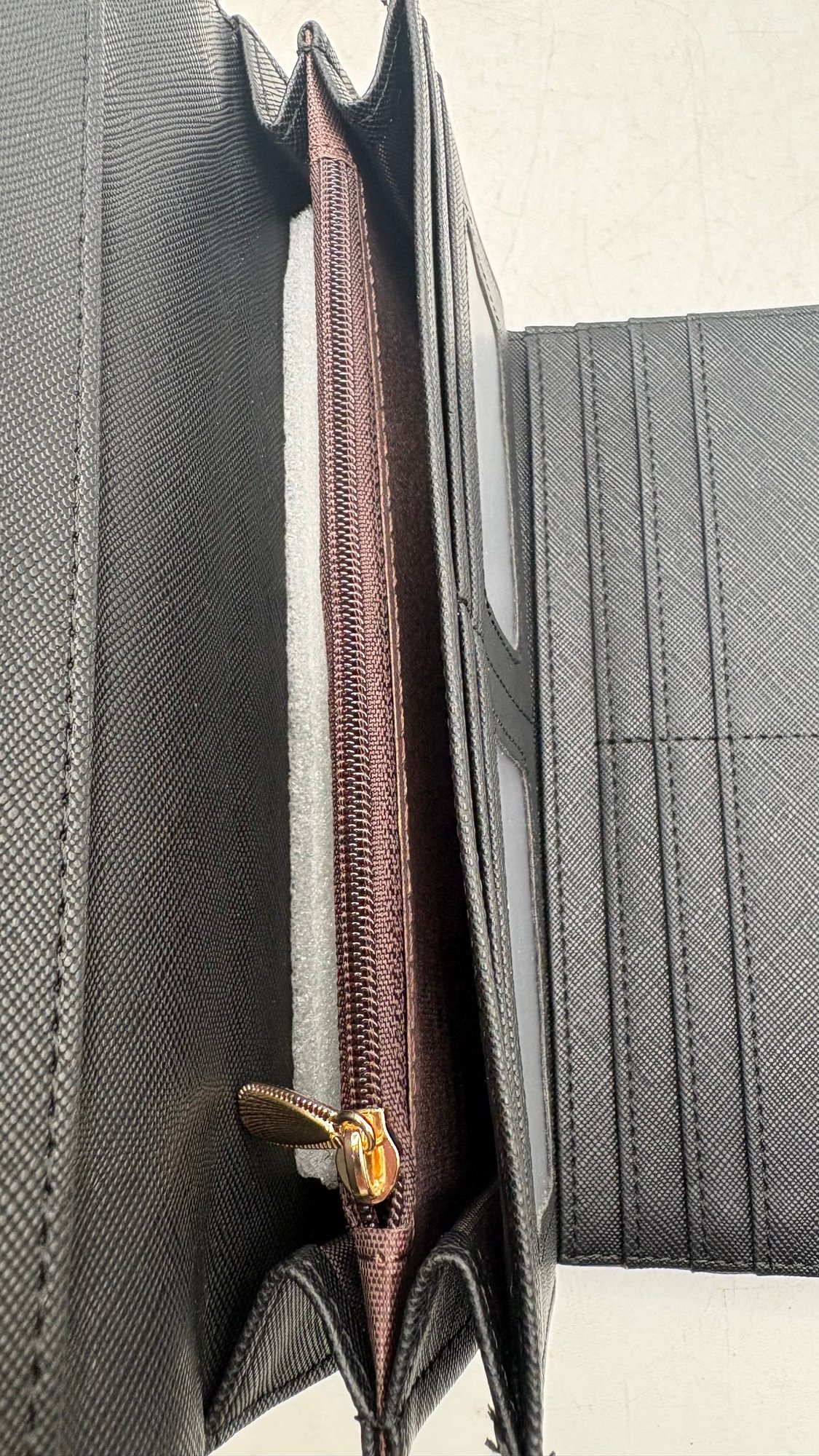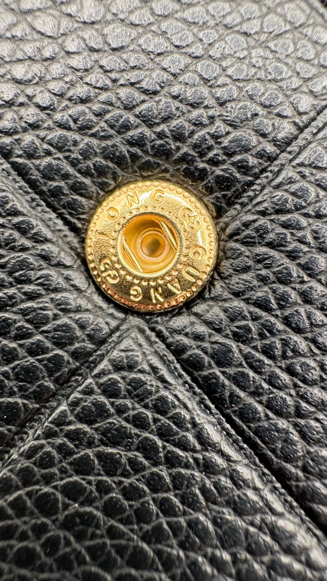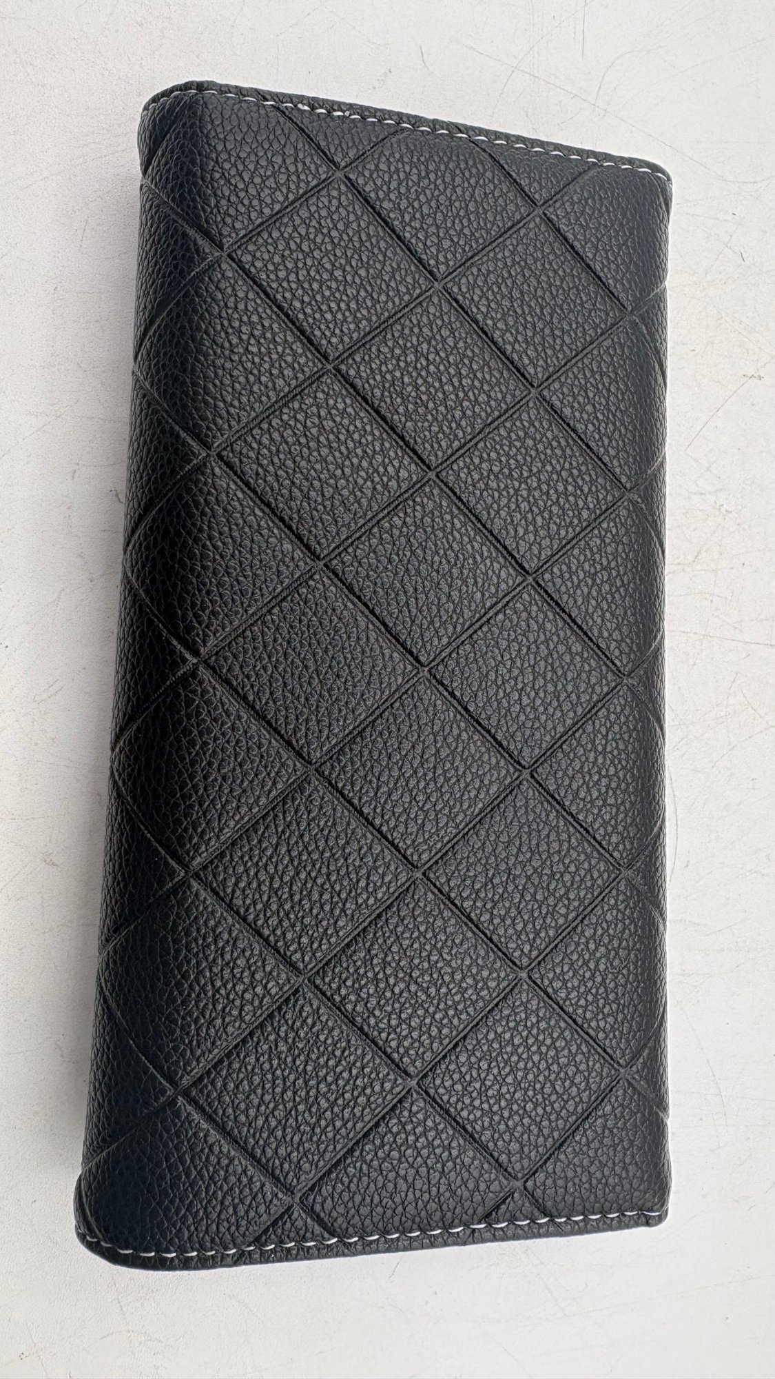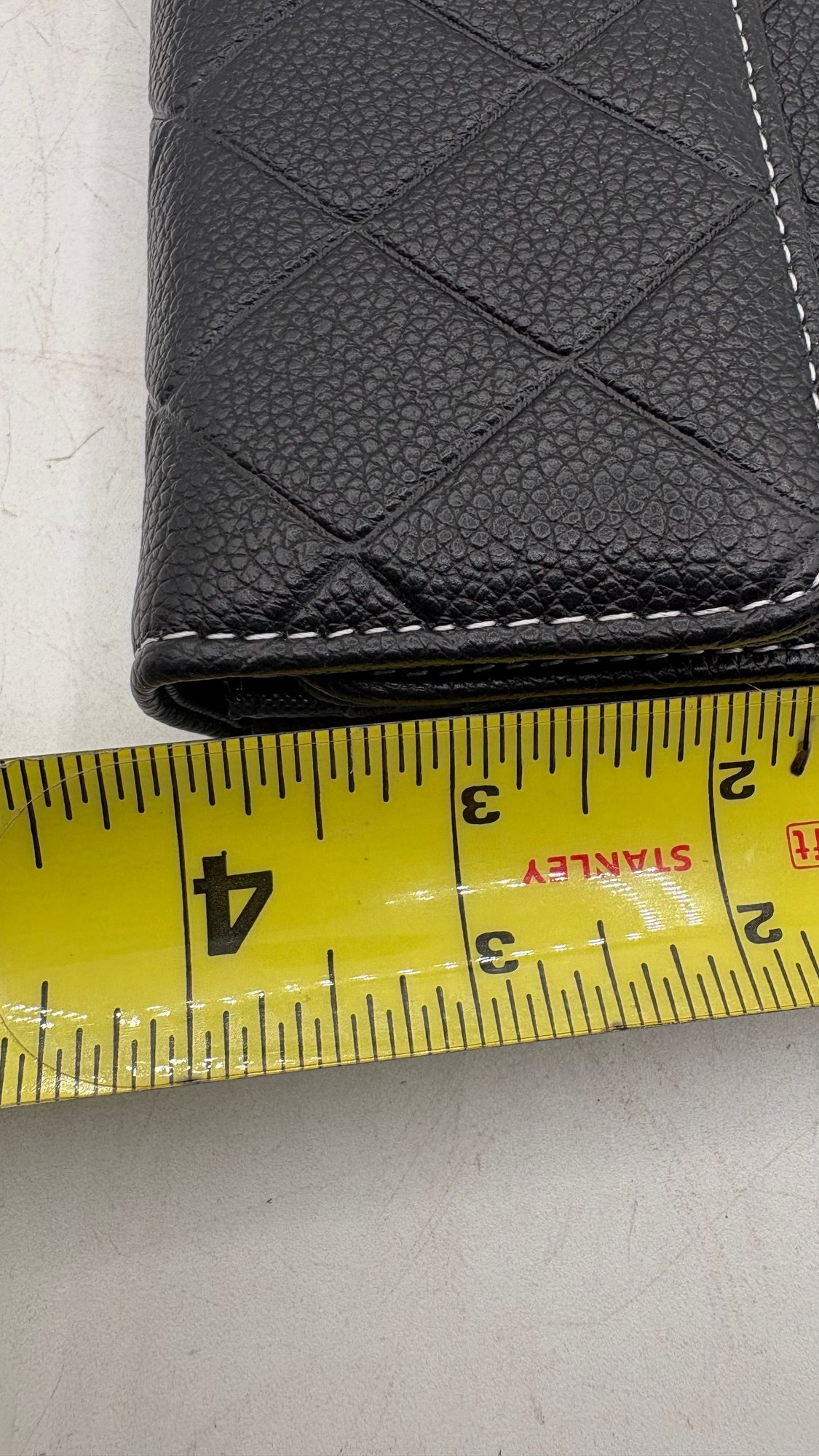 Black quilted leather wallet/clutch featuring a gold-tone floral snap closure. Made from genuine leather with a textured finish. Interior includes multiple card slots, ID windows, and a zippered coin compartment.