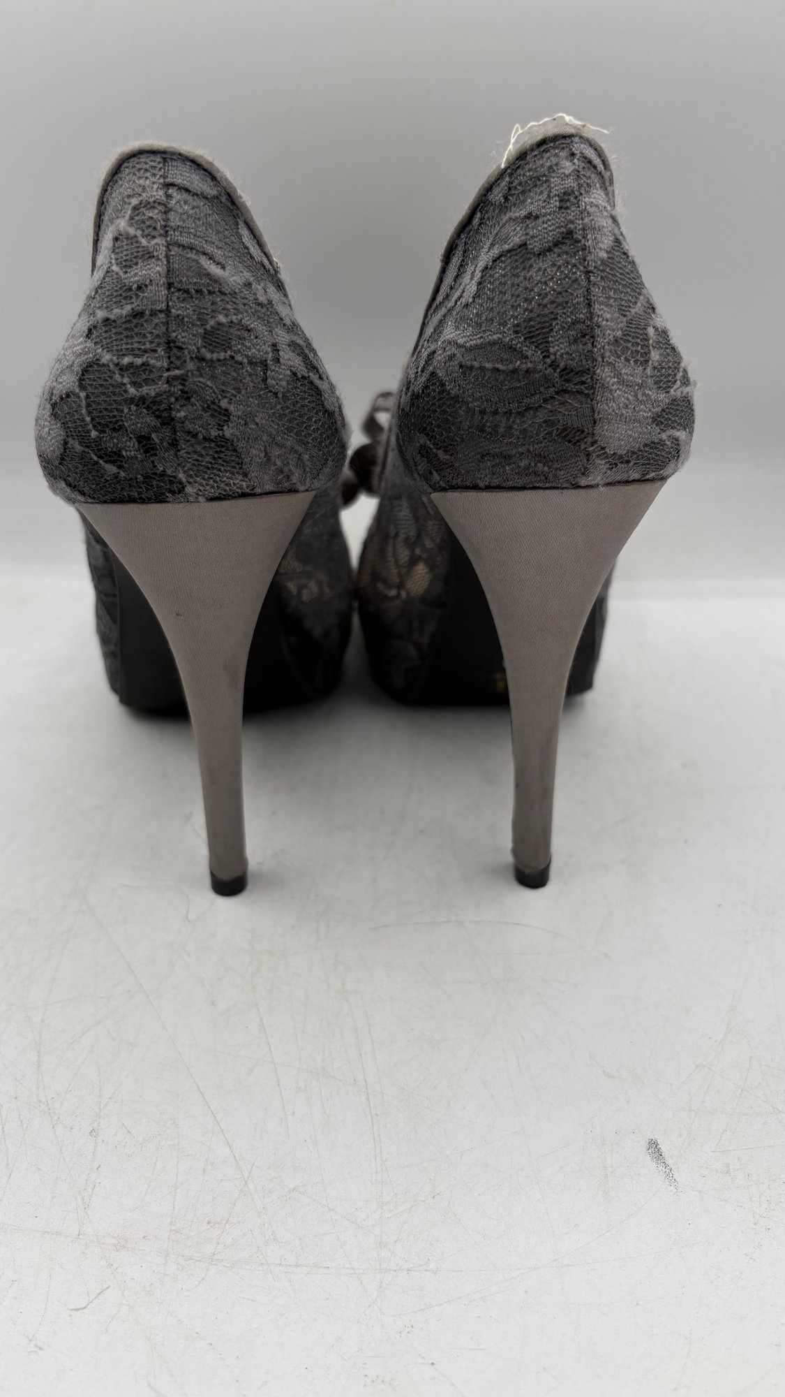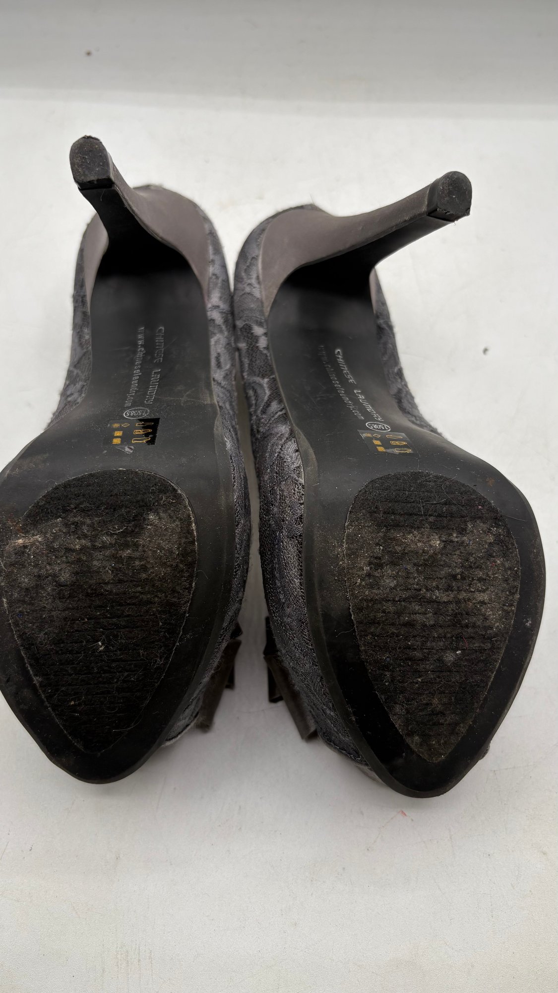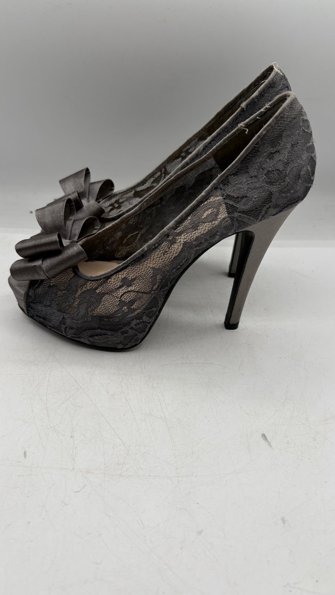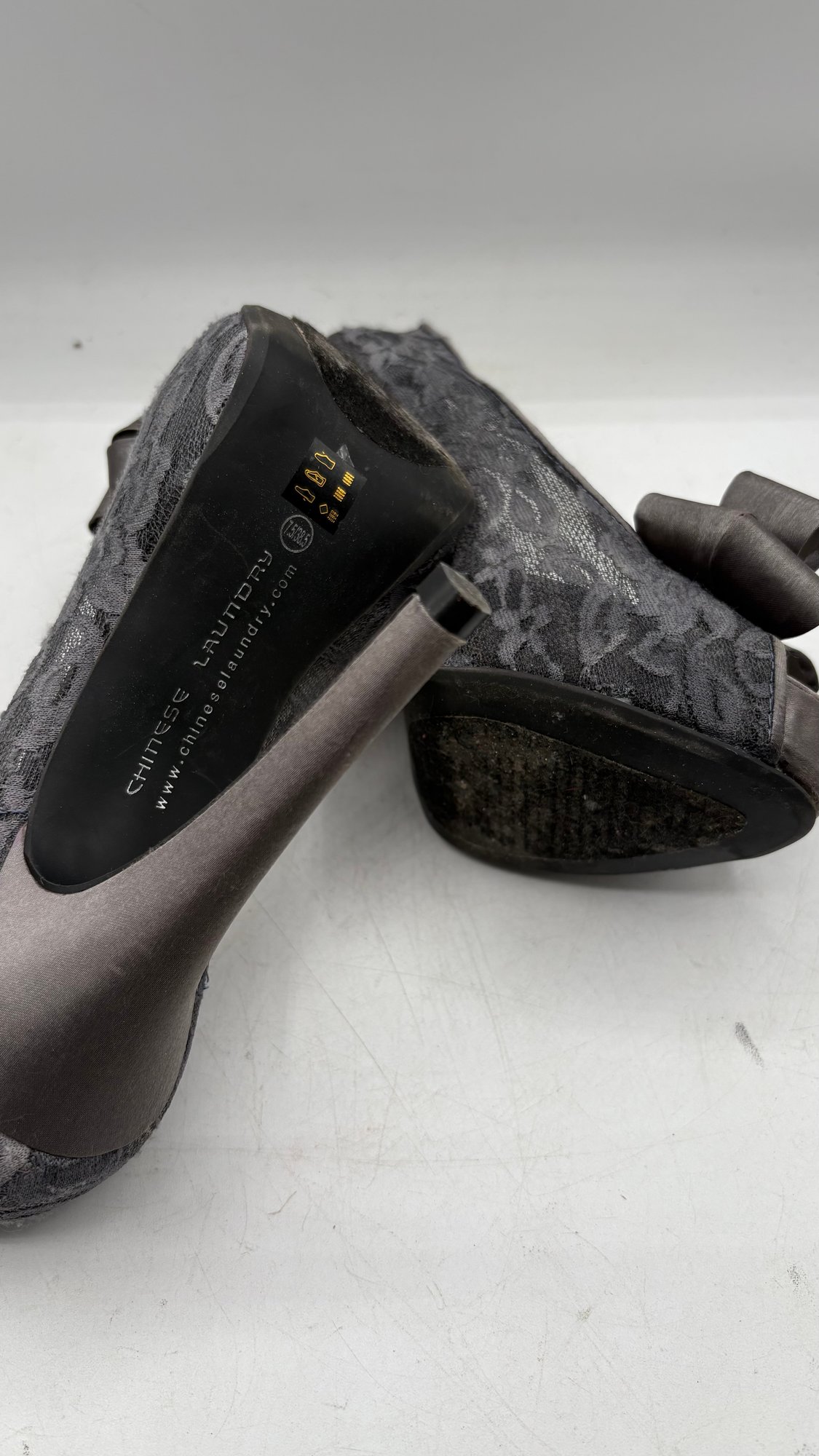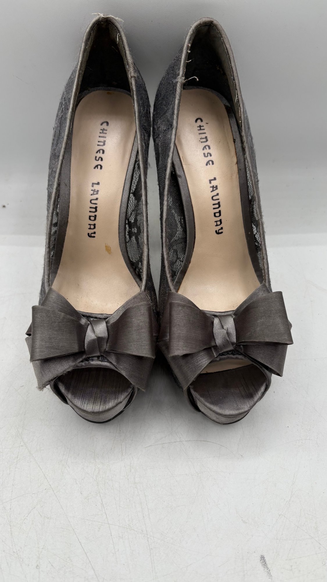 Chic Chinese Laundry high heels featuring delicate lace detailing and a bow accent at the front. Stylish peep-toe design perfect for weddings, parties, or special occasions. Comes in the original box, ideal for gifting or collectors.