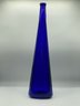 A bold and eye-catching Mid-Century Modern cobalt blue glass bottle, featuring a rare triangular form with a pontil/punt base. This tall sculptural bottle makes a strong decorative statement, perfect for collectors of vintage modernist glass or as a centerpiece accent in contemporary décor.