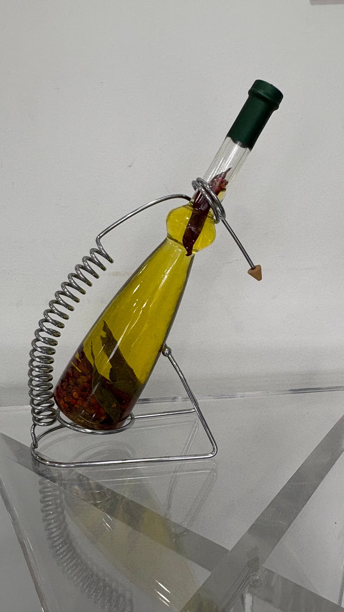 Clear glass bottle filled with decorative spices and herbs . Comes with a chrome metal stand. Some aging to the contents and wear to the stand.