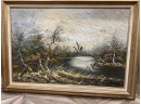 An original oil or acrylic painting on canvas, depicting flying ducks above a lake, which is signed ‘Bernard’. The painting is presented in a wood frame with a linen fillet and is ready to hang.