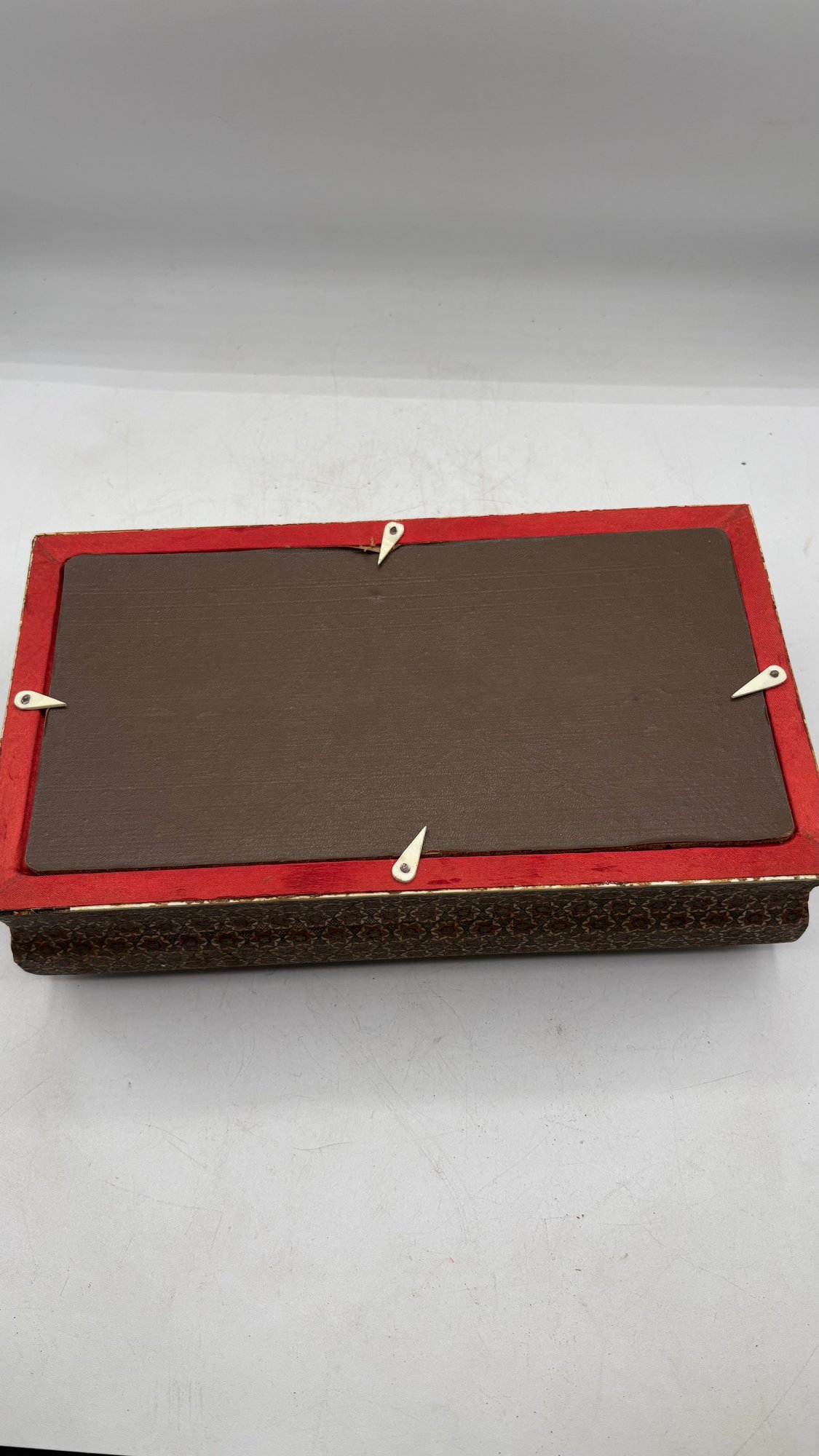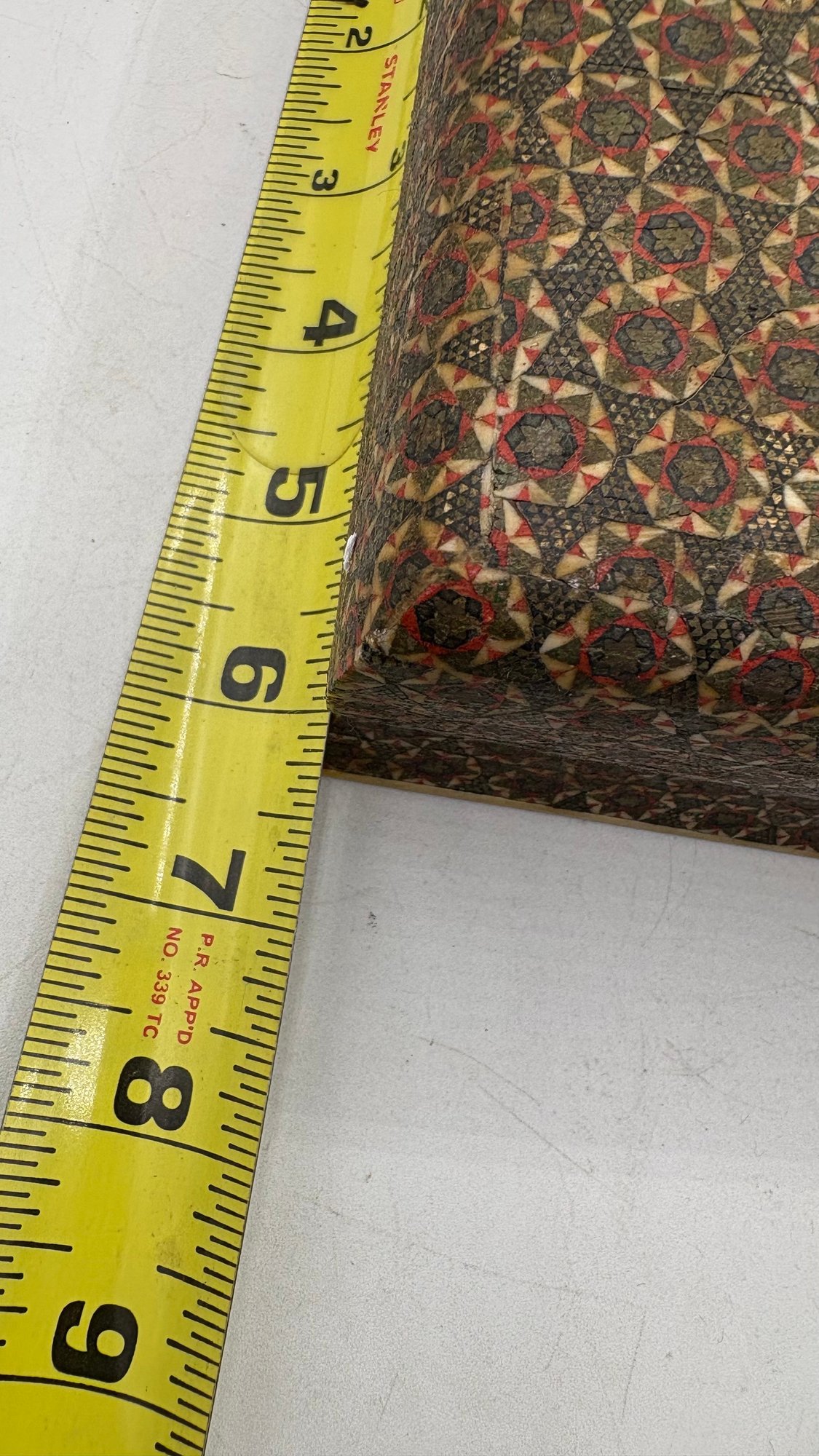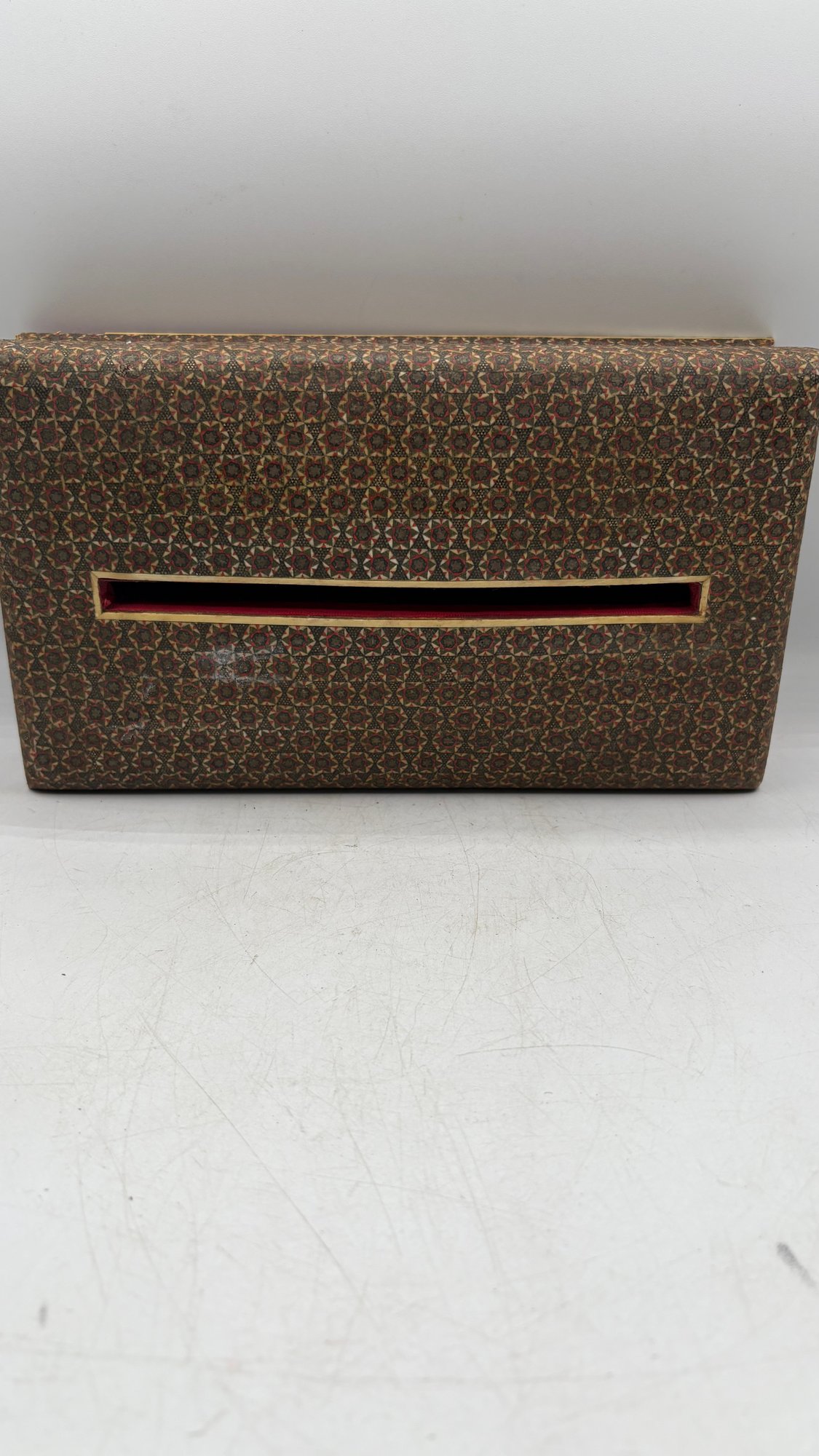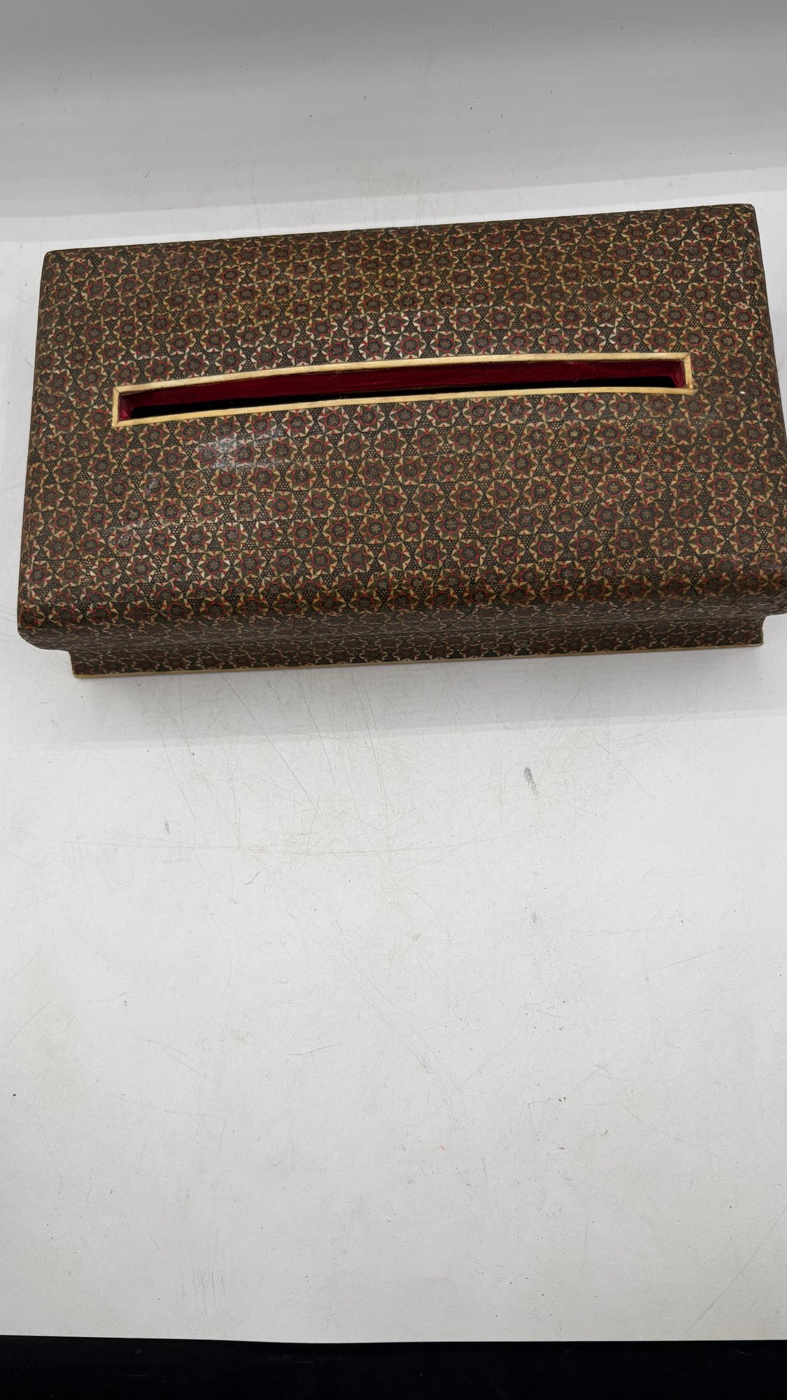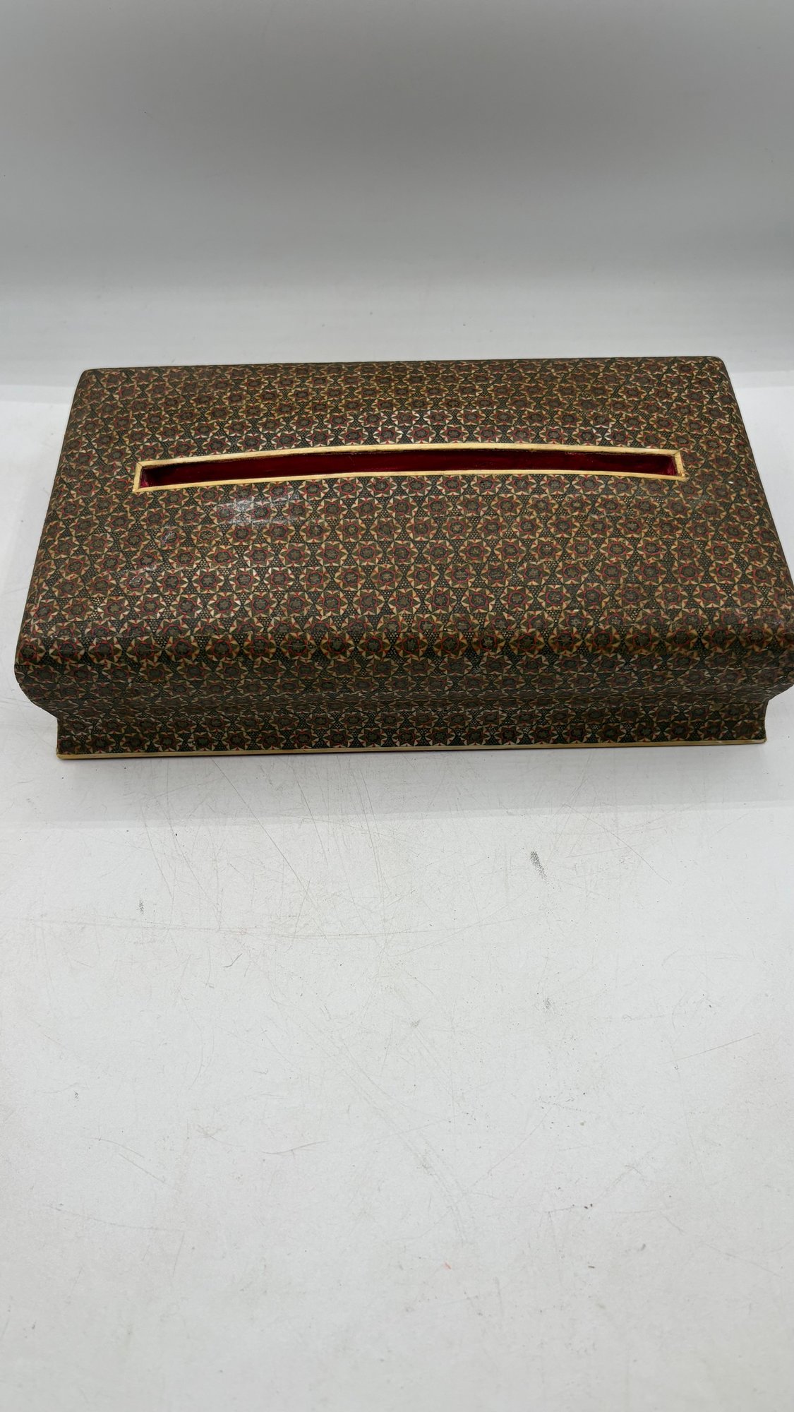Beautiful handcrafted Persian wooden tissue box featuring intricate inlaid detailing in traditional geometric patterns. A fine example of Middle Eastern craftsmanship, perfect for adding elegance to any room.