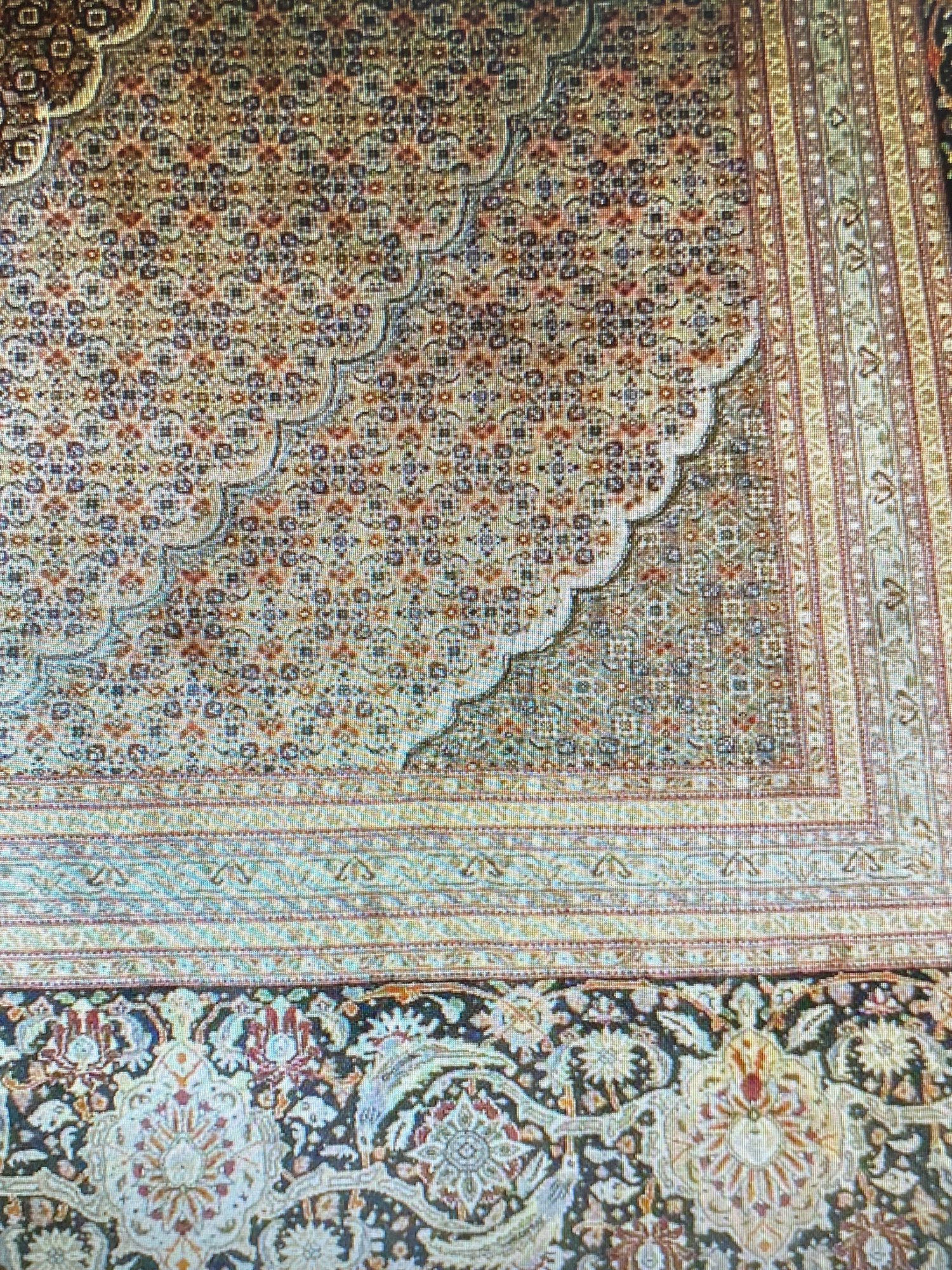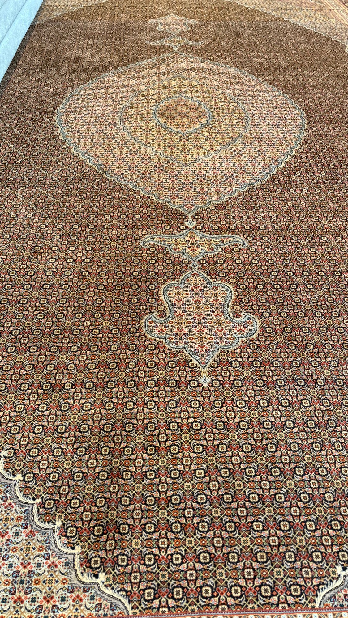 Impressive handmade Persian area rug from Tabriz, featuring a traditional Mahi (Fish) pattern in rich soft blue rust ivory ,olive tones. This expansive 13x20 carpet showcases intricate all-over detailing with a finely balanced field and coordinated border, characteristic of classic Tabriz craftsmanship.