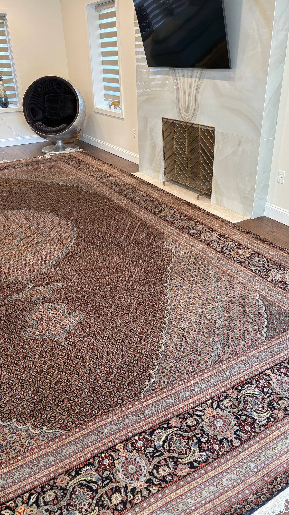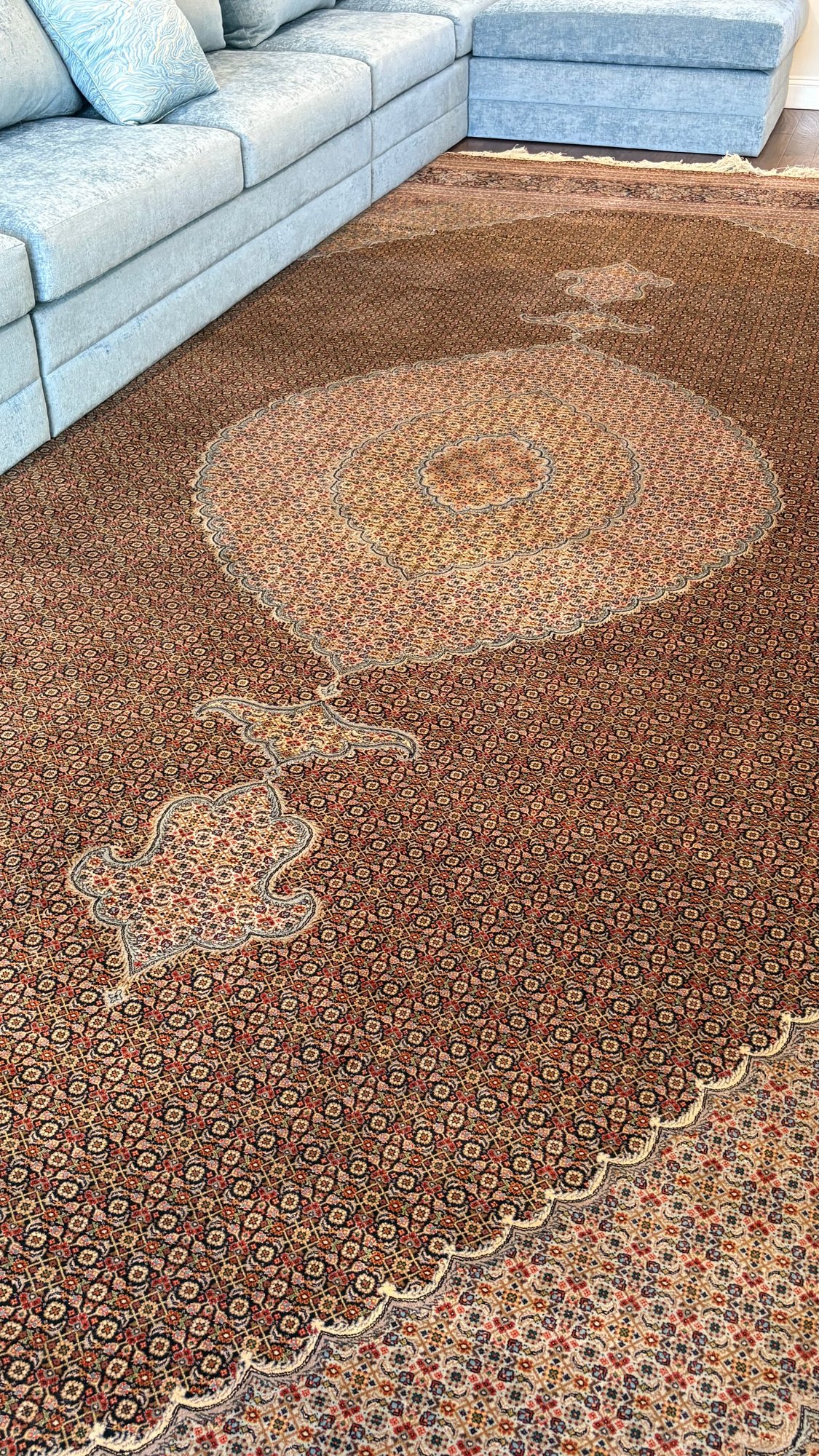 Large Handmade Persian Tabriz Rug – 13'4" x 19'8" – in rich soft blue rust ivory ,olive tones. Mahi (Fish) Design