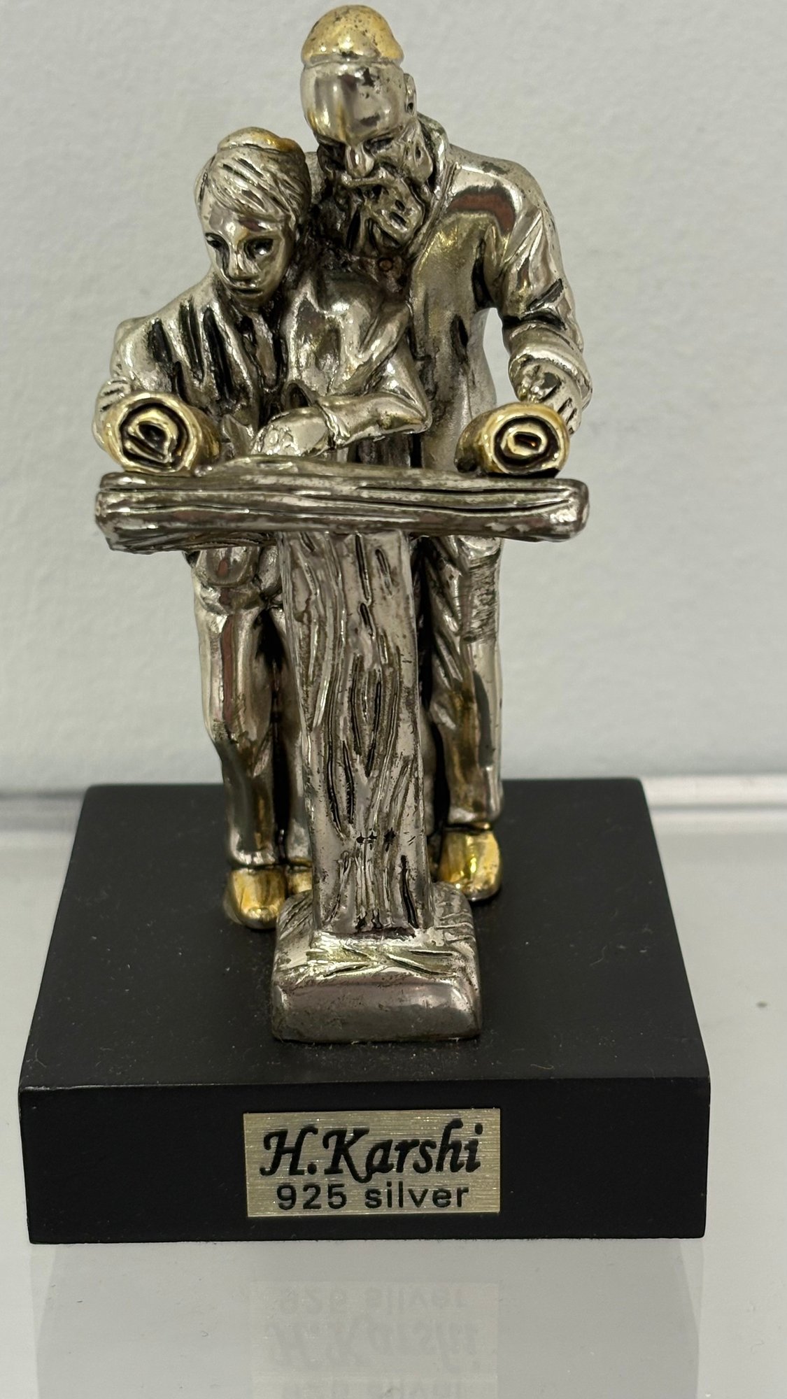 Exquisite H. Karshi sterling silver figurine from Jerusalem, depicting a Rabbi guiding a young boy as they read the Torah. Crafted in 925 sterling silver, this piece showcases delicate details and traditional Judaica artistry.