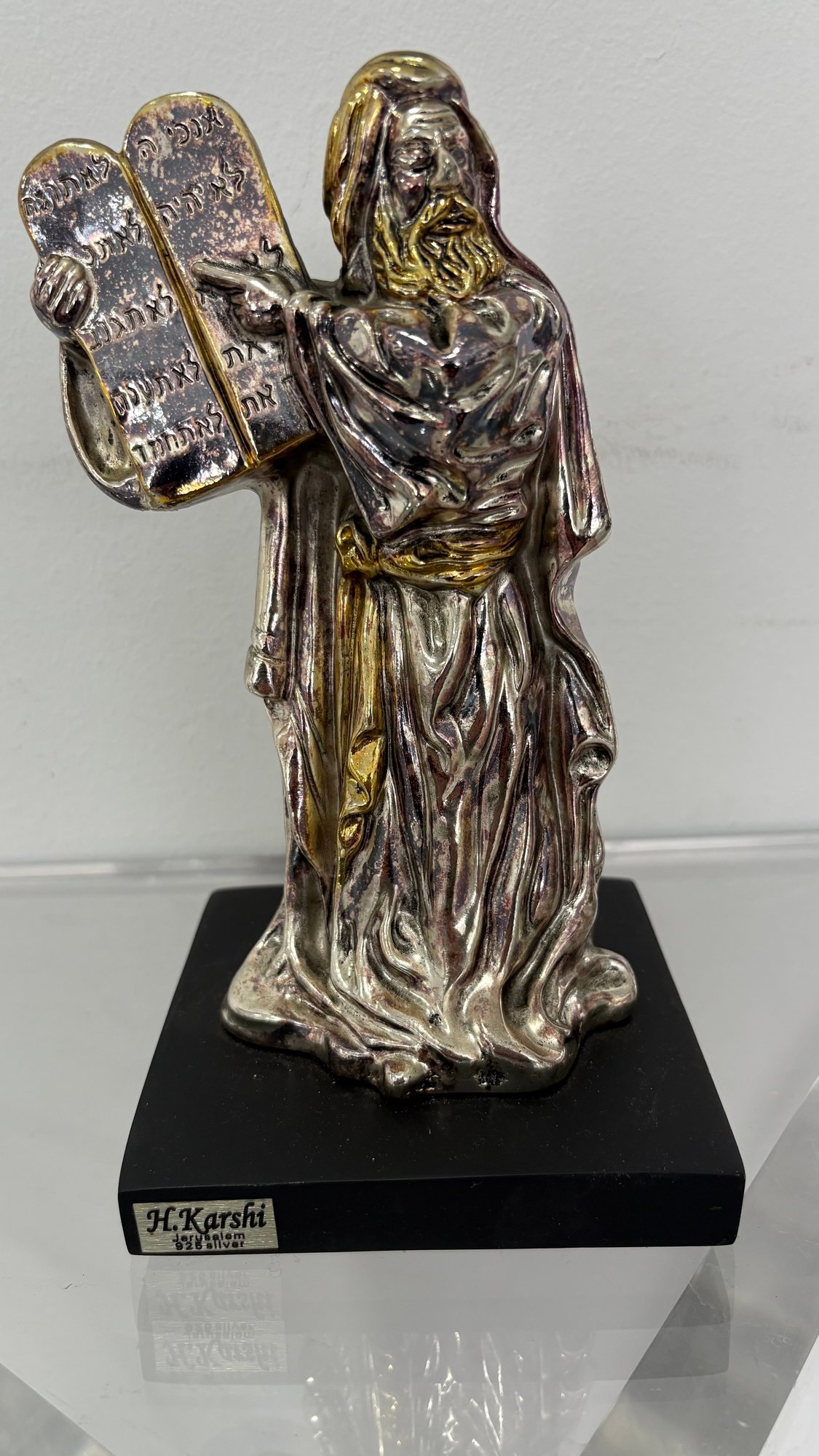 Elegant H. Karshi silver sculpture from Jerusalem, depicting Moses holding the Ten Commandments. Crafted in 925 sterling silver, this piece showcases fine detail and traditional religious artistry.