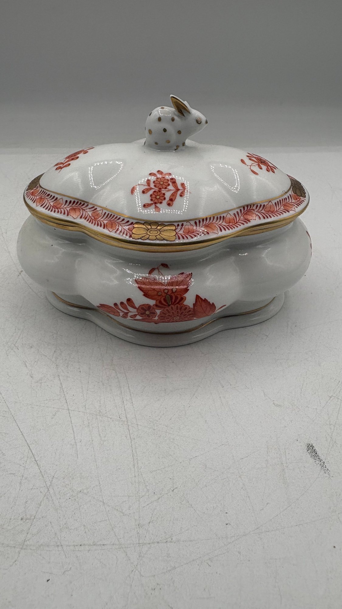 Elegant and collectible Herend Hungary hand-painted porcelain covered bonbon or sugar dish in the classic Chinese Bouquet Rust pattern. Features richly detailed floral motifs with gold accents and a charming bunny finial on the lid.