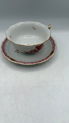 Elegant Herend Hungary hand-painted porcelain coffee cup and saucer set in the highly sought-after Rust/Chinese Red Floral pattern. This classic design features detailed floral motifs and refined gold accents, showcasing Herend’s renowned craftsmanship.