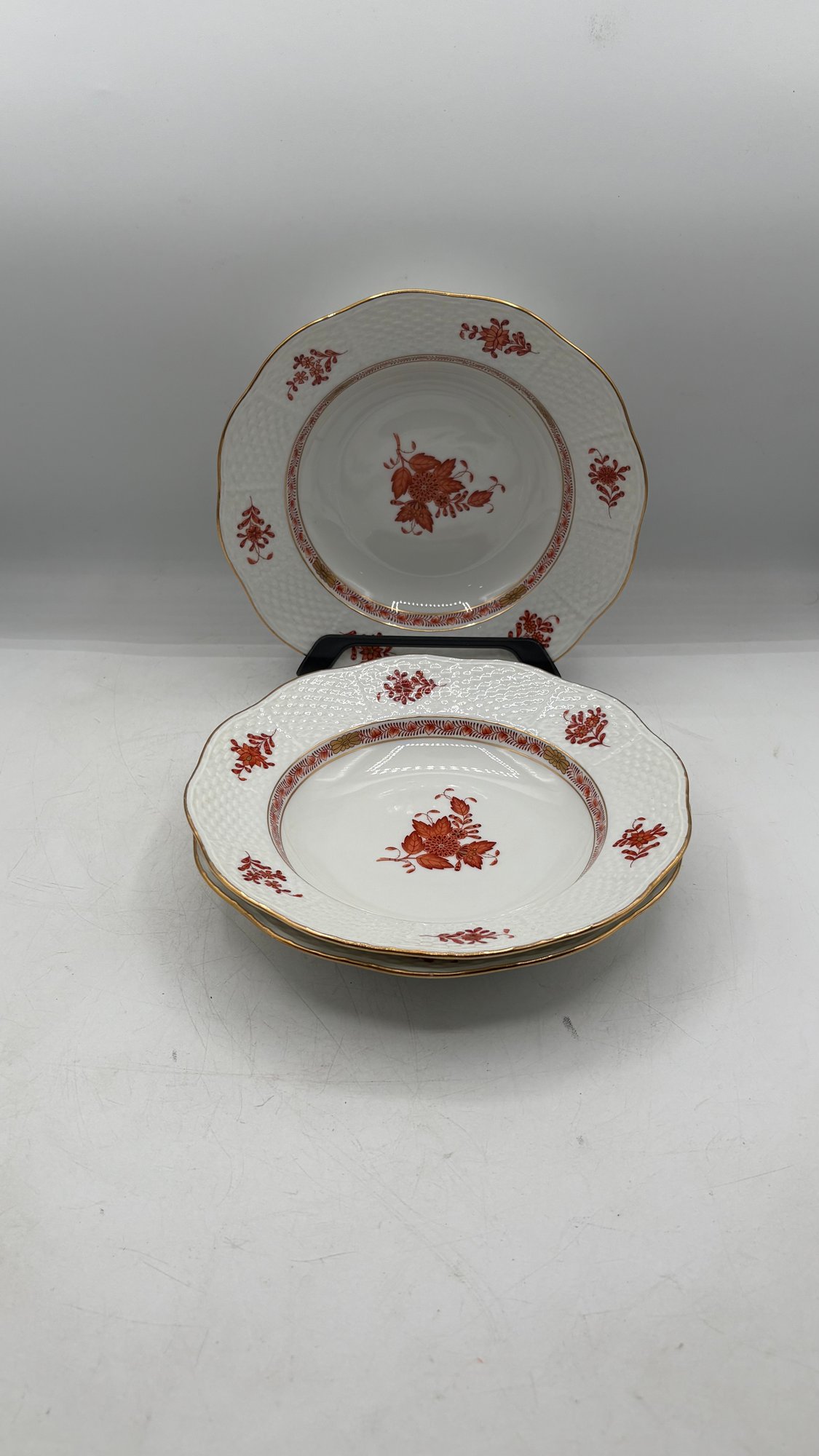 Beautiful set of three authentic Herend Hungary hand-painted soup bowls in the classic Rust/Chinese Red Floral pattern. Each bowl features Herend’s signature detailed floral motifs, gold accents, and exceptional craftsmanship.