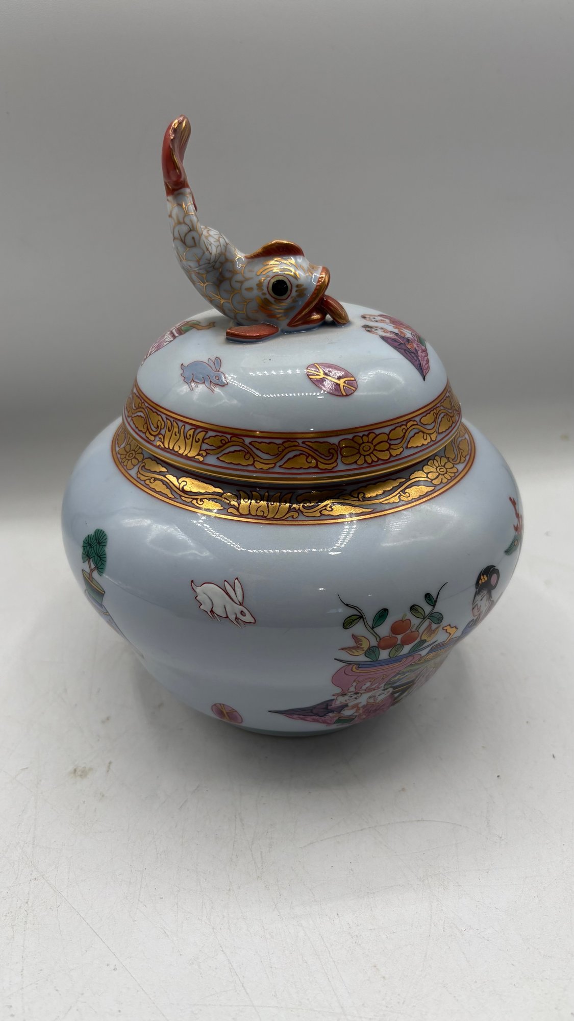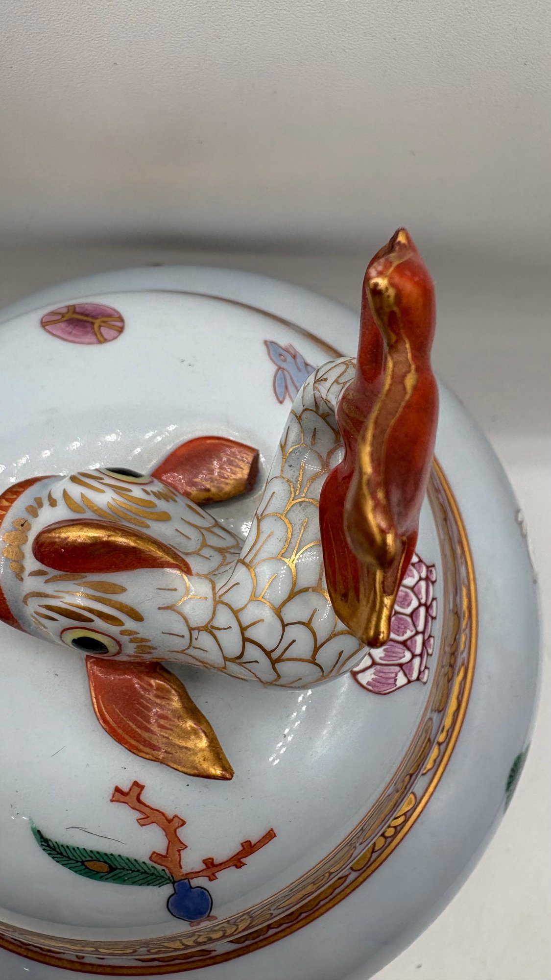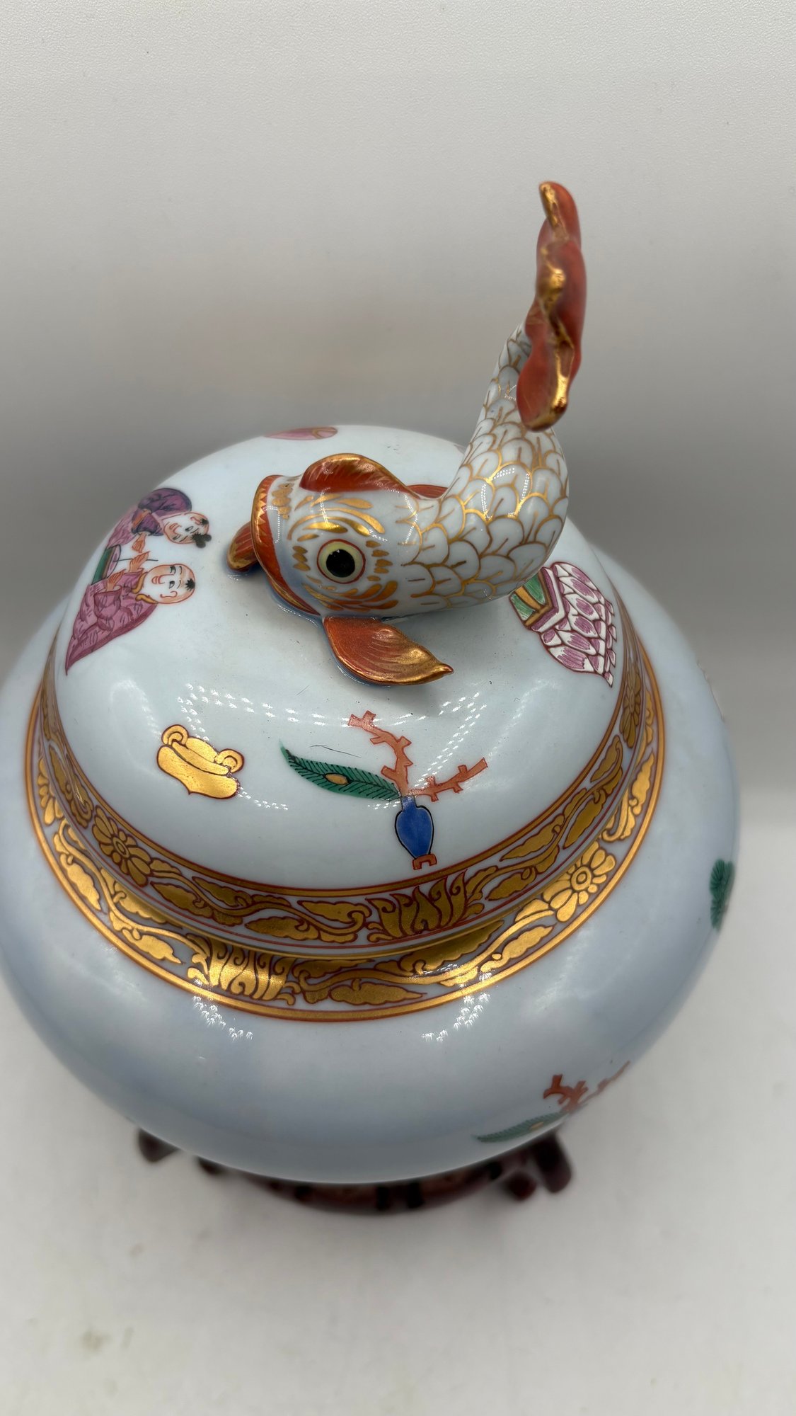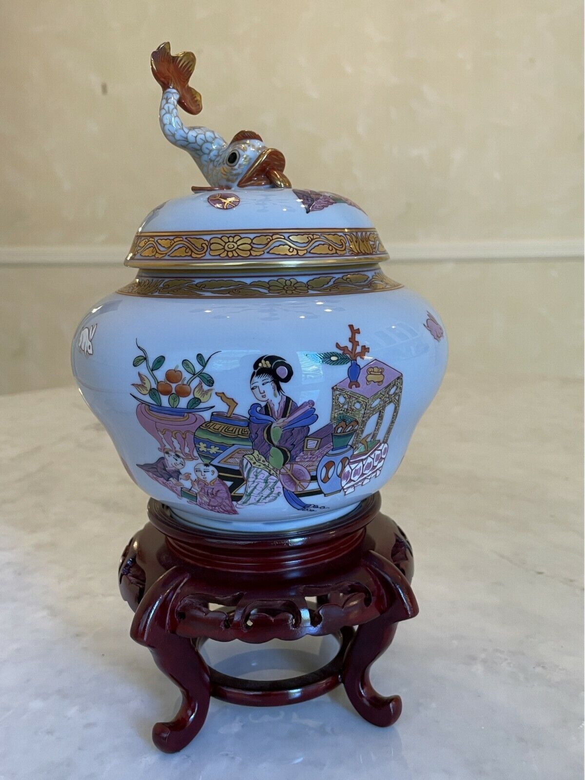 Add this beautiful Herend Ming Pattern ginger jar (1941) with a koi fish lid to your collection. This magnificent piece is presented on a mahogany pedestal stand, making it an elegant display item.
