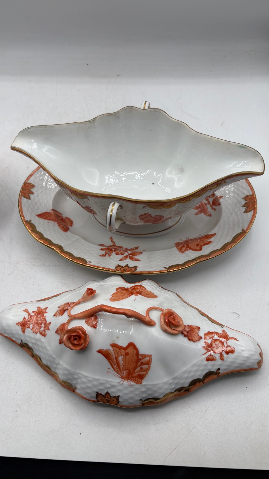 Magnificent and extensive Herend Queen Victoria Fortuna Rust porcelain dinner service, beautifully hand-painted with vibrant florals, butterflies, and rich rust-colored accents. This iconic pattern is one of Herend’s most celebrated designs, known for its intricate detailing and exceptional craftsmanship.
