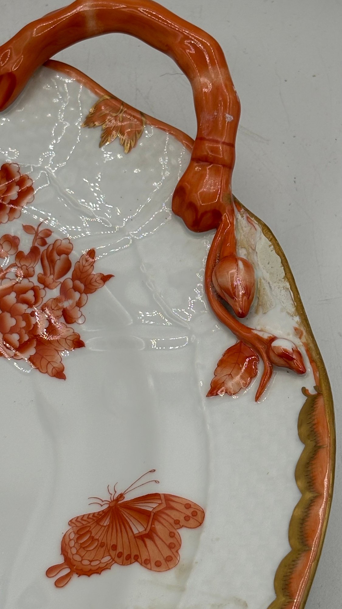 Hand-painted porcelain with gold trim and multicolor floral/butterfly motif.