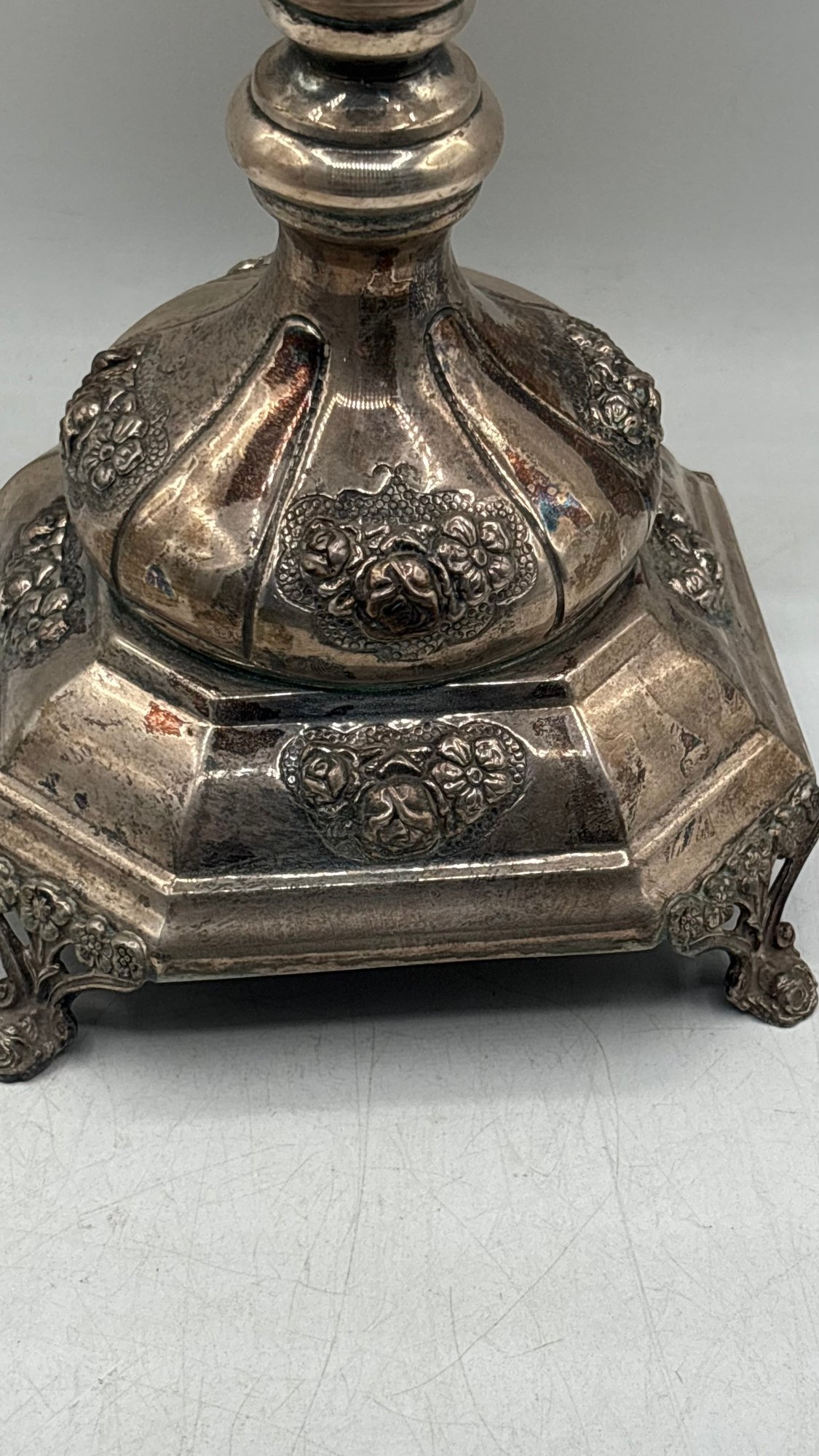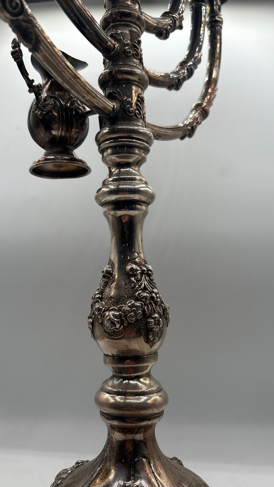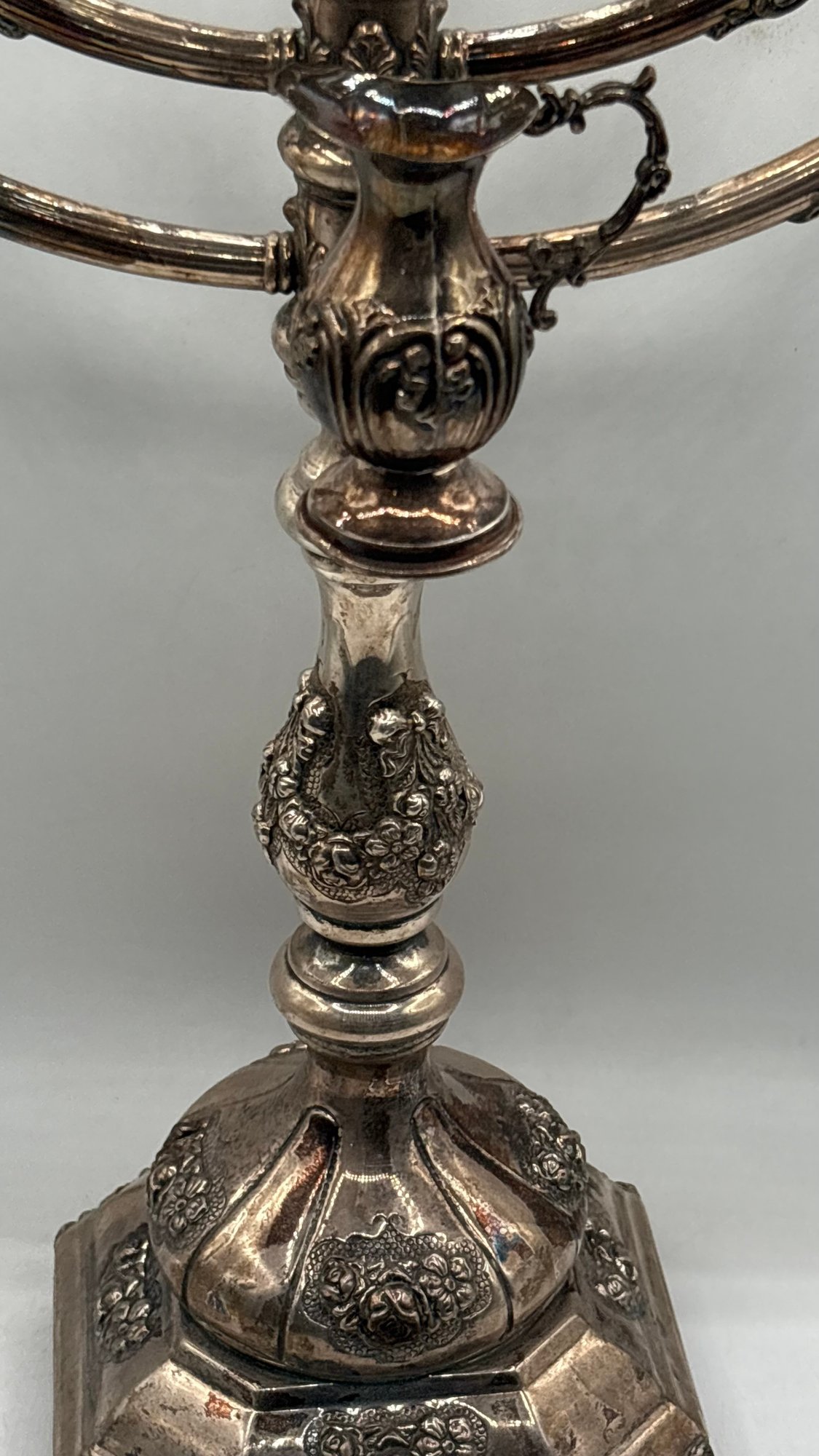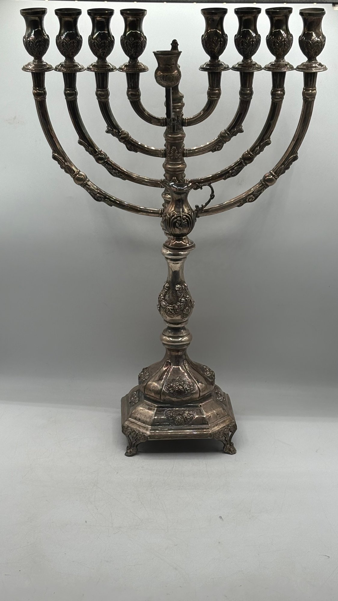 Impressive large sterling silver (925) Hanukkah menorah, richly decorated with repoussé work and engraved detailing, featuring a decorative hanging oil jug at center. Substantial, heavy piece with strong presence—ideal for serious Judaica collectors or silver investors. As of March 2026, the spot price of 925 sterling silver is approximately $2.70 - $2.90 USD per gram