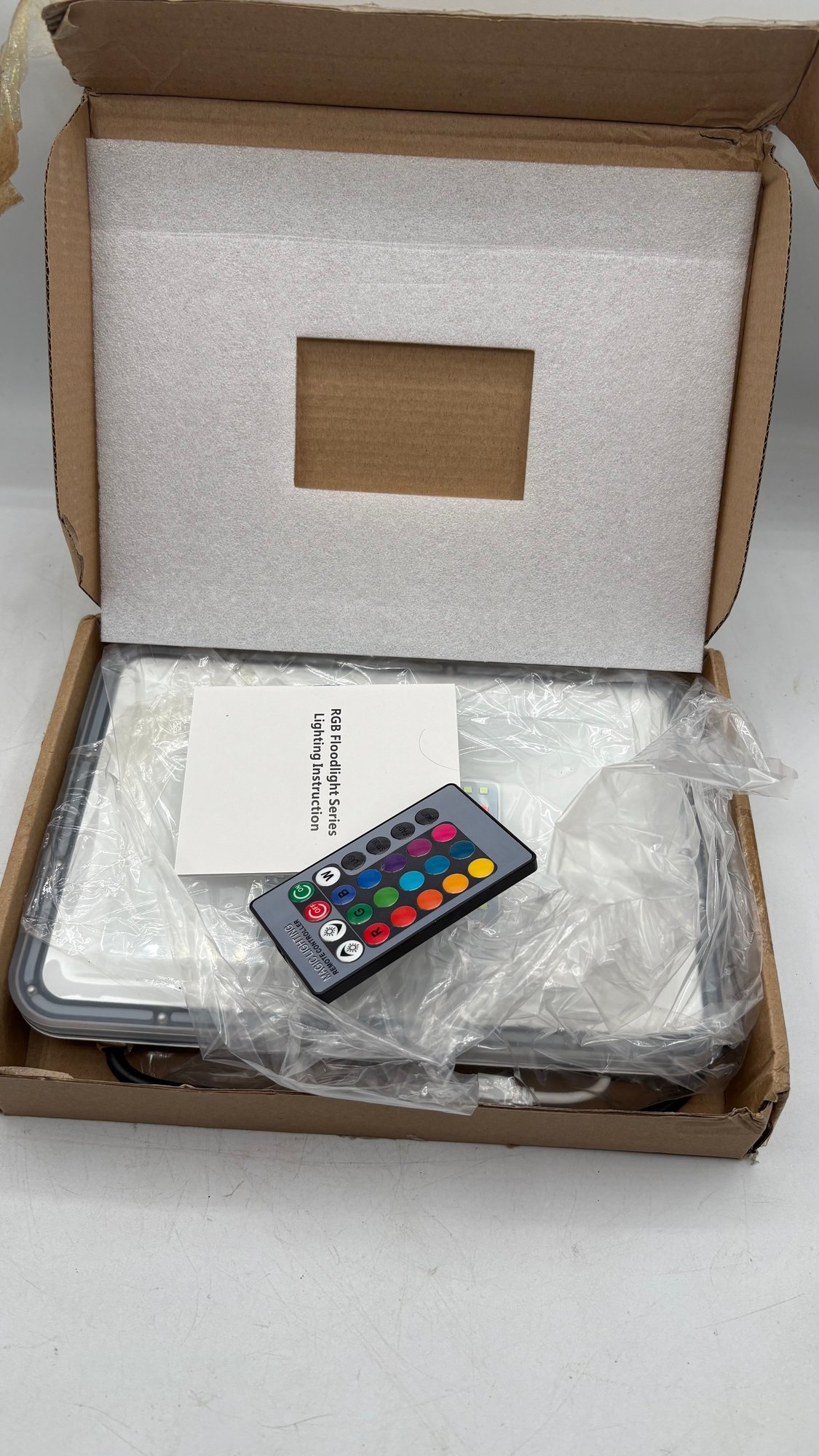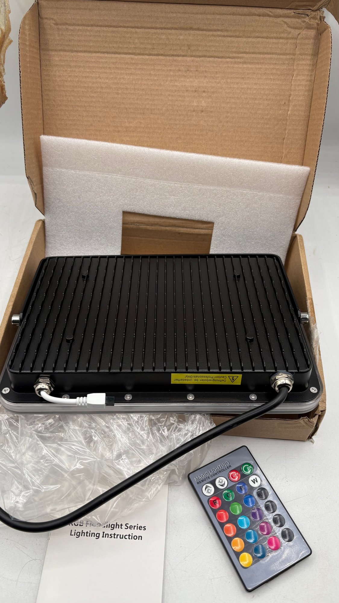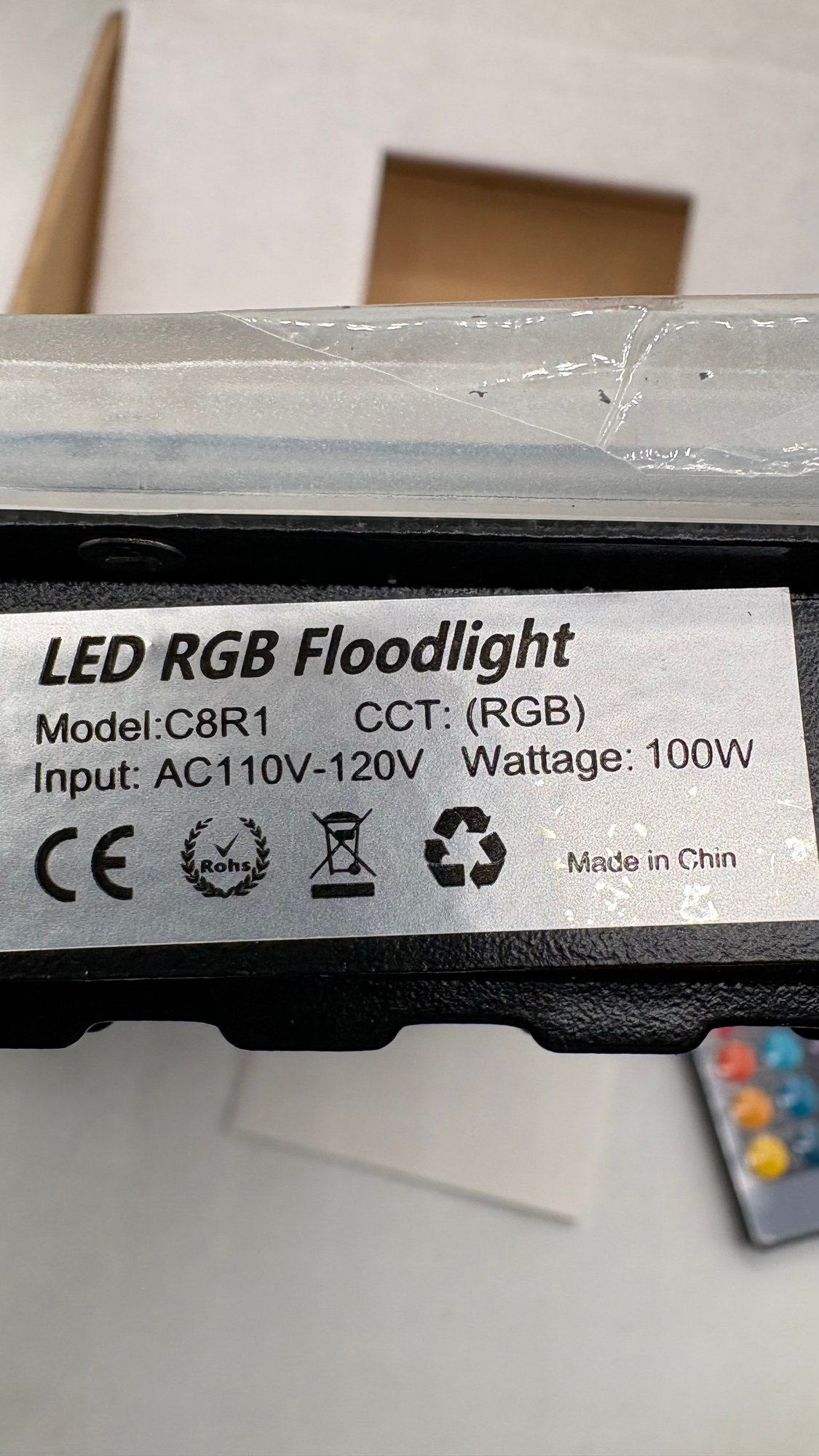 LED RGB Floodlight Model C8R1, brand new and sealed in the original box. This versatile color-changing floodlight is ideal for outdoor lighting, landscape accents, event lighting, stage effects, or architectural illumination.