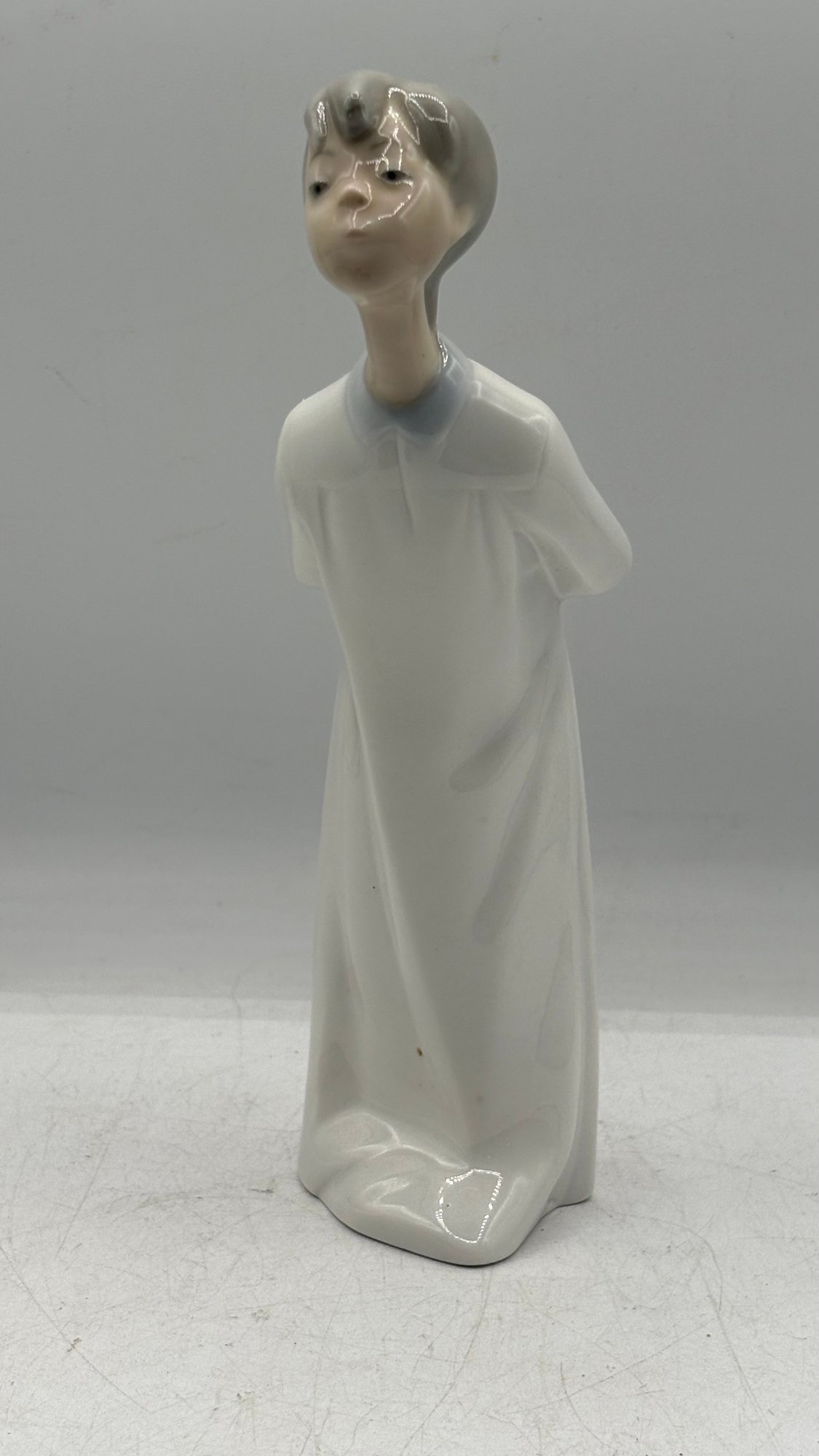 Charming vintage Lladro porcelain figurine featuring a young boy in a nightgown, leaning forward as if offering a sweet goodnight kiss. Classic soft Lladro colors and delicate craftsmanship.