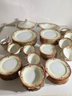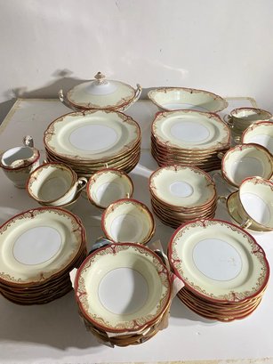 An elegant china set for 8 Noritake Vornay Red. The set is in used condition. The set has a gold rim and accents, as well as red design in corners. The plates have a scalloped edge. The set contains; 8 Dinner Plates 8 Square Dessert/Salad Plates 8 footed cream soup bowl & saucer set 8 Saucers 7 footed Cups 8 cereal bowl 1 round covered vegetable 1creamer 1 Oval Bowl Total of 66 pieces