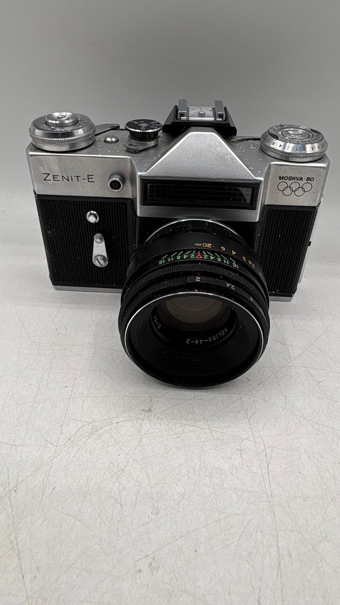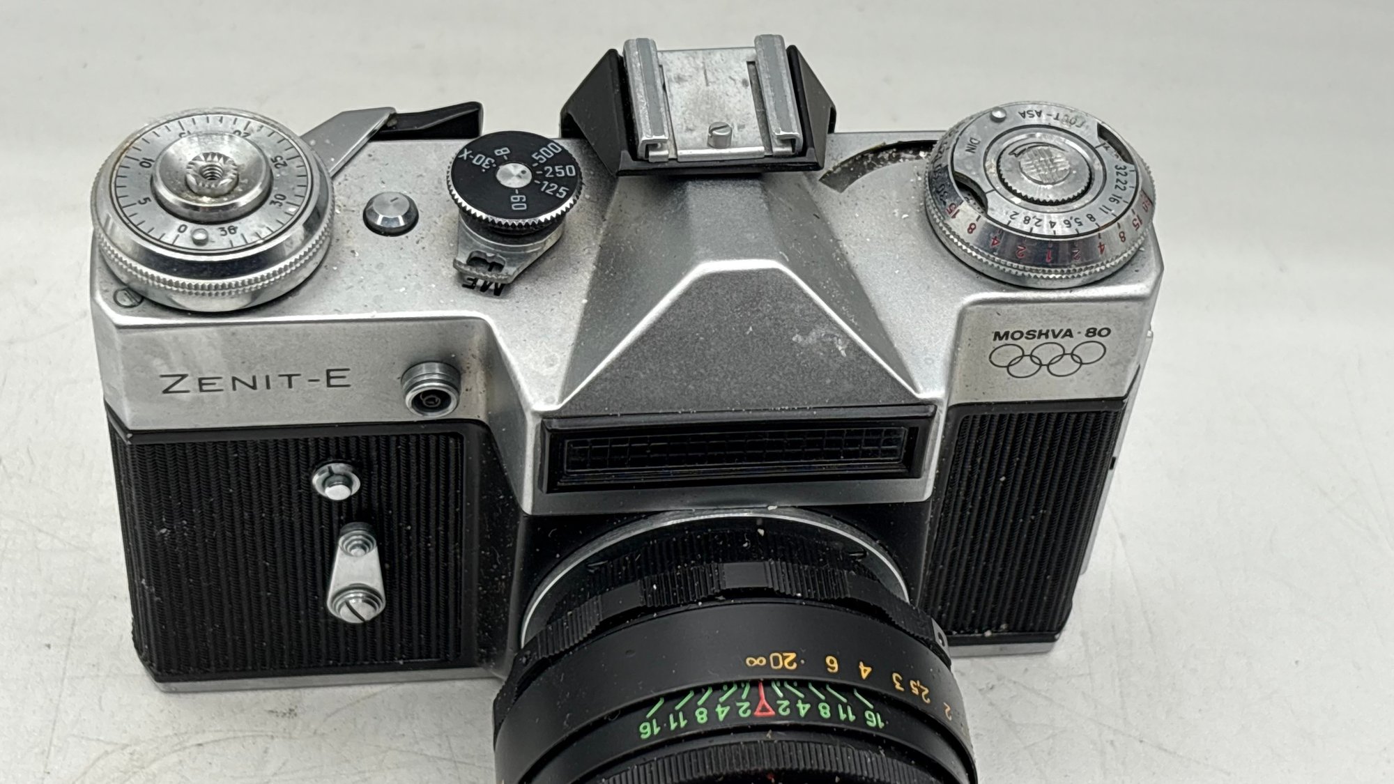 Vintage Zenit-E 35mm SLR camera commemorating the Moscow 1980 Olympics, a collectible Soviet-era film camera. These special edition models are sought after by collectors of Cold War memorabilia and vintage photography equipment.
