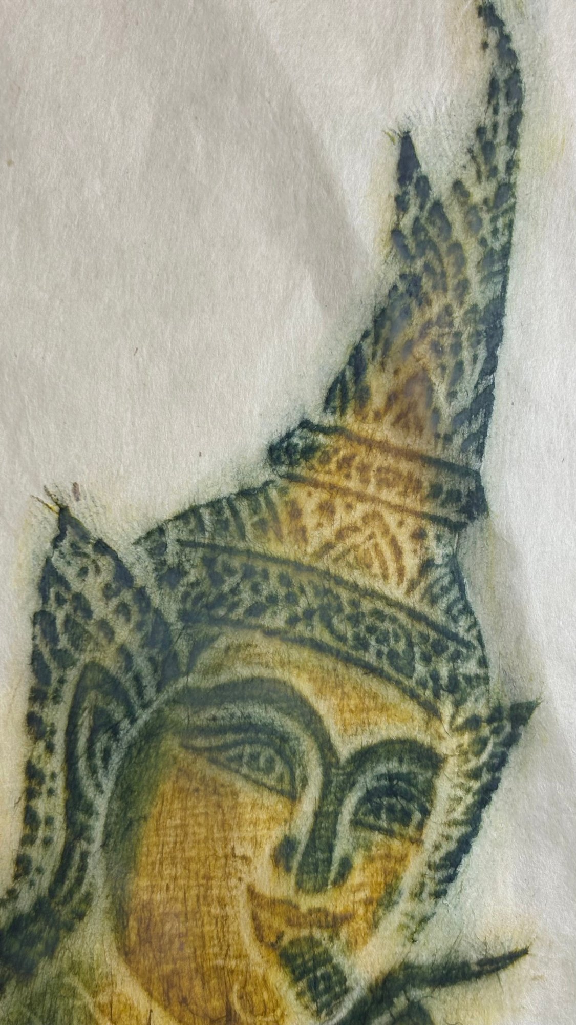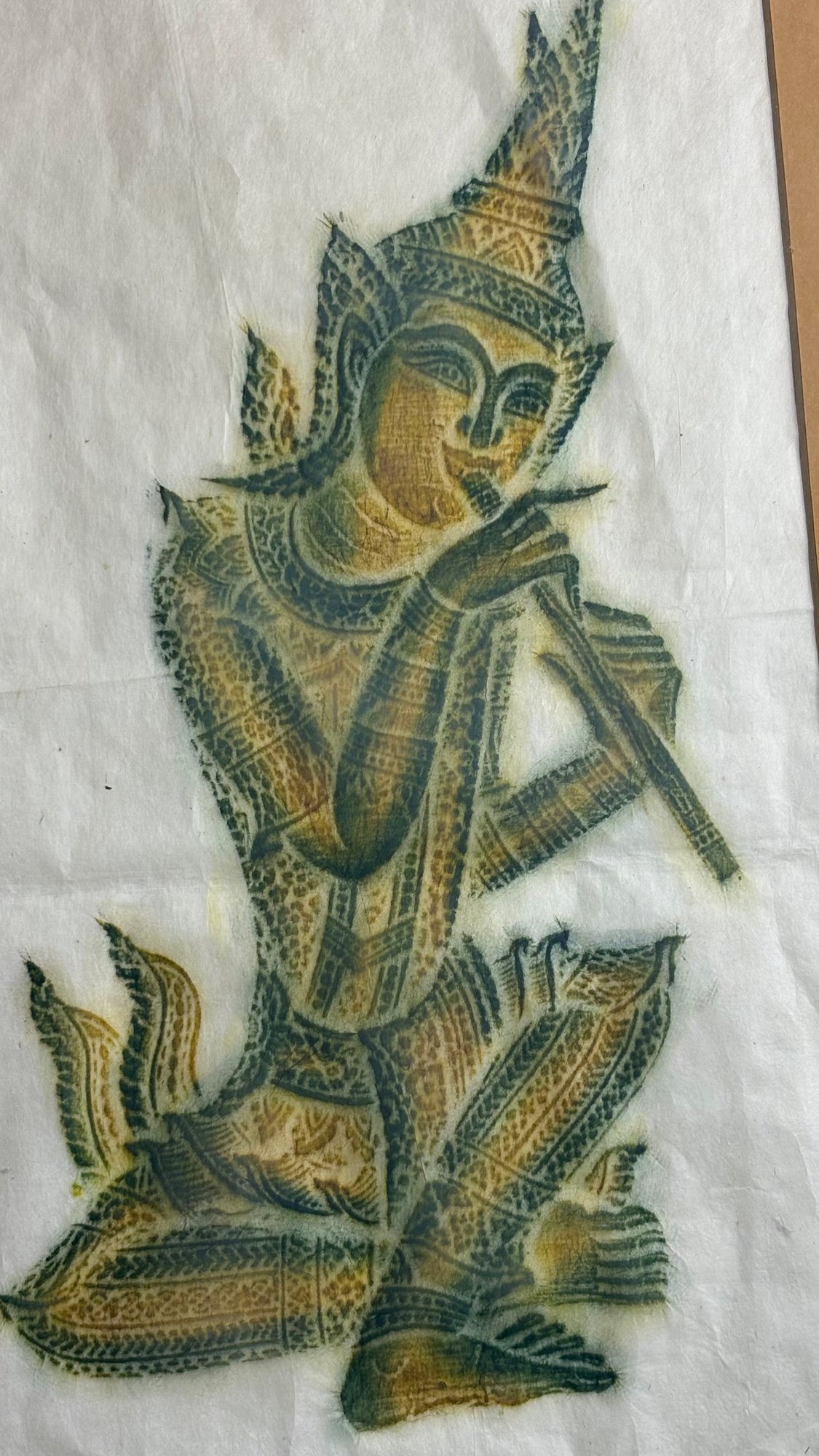 Authentic Thai temple rubbing featuring a kneeling celestial musician rendered in green-gold tones. This traditional artwork was created by placing handmade rice paper over a carved temple relief, then gently rubbing pigment to reveal the raised design.