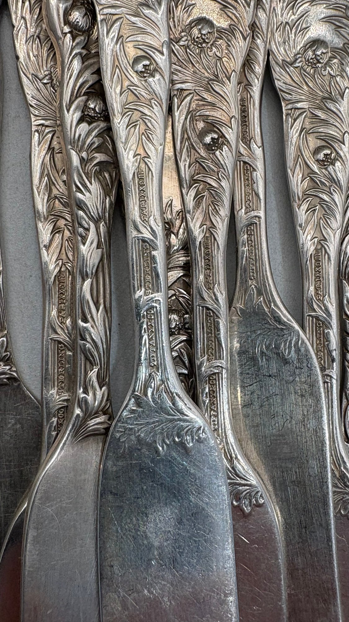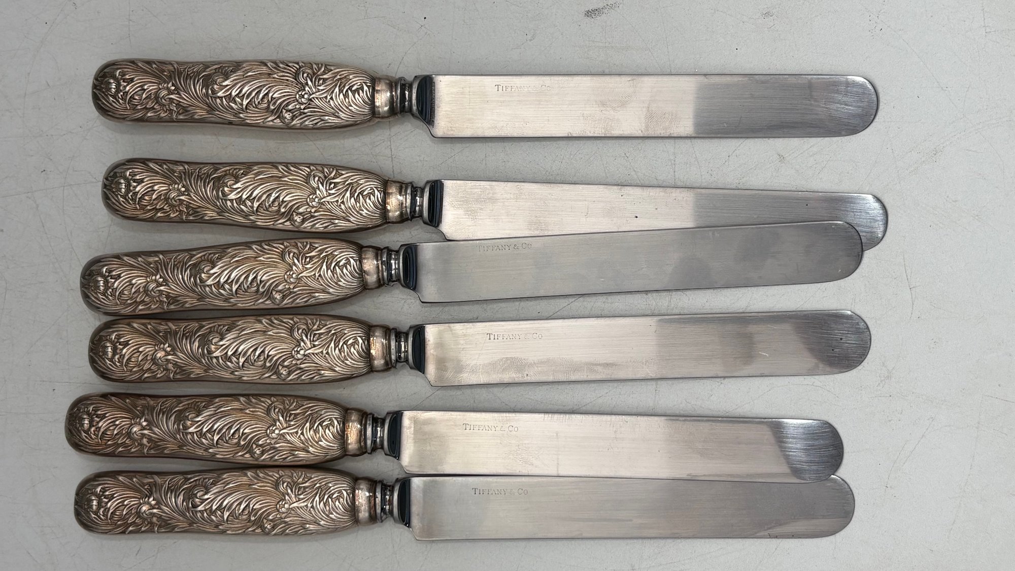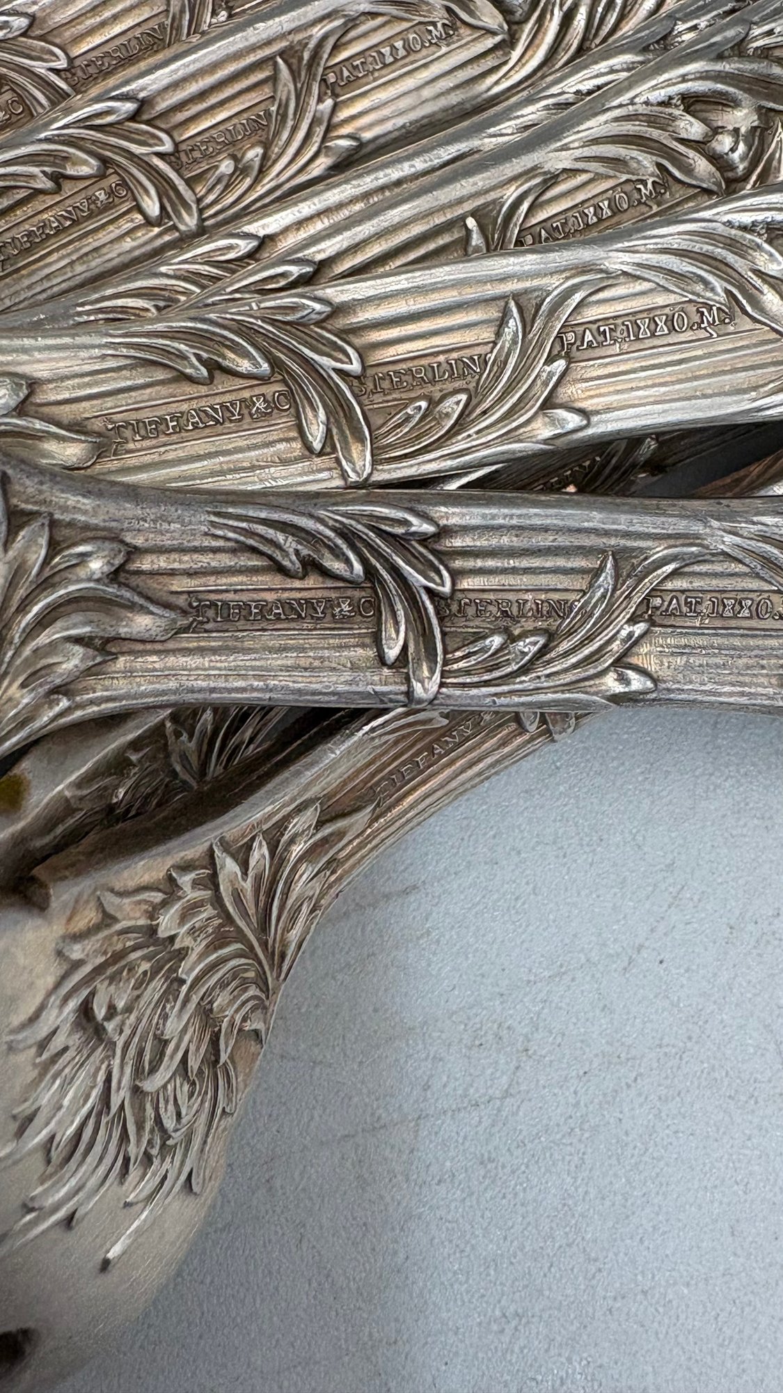 Exquisite Chrysanthemum pattern sterling silver flatware by Tiffany & Co., featuring detailed floral design and exceptional craftsmanship. This comprehensive set includes a wide range of pieces suitable for formal dining, entertaining, or as part of a sterling silver collection. No monogram on any pieces.