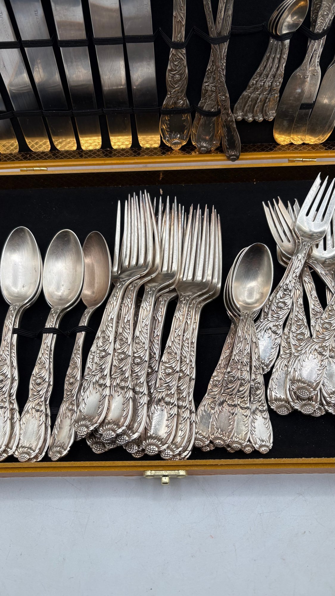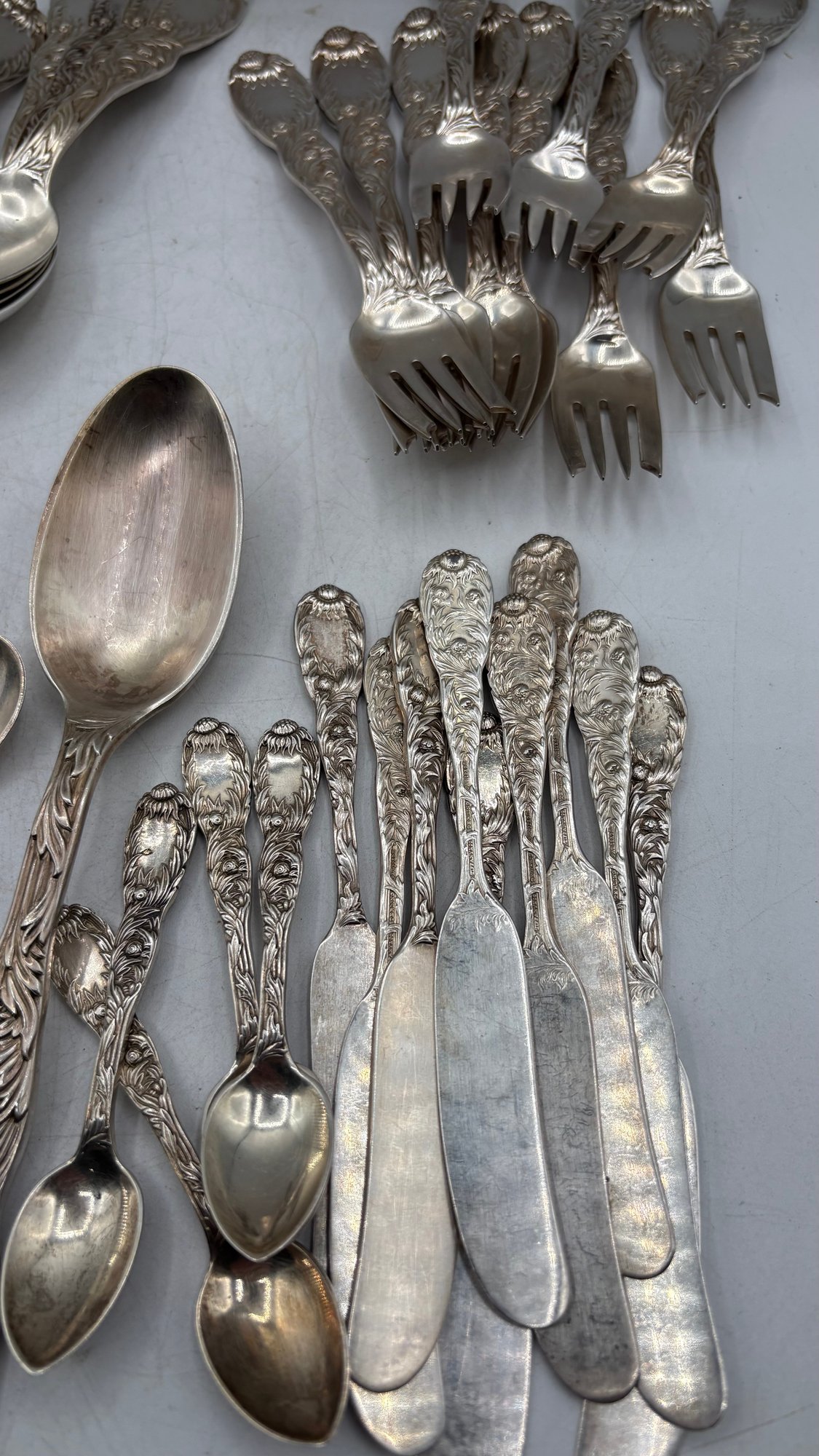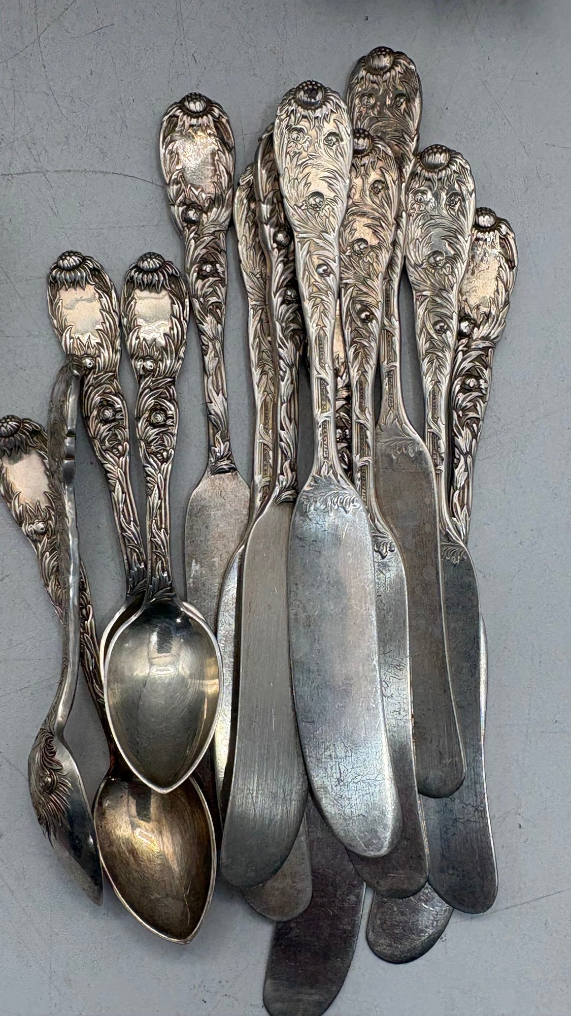 Exquisite Chrysanthemum pattern sterling silver flatware by Tiffany & Co., featuring detailed floral design and exceptional craftsmanship. This comprehensive set includes a wide range of pieces suitable for formal dining, entertaining, or as part of a sterling silver collection. No monogram on any pieces.