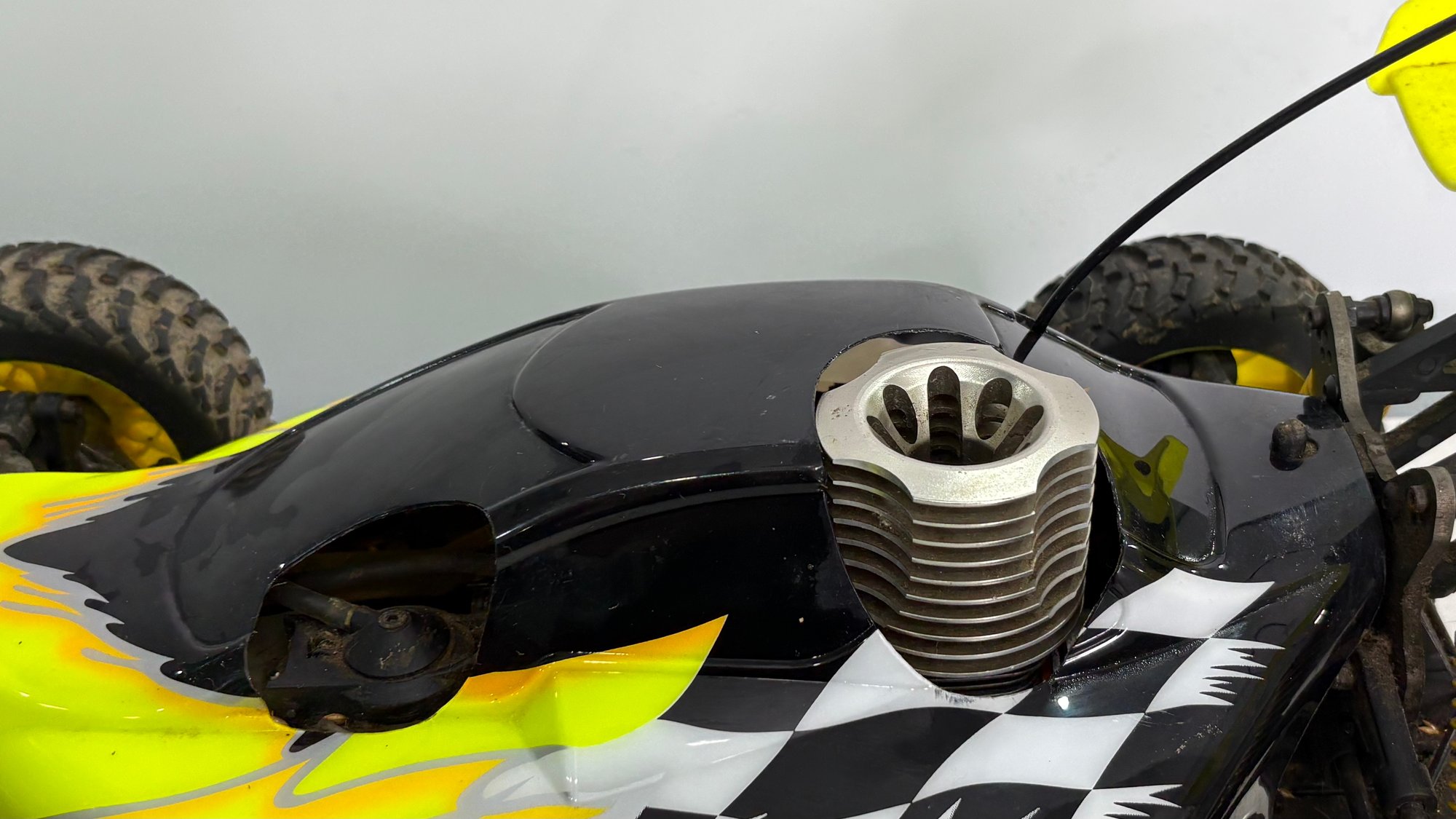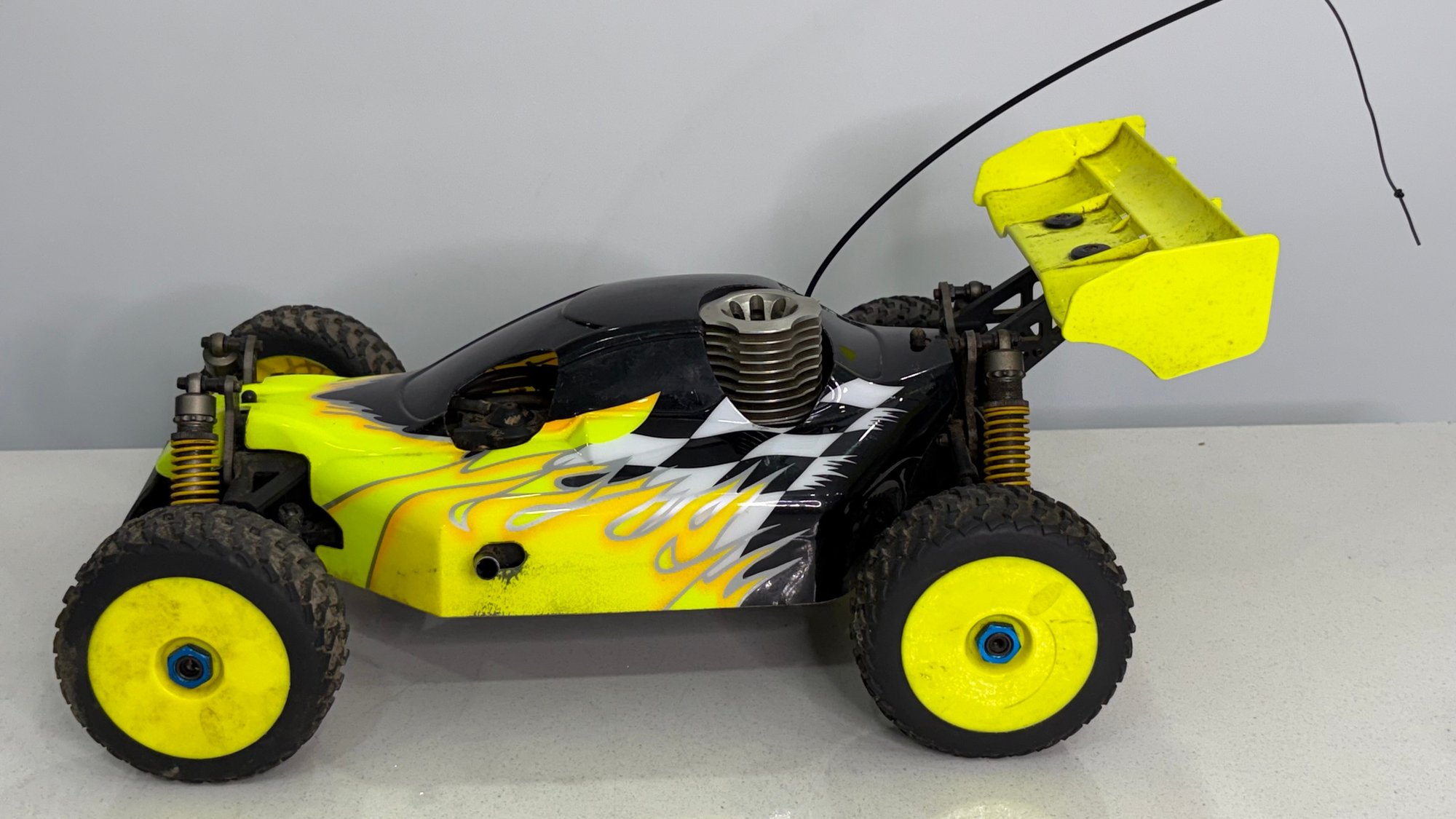 Gas-powered nitro RC off-road buggy featuring an aerodynamic rear wing and off-road tires. Great project car, parts donor, or restoration piece.