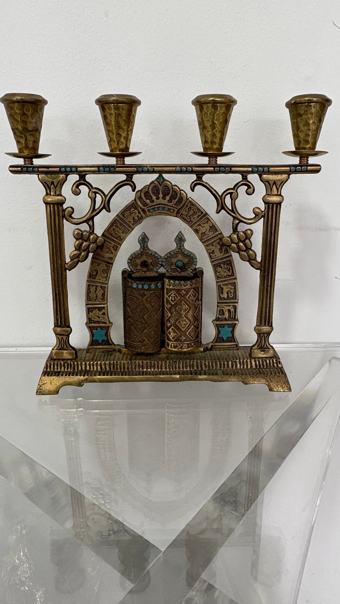 Beautiful vintage Israeli brass Judaica candelabrum featuring ornate cast details, turquoise enamel accents, and a central arched frame with the Ten Commandments tablets. The tablets are housed behind hinged decorative doors and topped with Star of David finials. The arch is decorated with symbolic motifs of the Twelve Tribes, grape clusters, and classic mid-century Israeli design elements. Five hammered brass candle cups across the top. Measures approximately 10 inches tall. Solid, heavy construction with rich patina. A striking Judaica display or collectible piece.