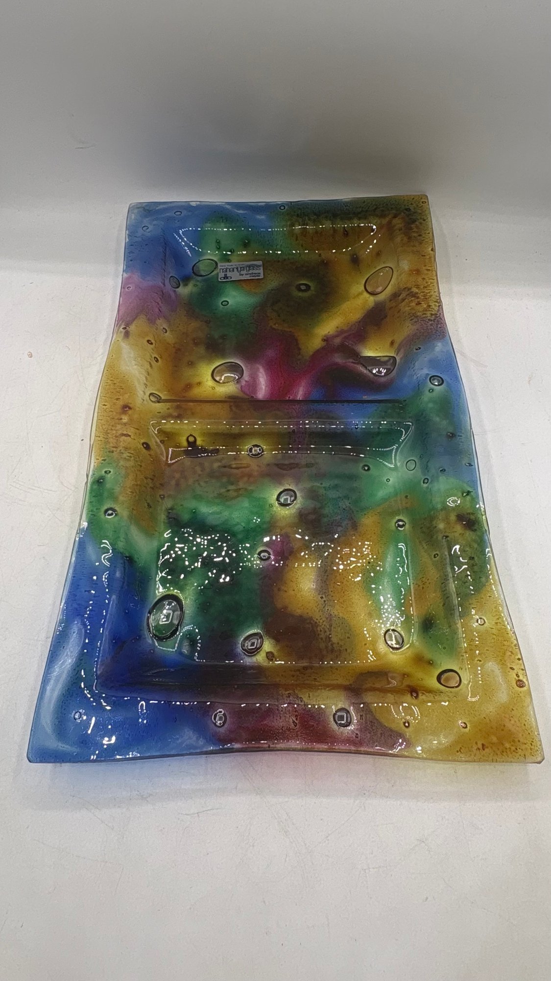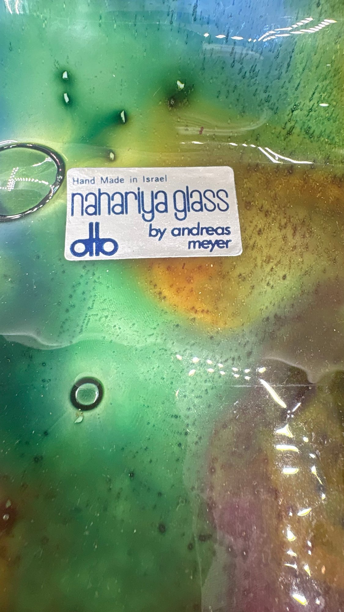 Beautiful vintage handmade glass plate from Nahariya, Israel, crafted by Andreas Meyer. This elegant piece measures approximately 16 1/2" x 9 1/2" and showcases fine craftsmanship and artistry typical of mid-century Israeli glasswork.
