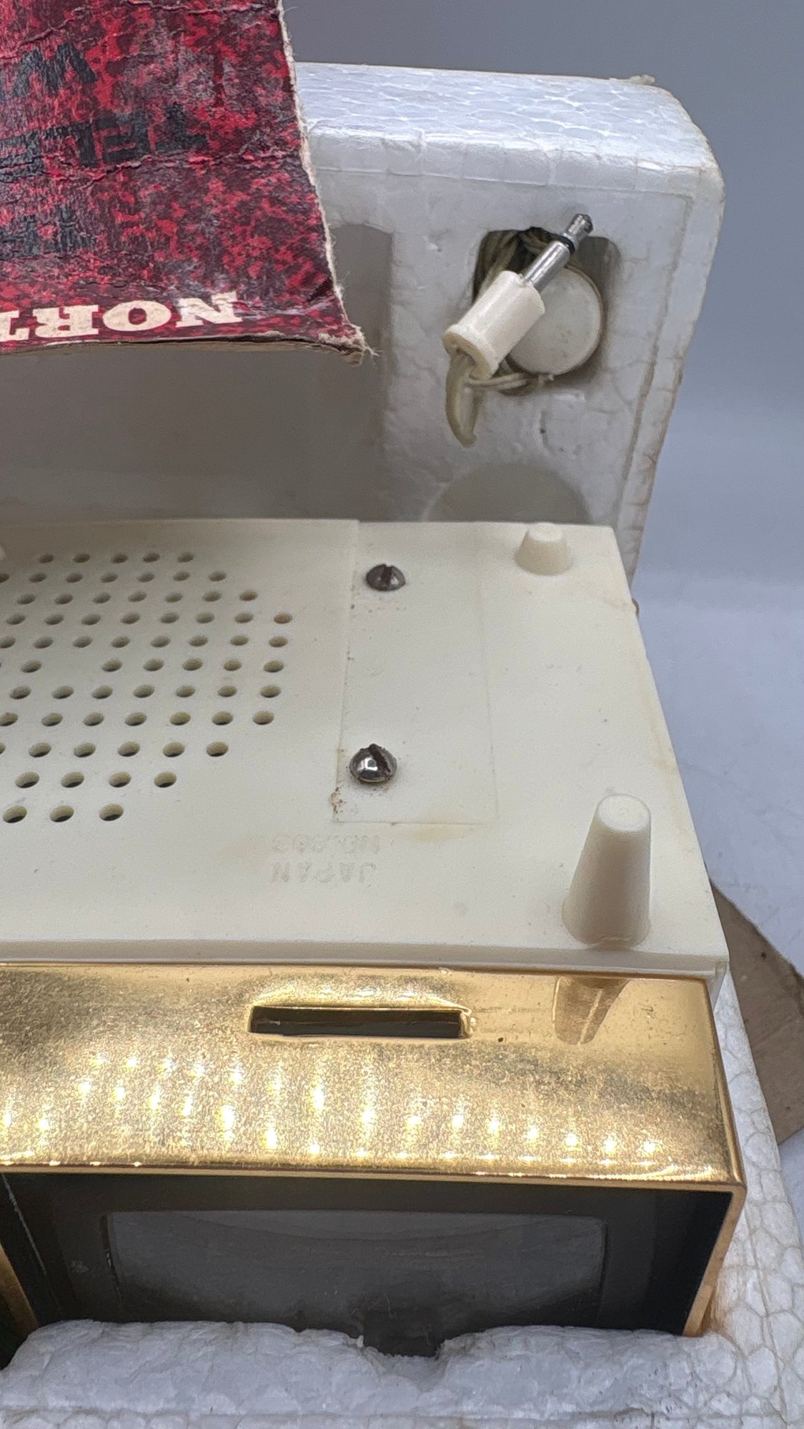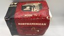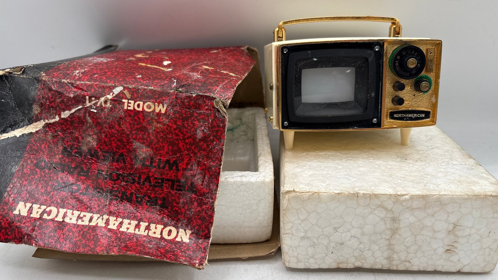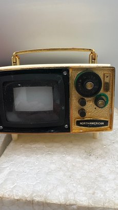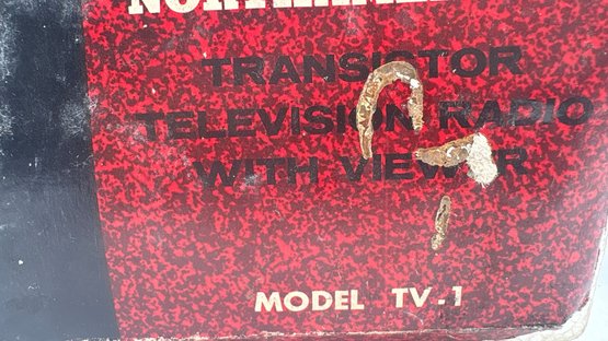 Vintage miniature transistor TV radio, North America Model TV-1, offered in its original box. This novelty transistor radio is designed to resemble a small television set, a popular collectible style from the mid-20th century.