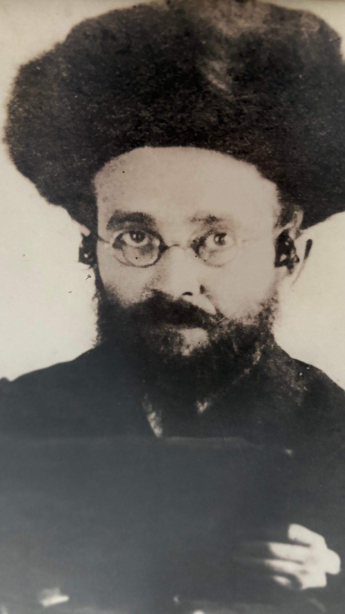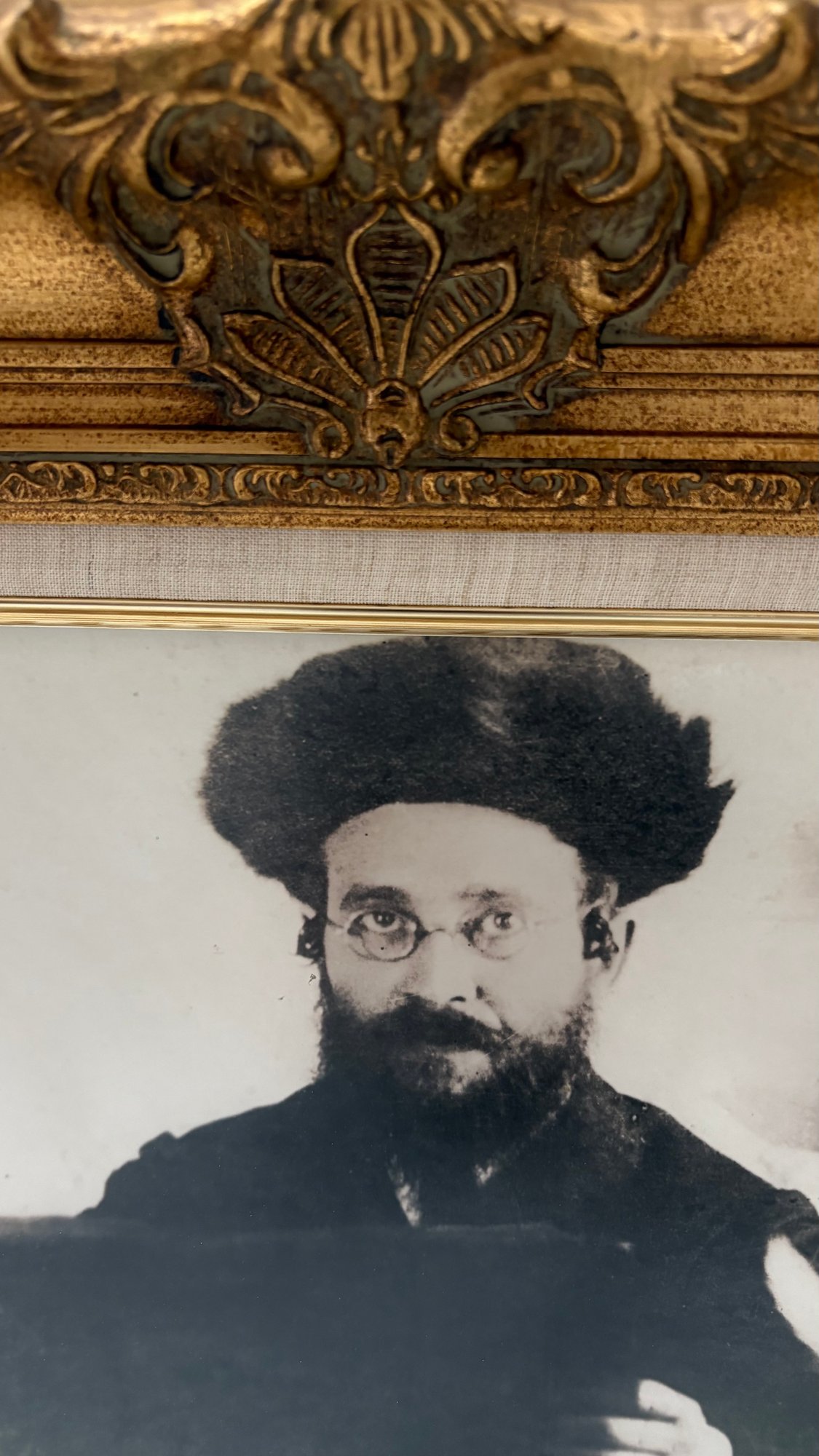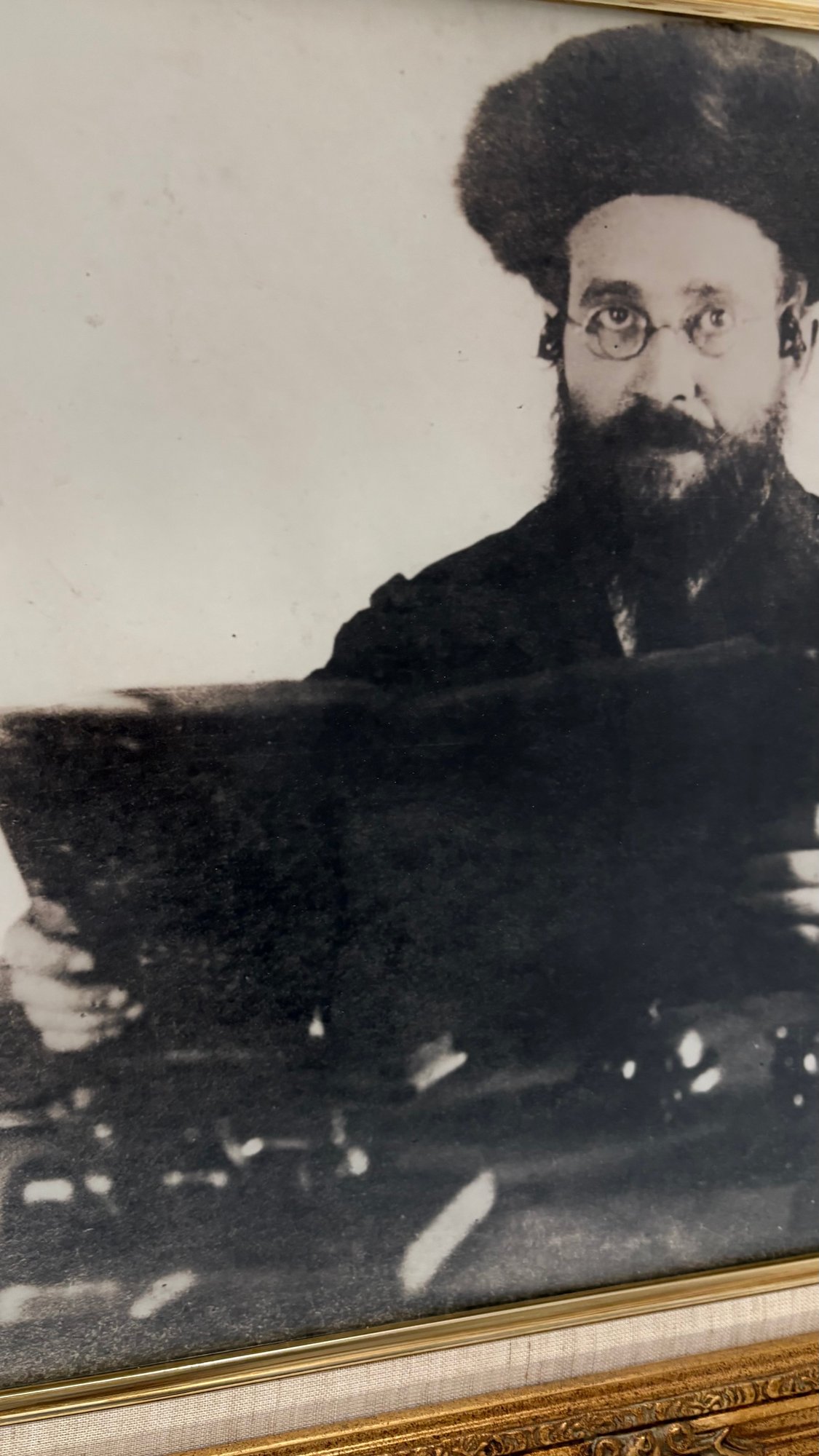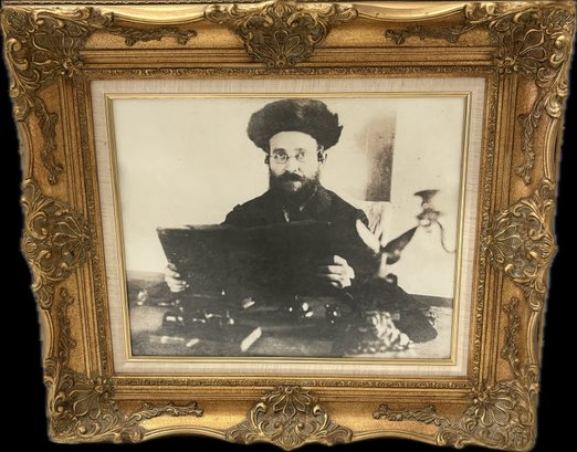 Framed black-and-white portrait of a traditional Jewish rabbi, presented in an ornate gold-tone decorative frame. The image appears to be a later reproduction of an earlier photograph, giving it a vintage aesthetic.