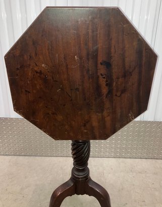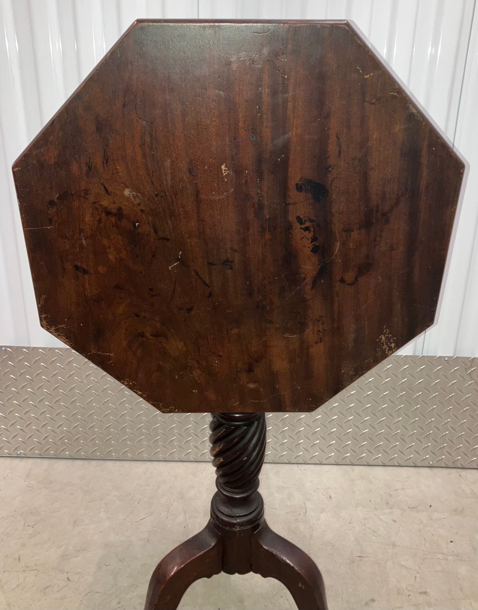 18th Century mahogany tilt top table. Dimensions are: 39” tall x 27 x 20 1/2. Fair condition.