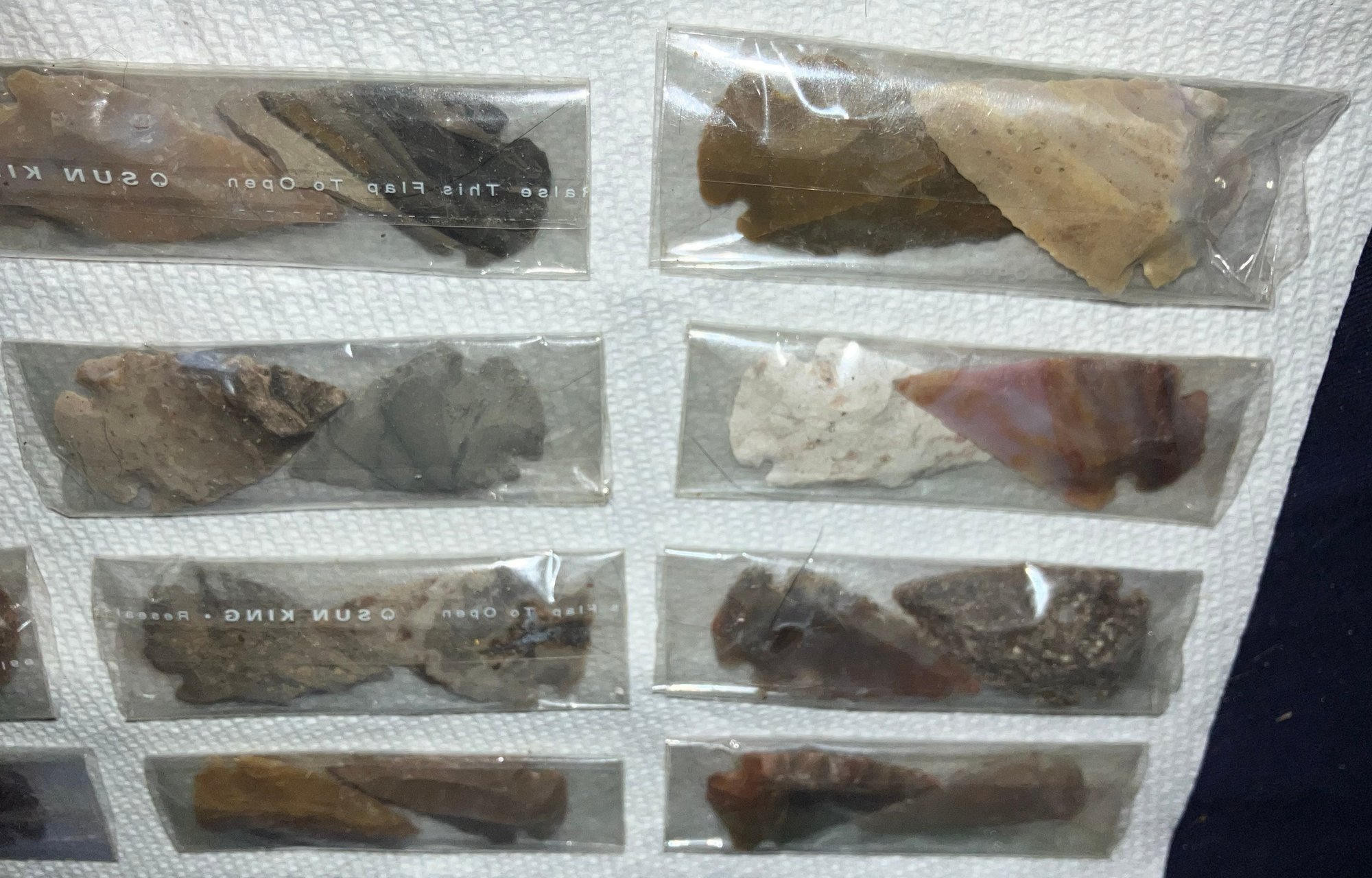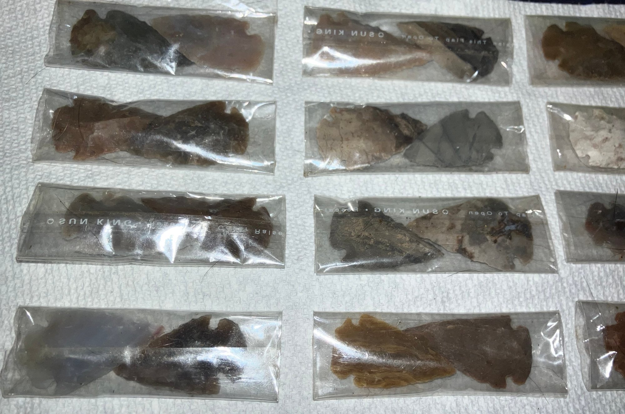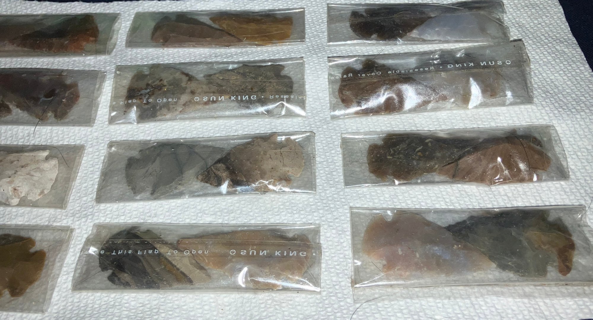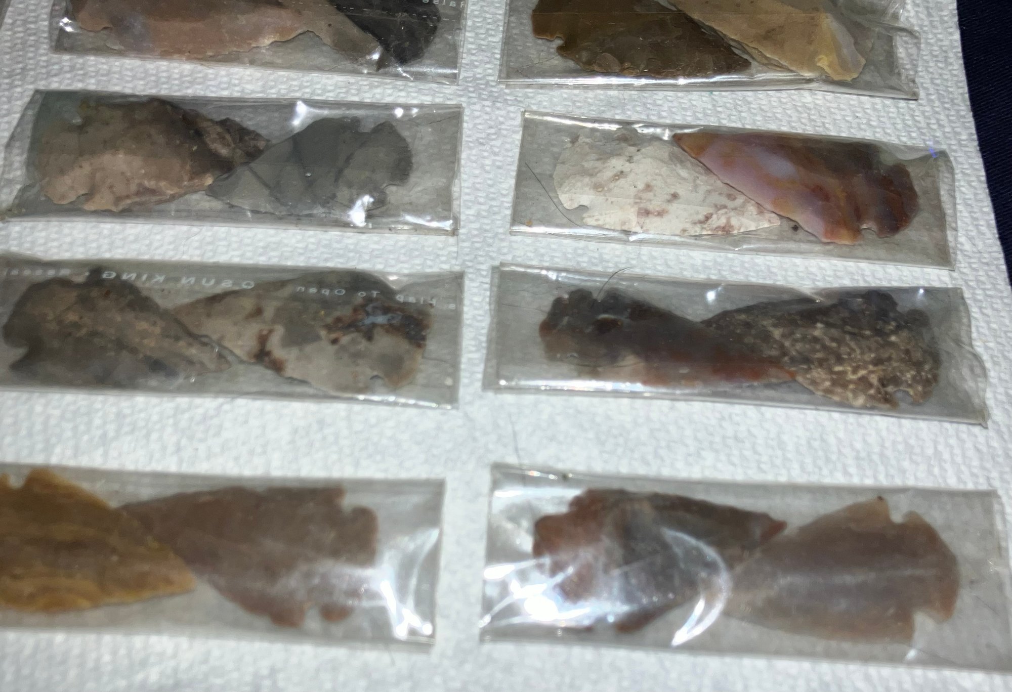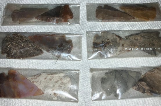 These are not authentic Native American arrowheads. These are reproductions and made from various decorative colors of chirt and quartzite.
