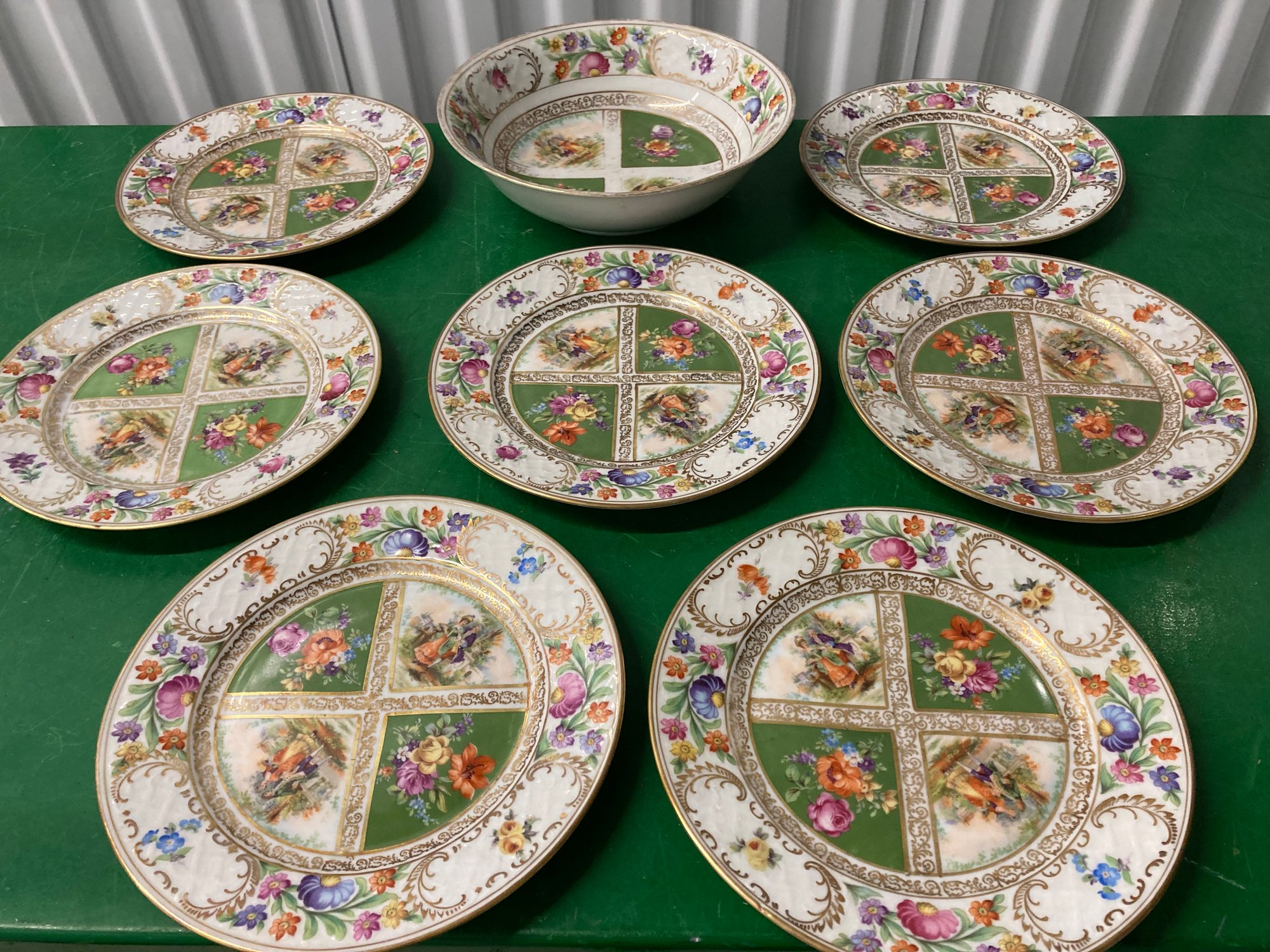 8 Pc Dresden Schumann Bavaria Plates & Bowl. No chips. Plate dimensions are: 8 1/4” round. The bowl dimensions are: 2 1/2” tall x 9” round. Good condition.