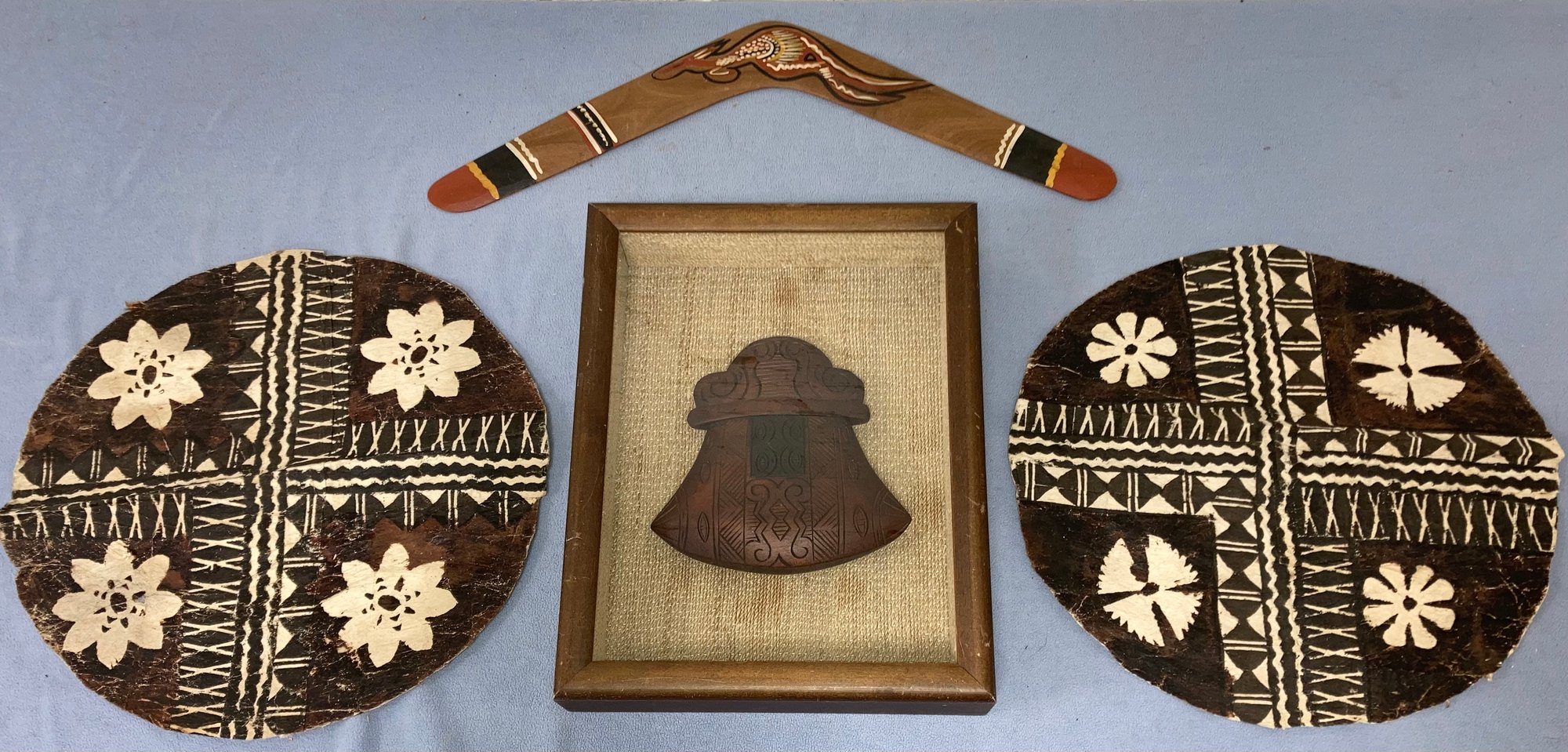 African Bark Cloths, A Boomerang And One Indigenous Item. There’s a carved wooden piece with a checkered design, a boomerang and two African bark cloths. Boomerang dimensions: 21 3/4” long x 2 3/4” wide, two African bark cloths dimensions: 15 1/2” round, carving case dimensions: 14 1/2” tall x 11 1/2” wide x 2 3/4” deep and the carving dimensions are: 7 1/4” tall x 7 1/4” wide. Condition: See photos.