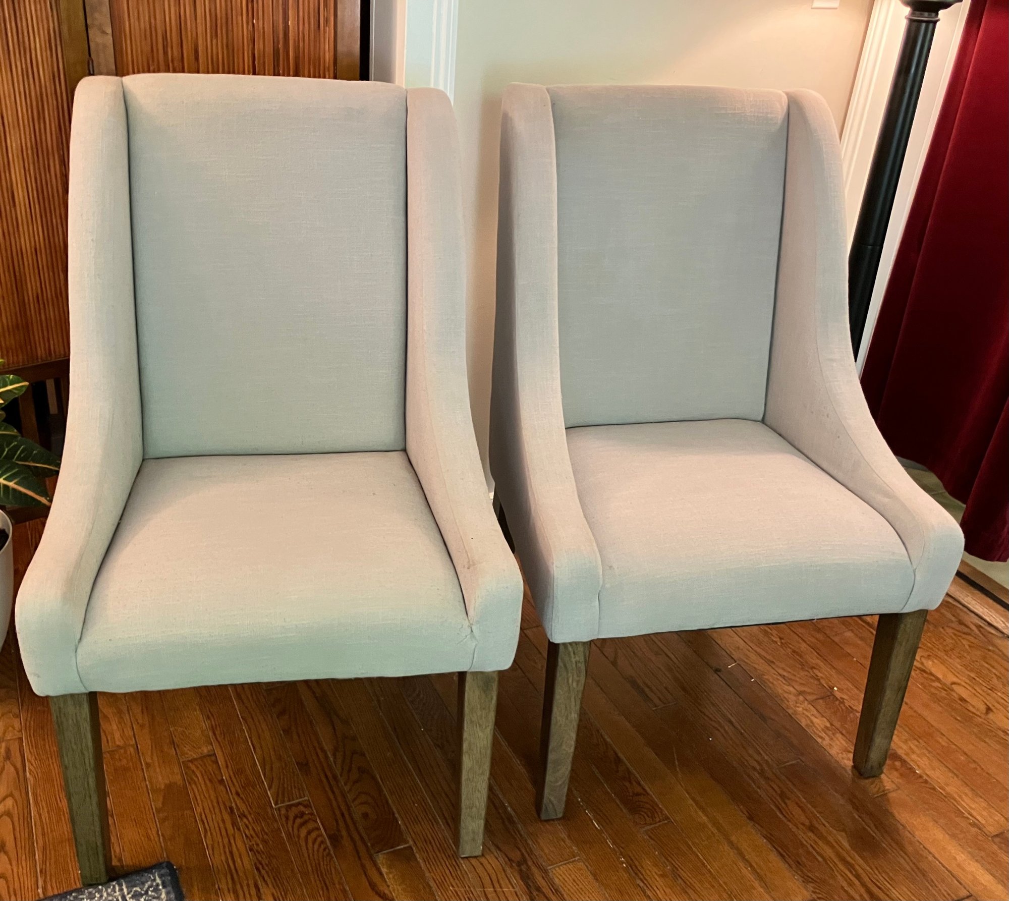 Pair of sitting chairs. Dimensions: 40 1/4” tall x 25 1/4” wide x 23” deep. Good condition.